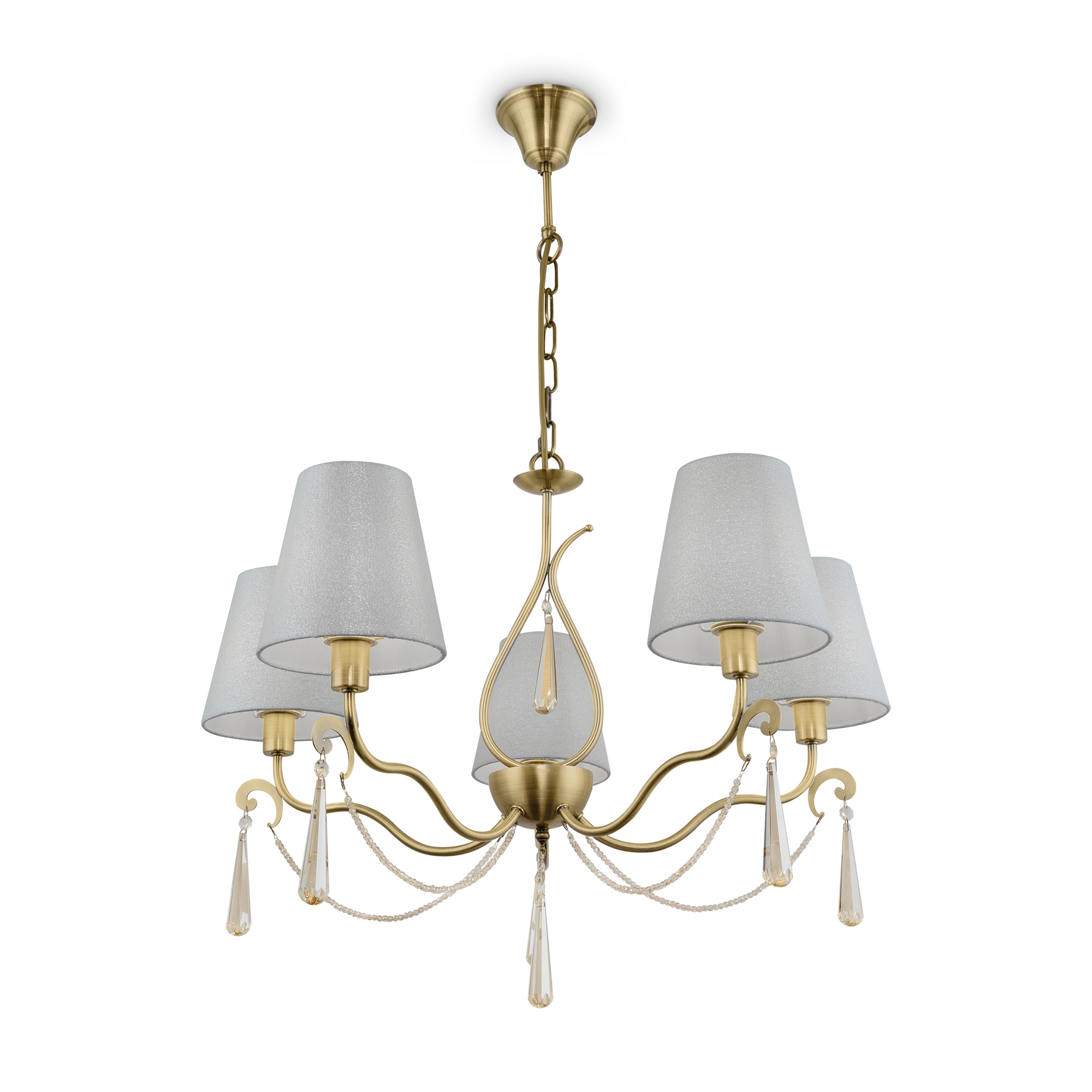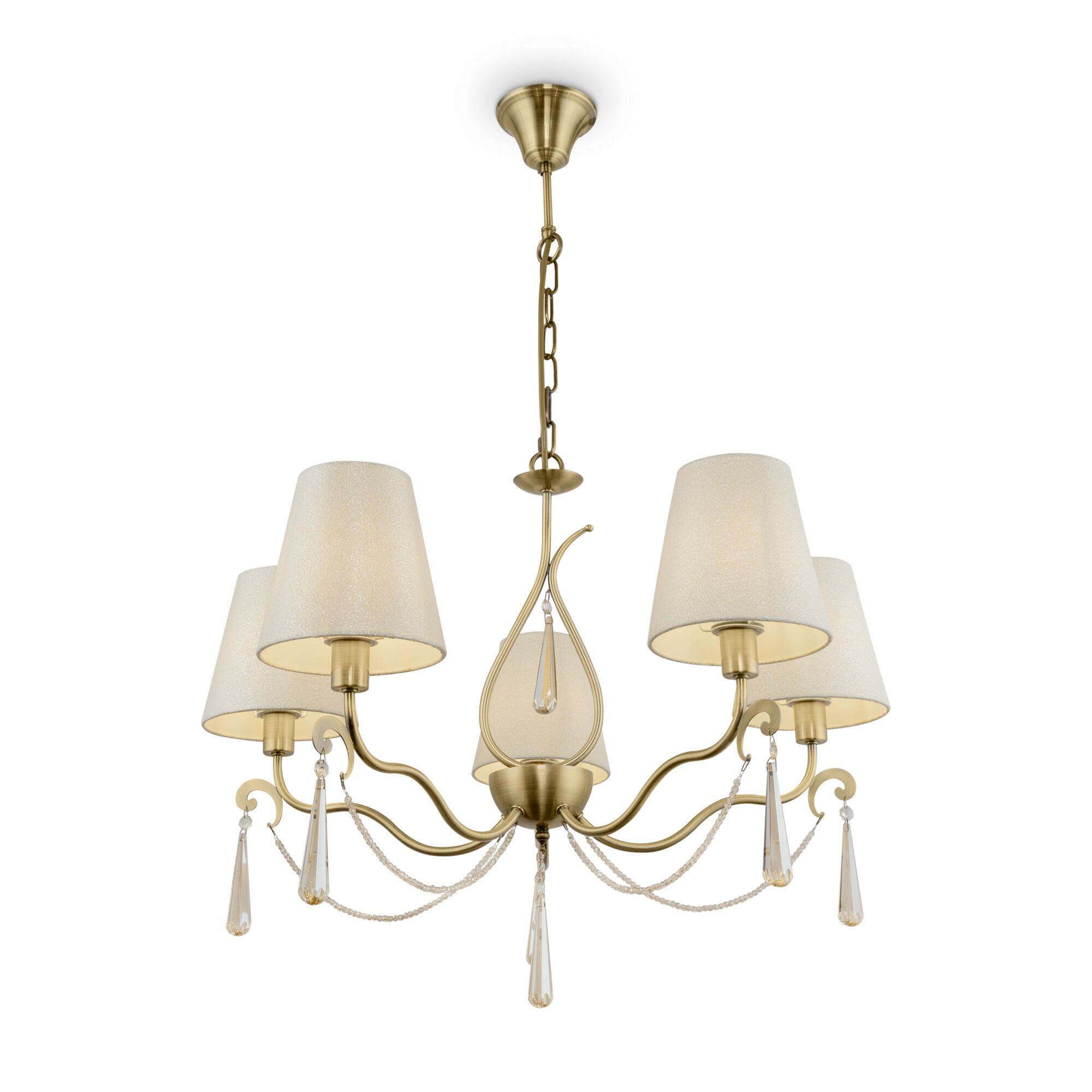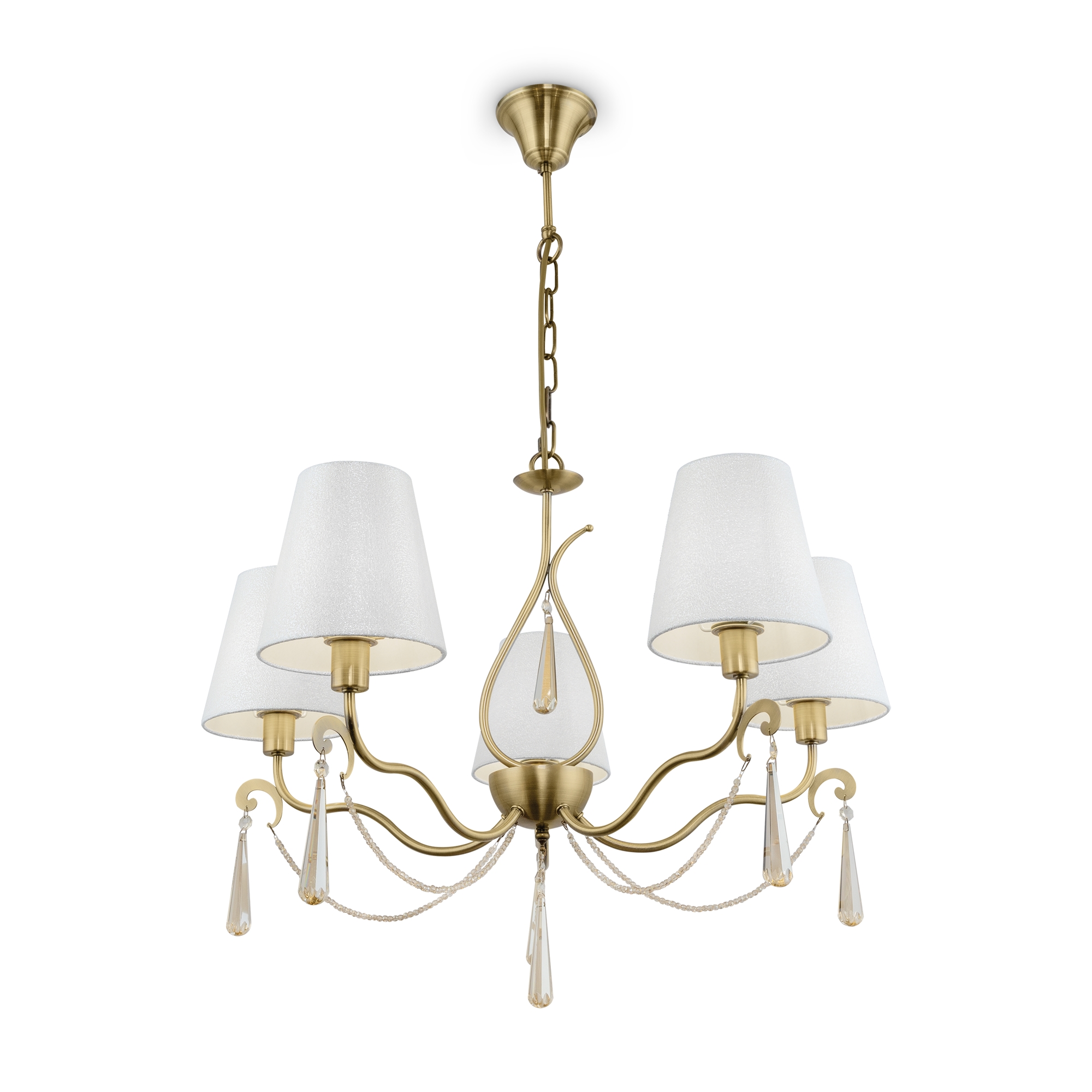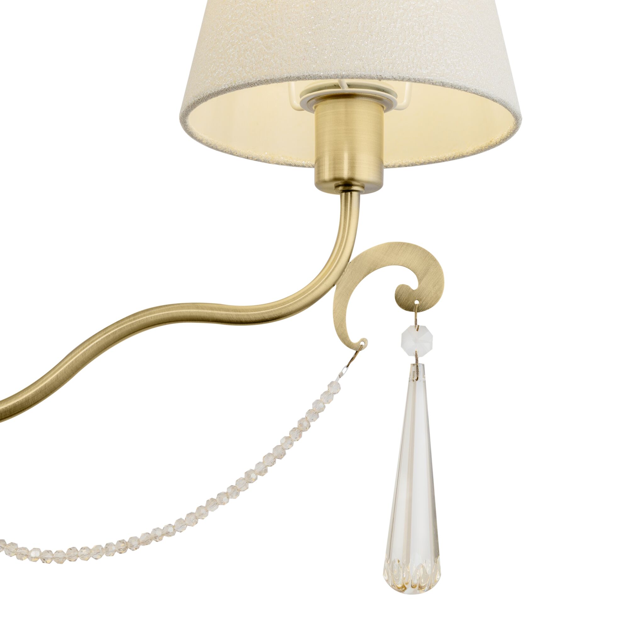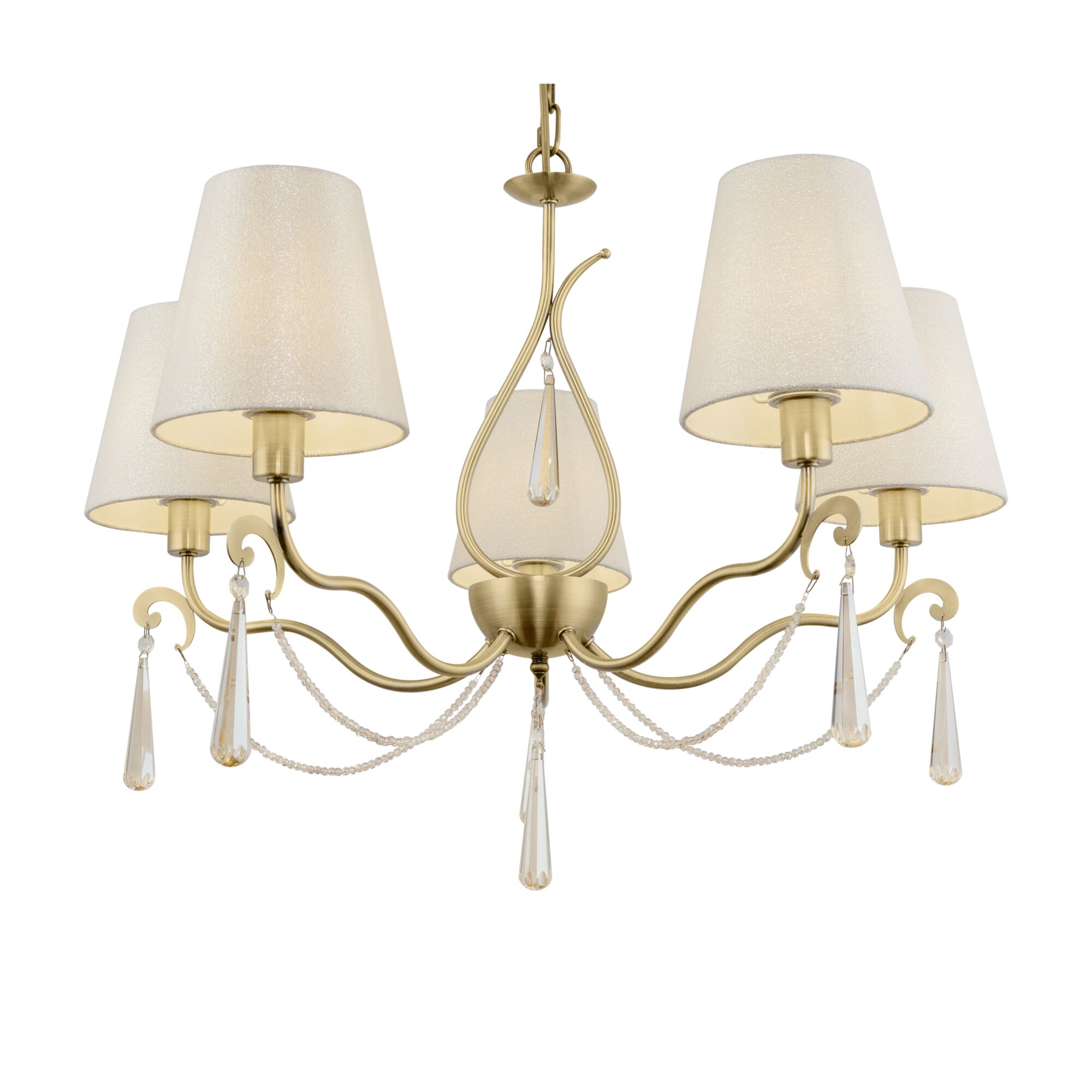 Металлическая арматура. Цвет – латунь. Абажуры из фактурной ткани белого цвета. Декор – хрустальные подвесы каплевидной формы. Одиночный подвес и торшер с цоколем Е27, лампа, бра и люстры – Е14.