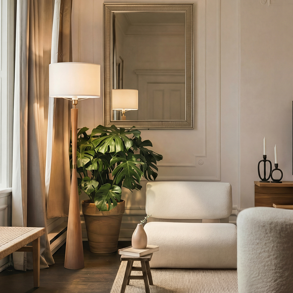 Арматура — металл. Деревянное разборное основание. Тканевый абажур белого цвета. Источник света — лампа E27 (не в комплекте).