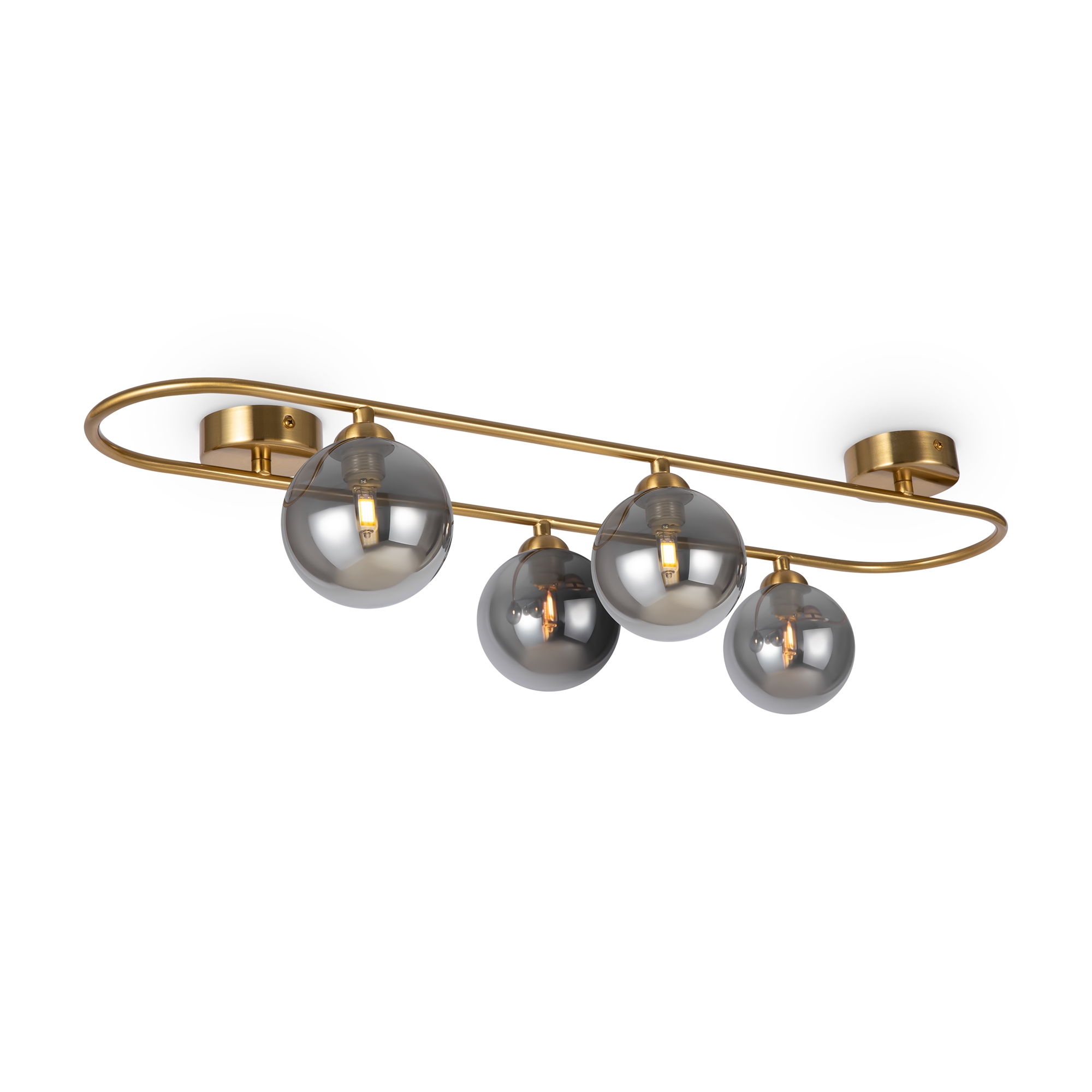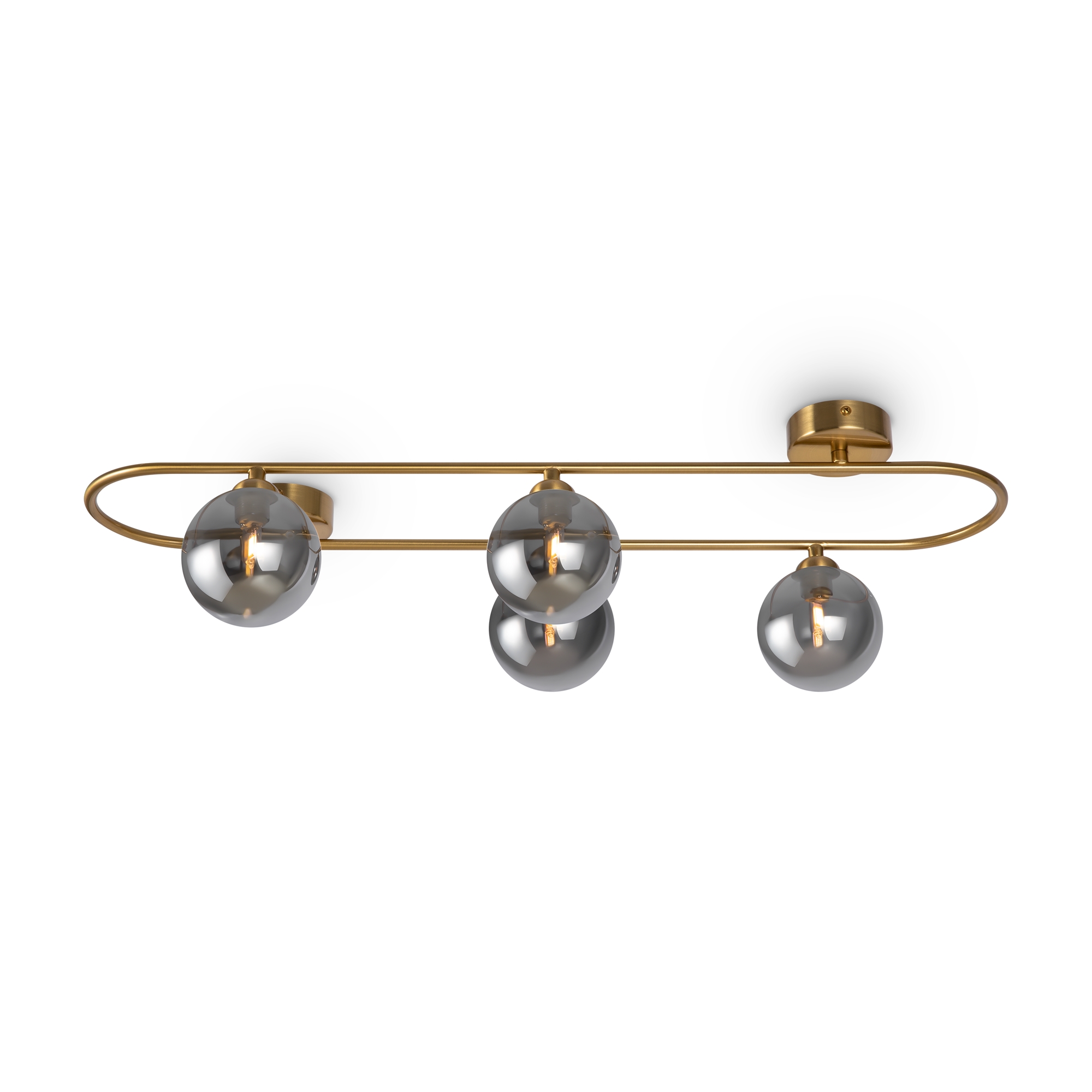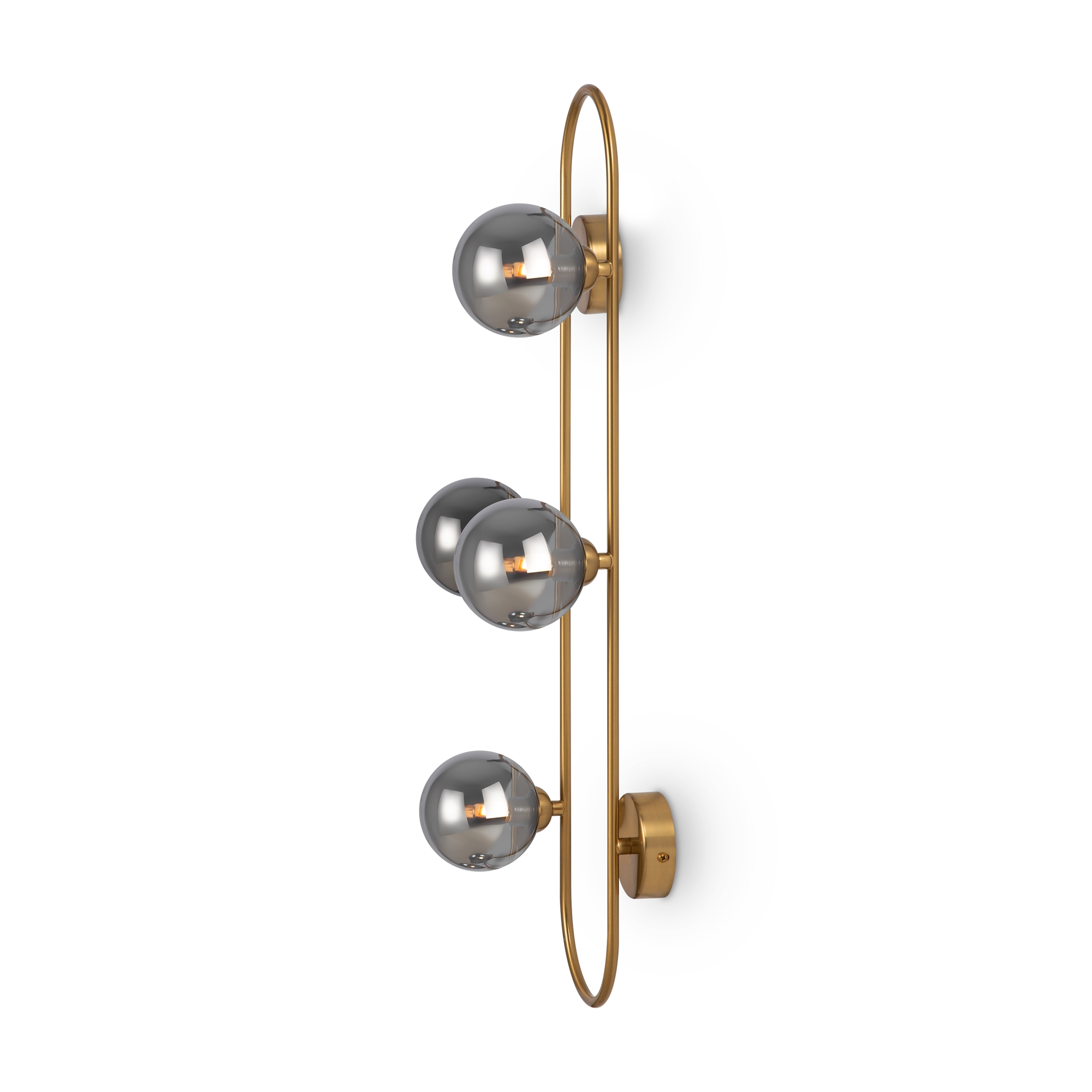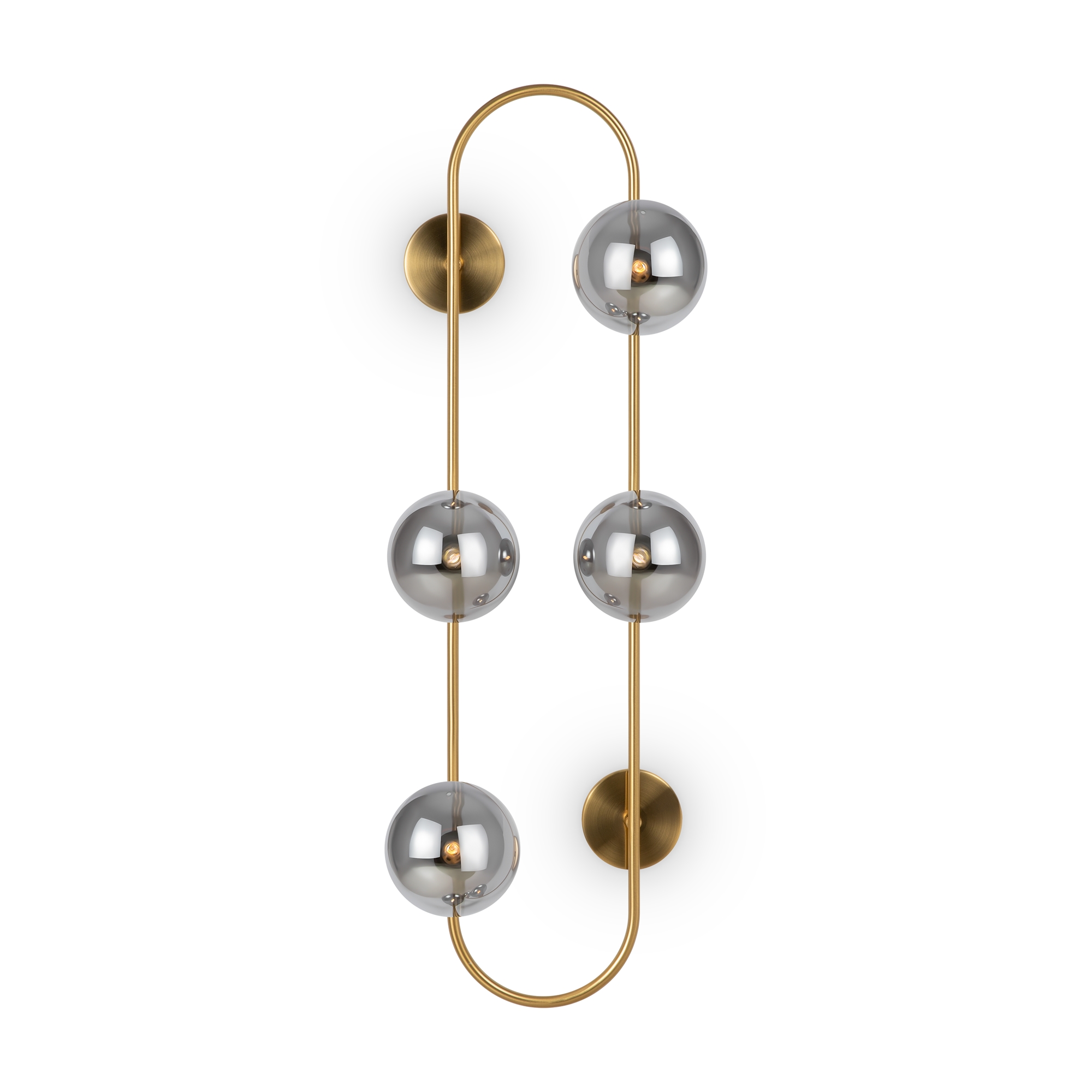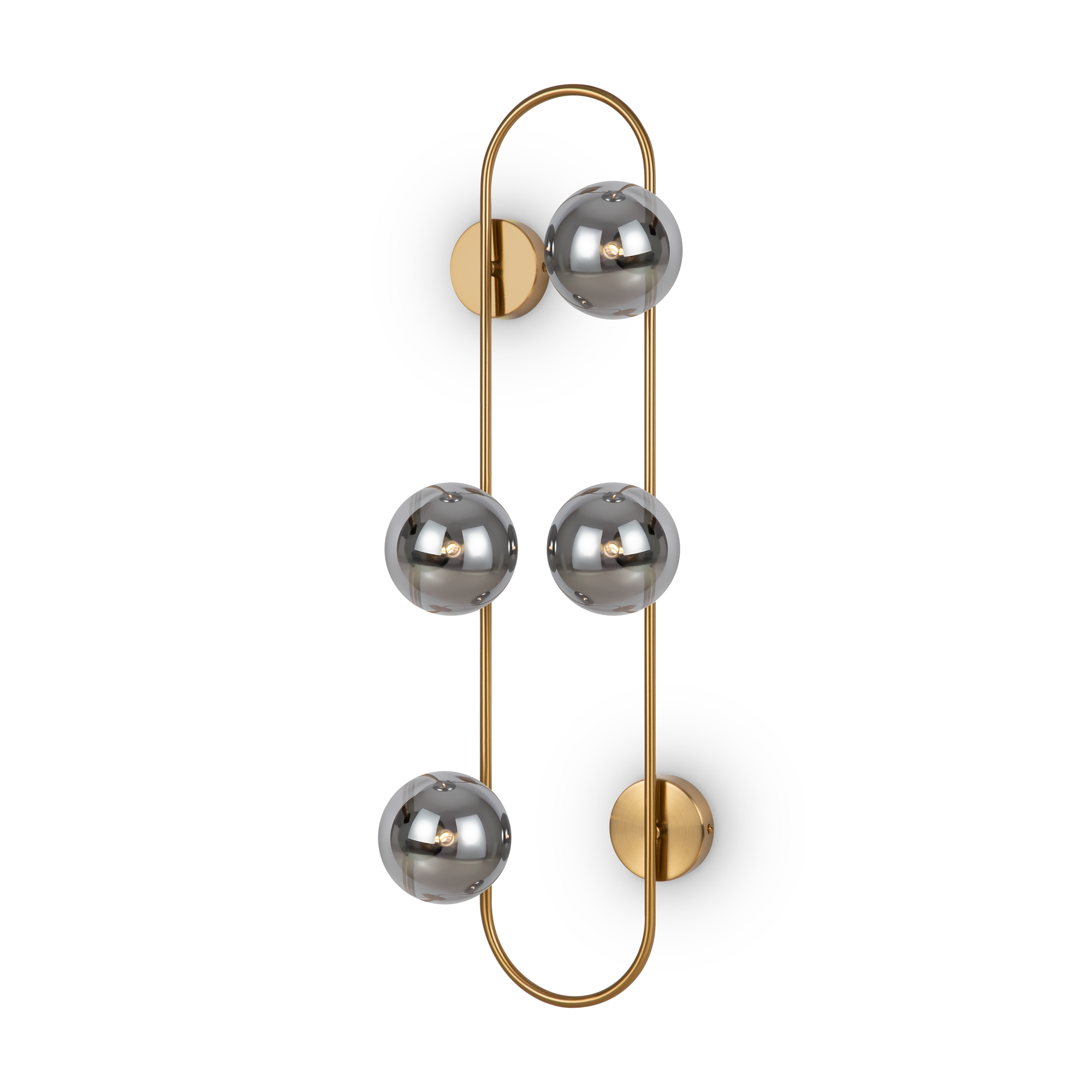 Арматура — металл, цвет — латунь. Стеклянные плафоны-сферы в двух оттенках белый матовый и дымчатый в настенно потолочной версии. Округлые и плавные линии — беспроигрышное сочетание для современных интерьеров. Настенные бра можно использовать как для общего на потолке так и для зонального настенного освещения Источник света — лампа с цоколем G9.