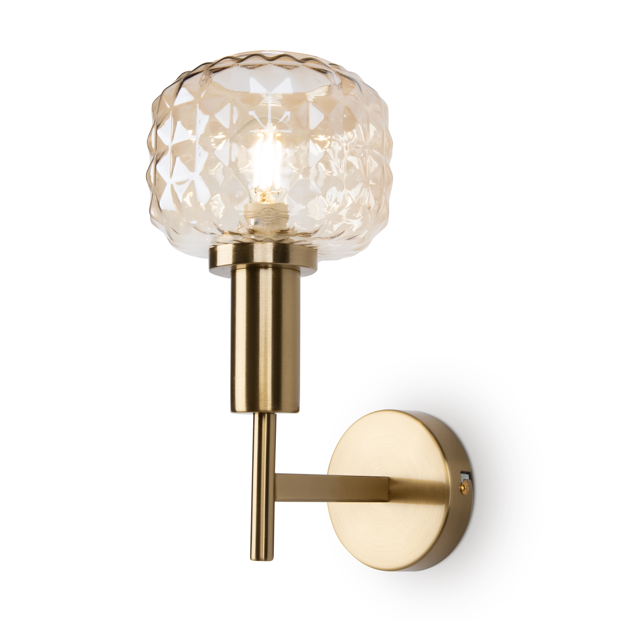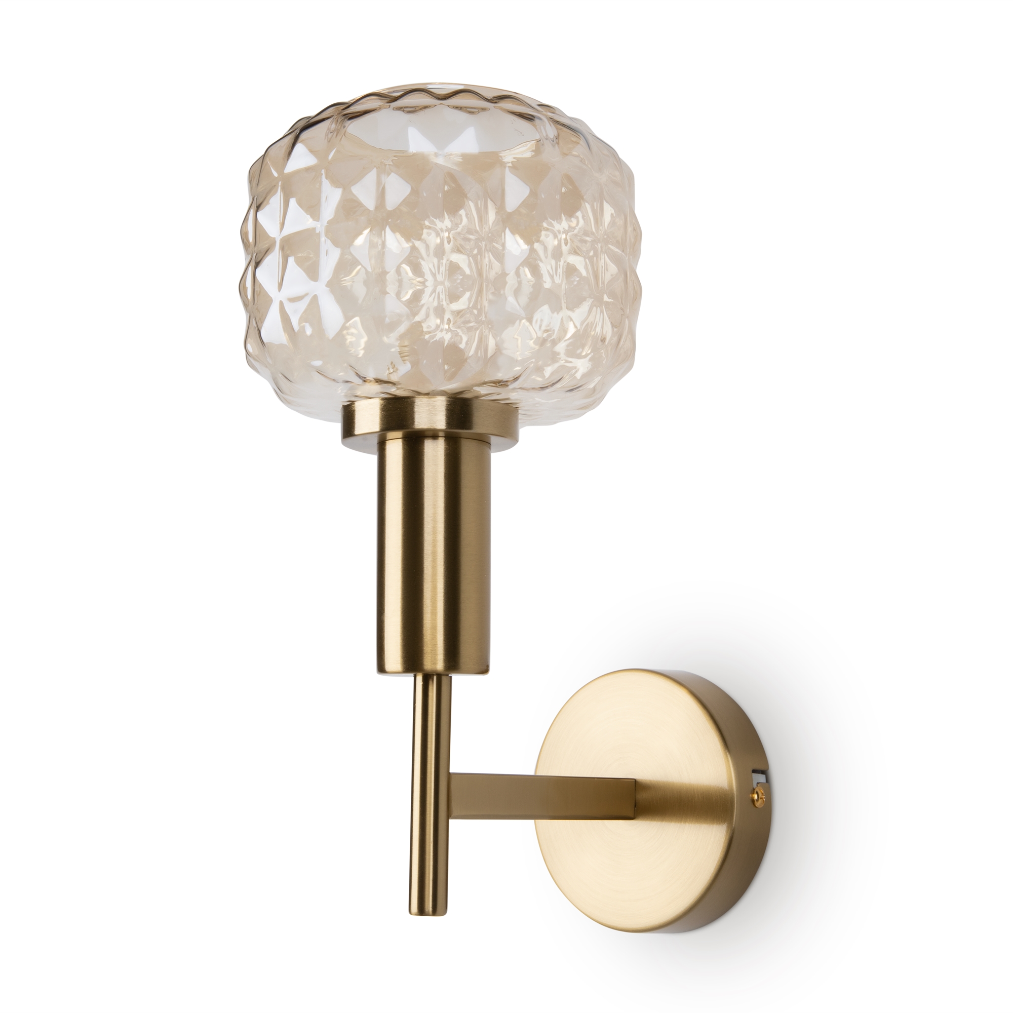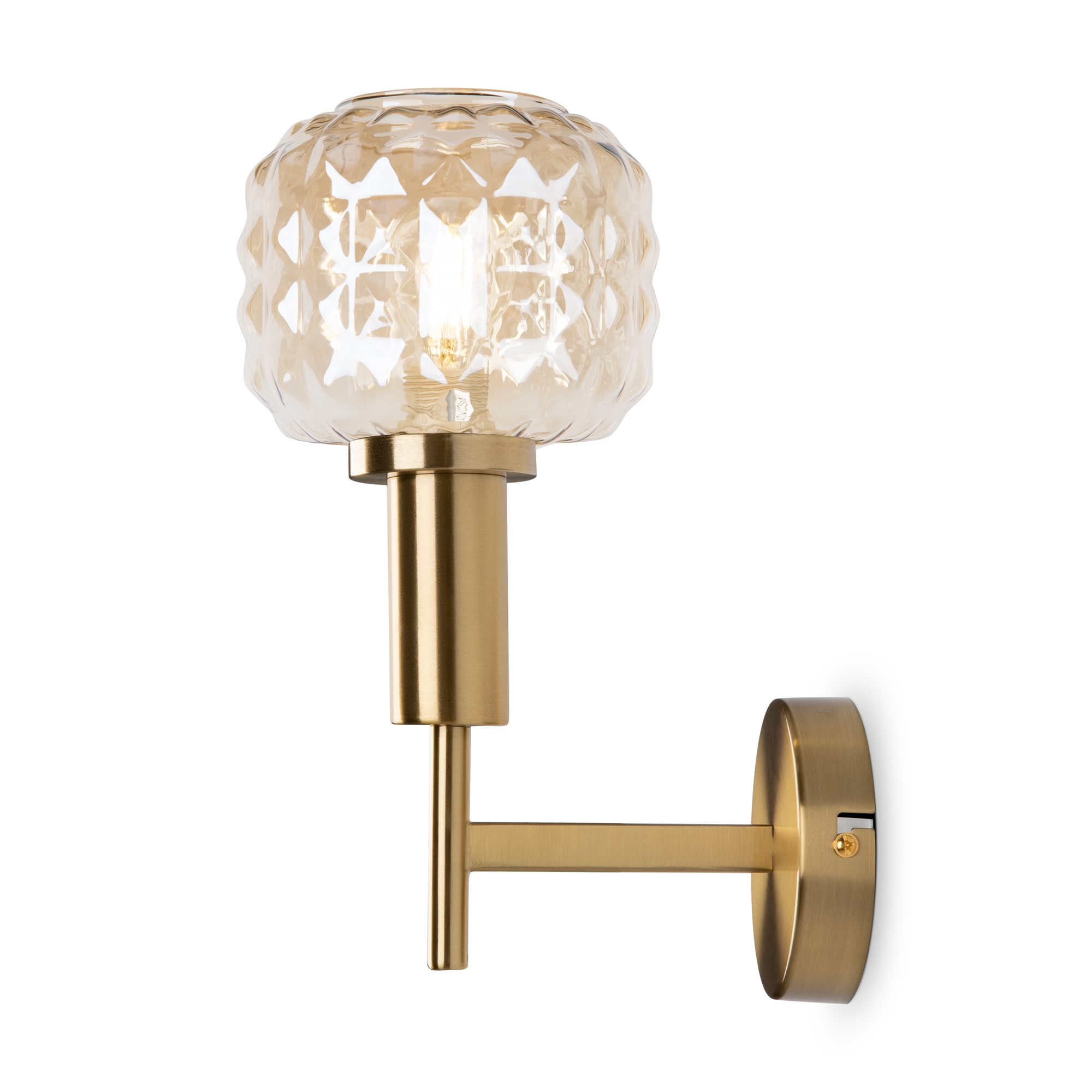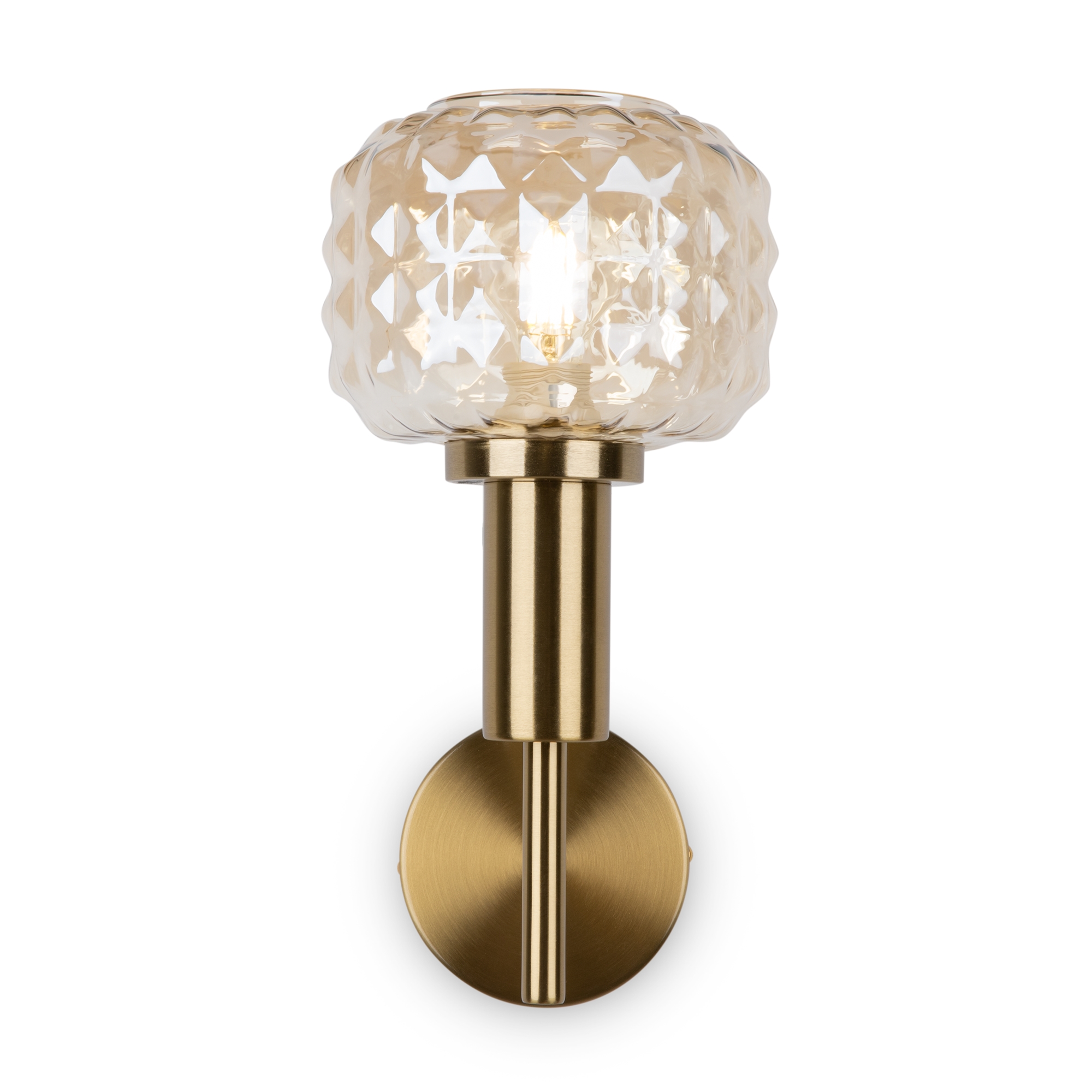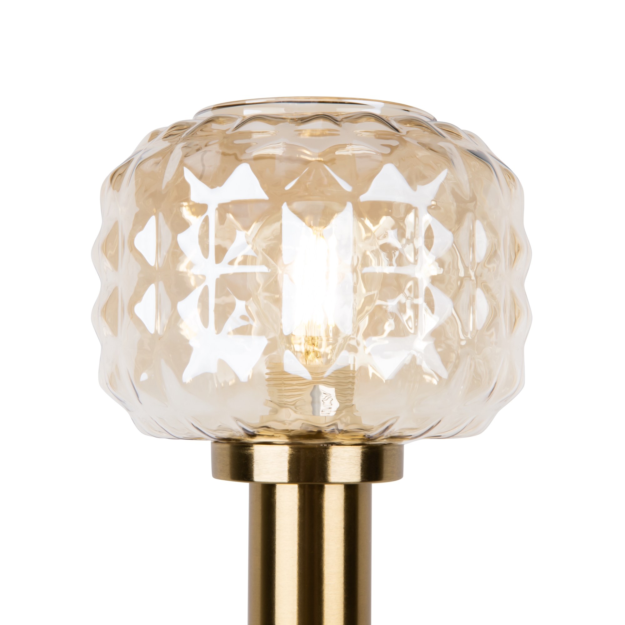 Металлическая арматура в цвете латунь. Плафоны из толстого рельефного стекла в оттенке амбра с «шипованной» огранкой. Подвесные модели регулируется по высоте. Источник света — лампа с цоколем Е14