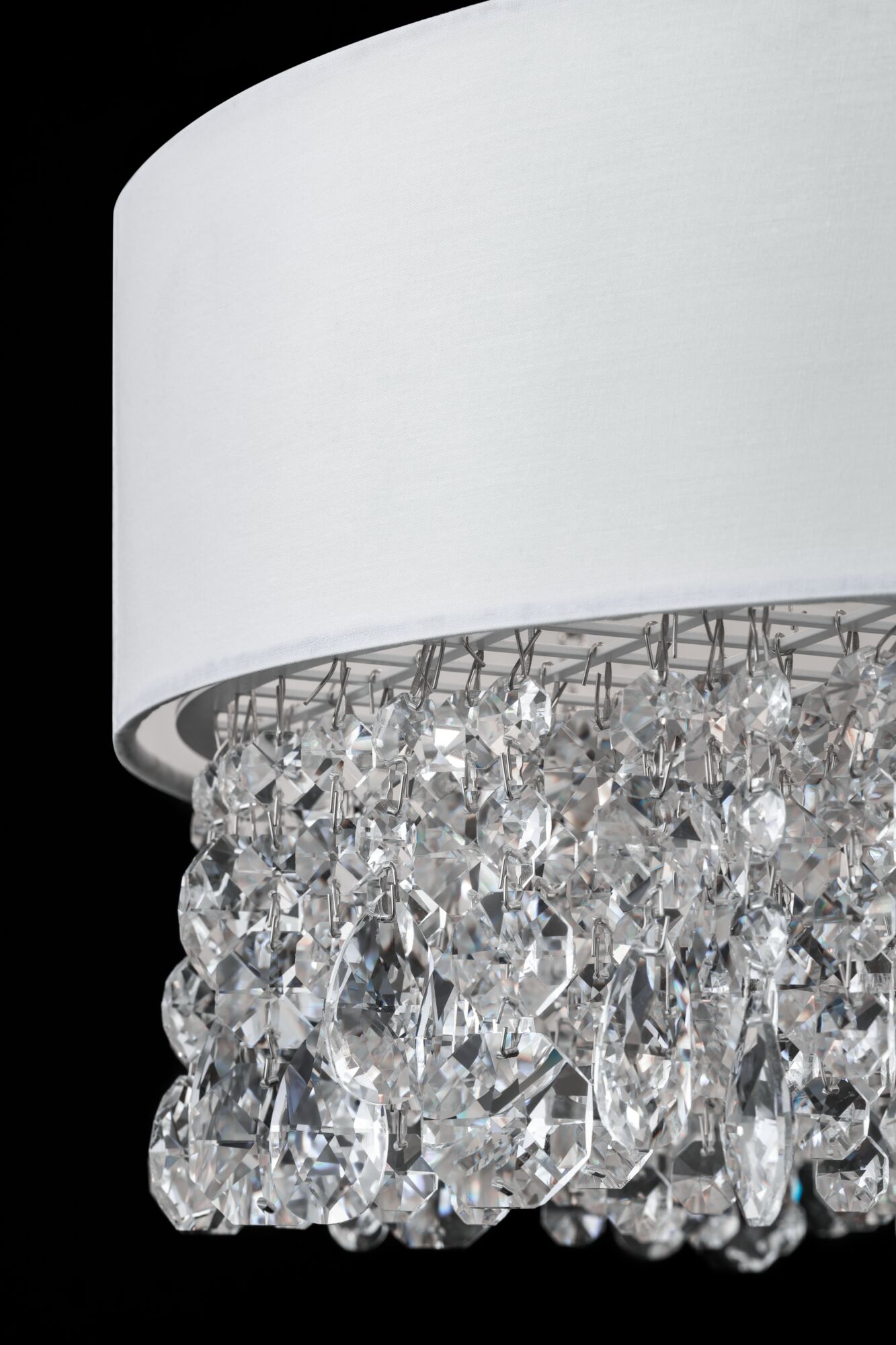 Металлическая арматура в белом цвете. Абажур – ткань, нанесенная на ПВХ, цвет – белый. Декор – подвески в виде граненых кристаллов. Высота подвесных светильников регулируется тросом.