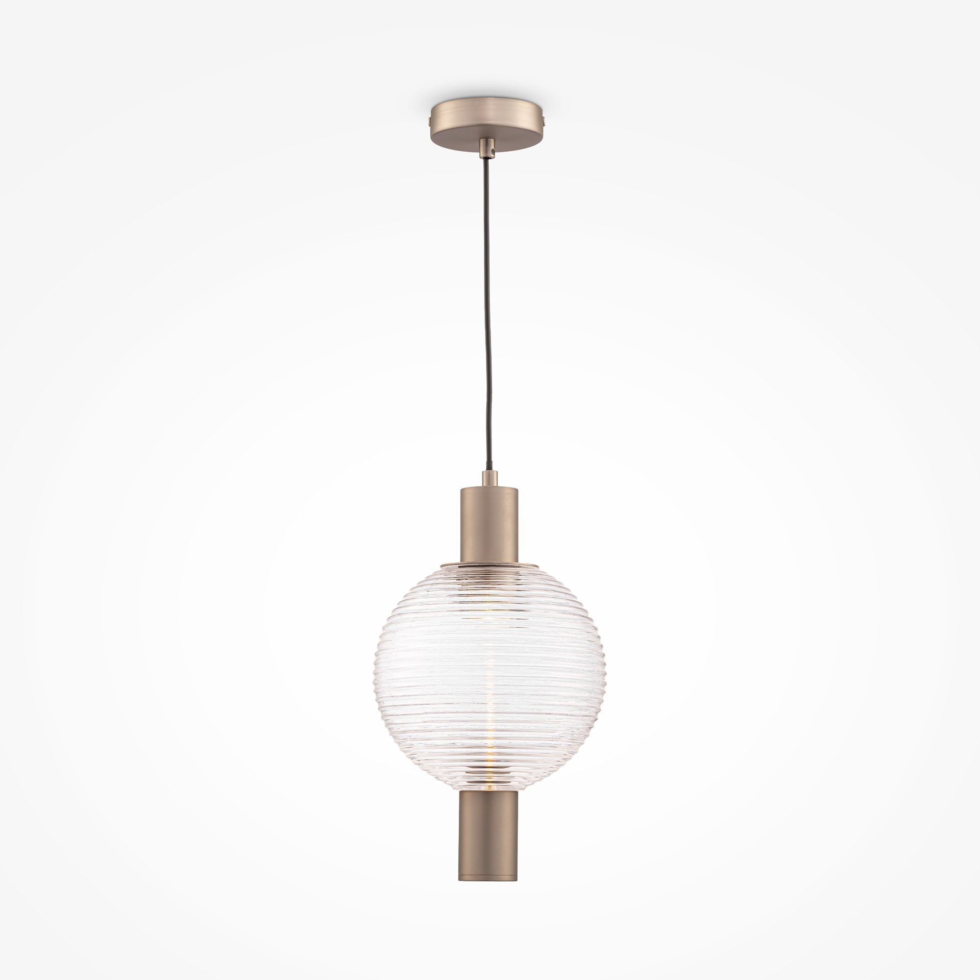 Арматура из металла, оттенки – никель, латунь, матовый черный. Плафон-сфера из прозрачного стекла с рельефным рисунком. Источник света установлен в металлическом корпусе сверху. Регулируемая высо