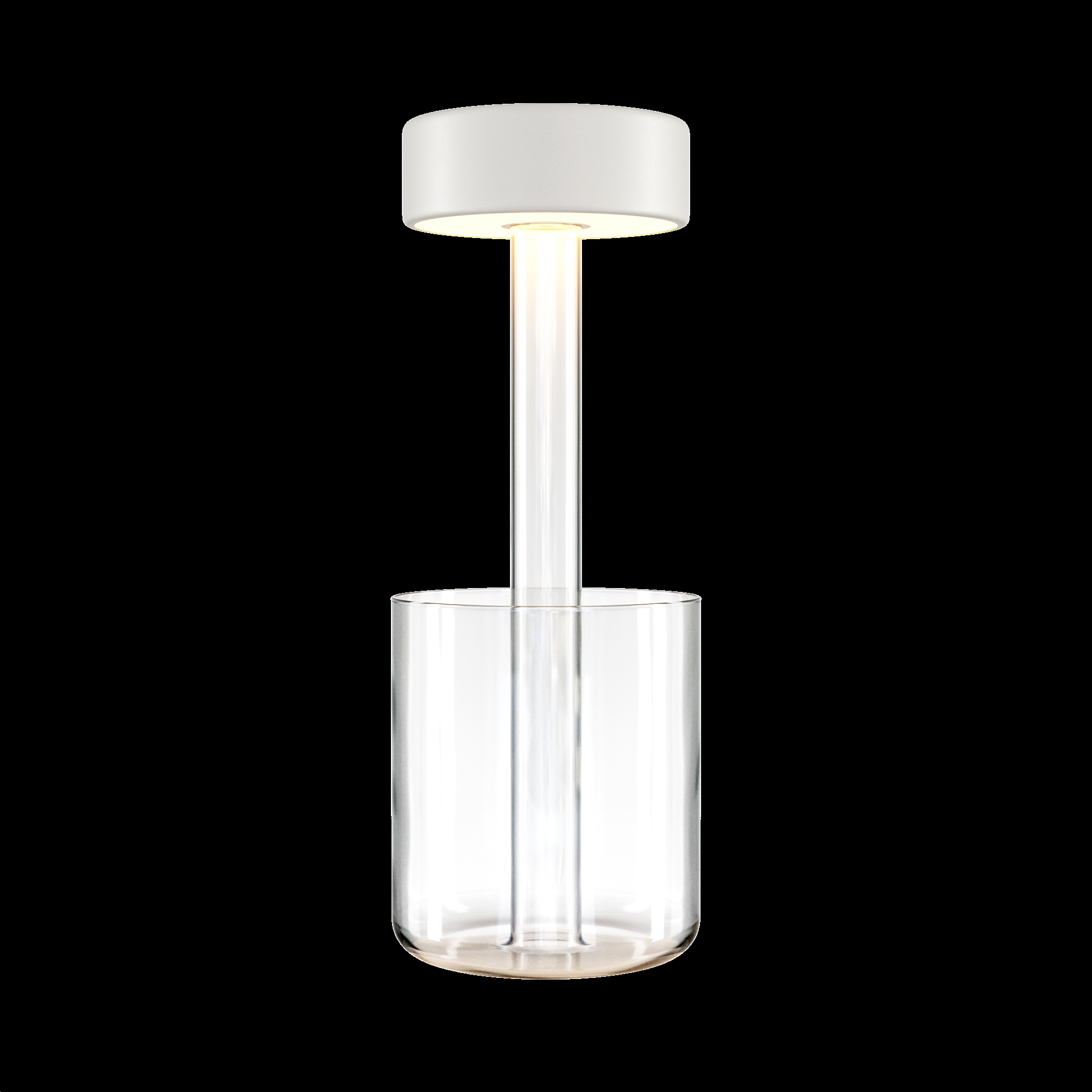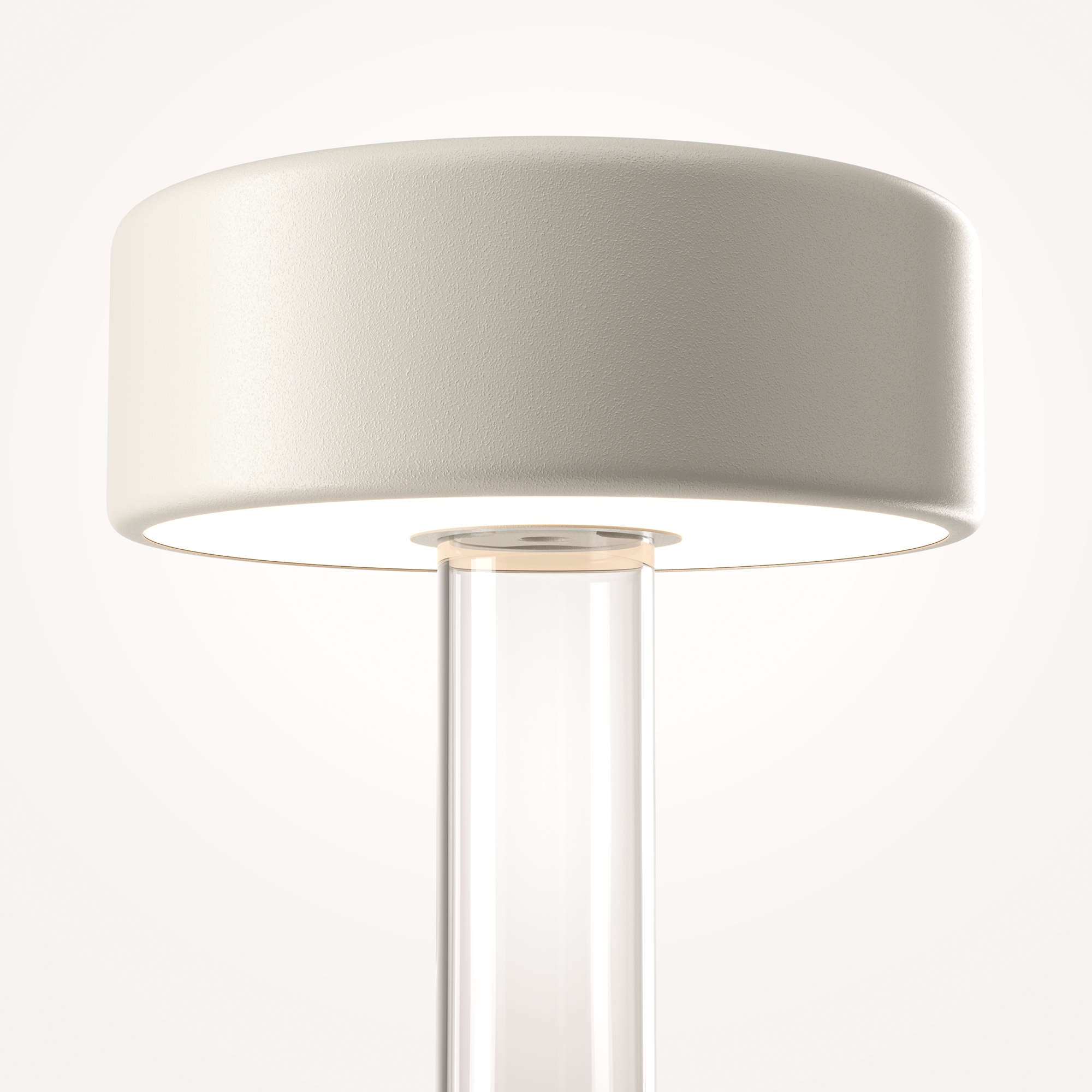 Портативный настольный светильник. Результат творческой коллаборации искусственного интелекта и предметного дизайнера. Два варанта корпуса светильника: с металлической тонкой ножкой на плоском круглом основании; со стеклянным основанием с интегрированным в него вазой. Плафон снимается с основания для удобного ухода за стеклянными элементами и подзарядки аккумулятора, расположенного в плафоне. Два варианта цвета стеклянных моделей — прозрачный и серый. Плафоны с рассеивателем из акрила в 3х цветах: черный, золотой, белый. Удобный сенсорный выключатель вверху плафона. Micro USB разъем для подзарядки скрыт в нижней части плафона. LED-источник света. Регулируемая цветовая температура от 2200К до 4000К.