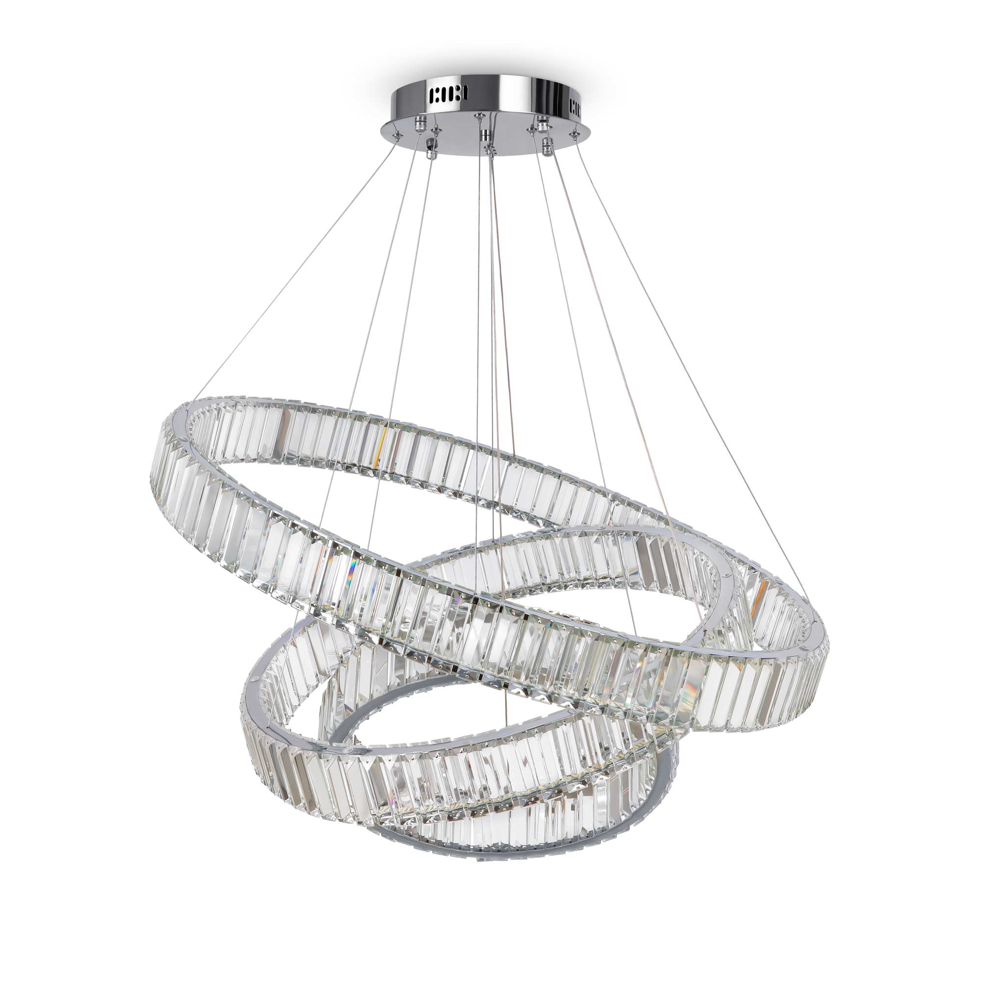 Металлическая арматура в цвете латунь и хром. Хрустальные декоративные кольца с геометричными гранями. LED-источник света. Регулировка цветовой температуры (3000-4000-5000K) и яркости 4G-dimming при помощи пульта (в комплекте).