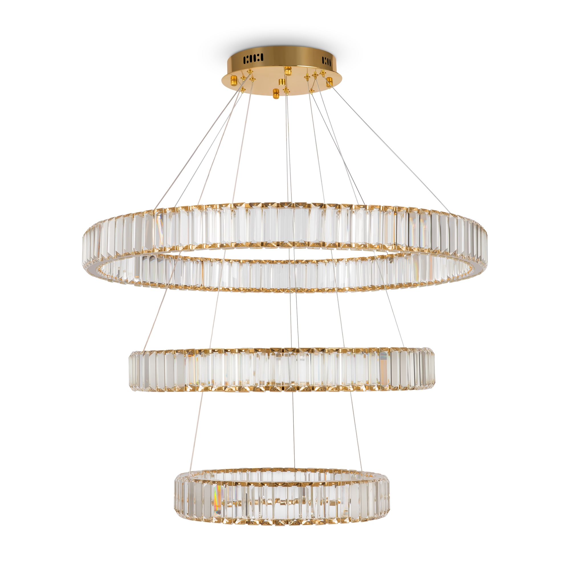 Металлическая арматура в цвете латунь и хром. Хрустальные декоративные кольца с геометричными гранями. LED-источник света. Регулировка цветовой температуры (3000-4000-5000K) и яркости 4G-dimming при помощи пульта (в комплекте).