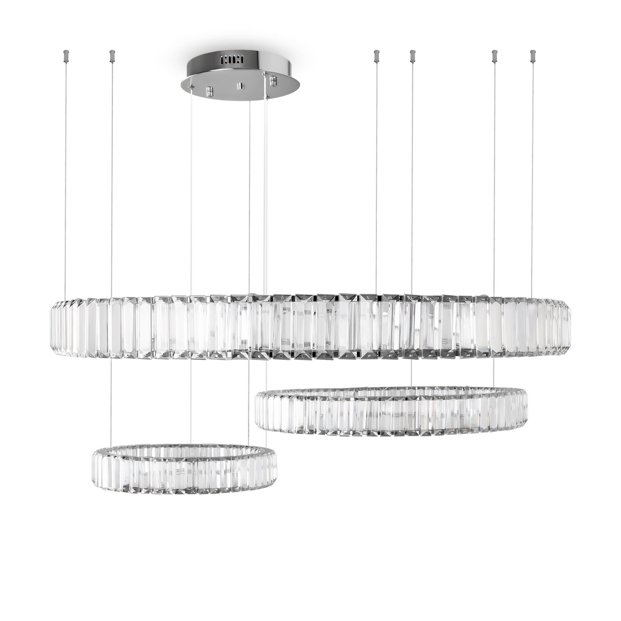 Металлическая арматура в цвете латунь и хром. Хрустальные декоративные кольца с геометричными гранями. LED-источник света. Регулировка цветовой температуры (3000-4000-5000K) и яркости 4G-dimming при помощи пульта (в комплекте).