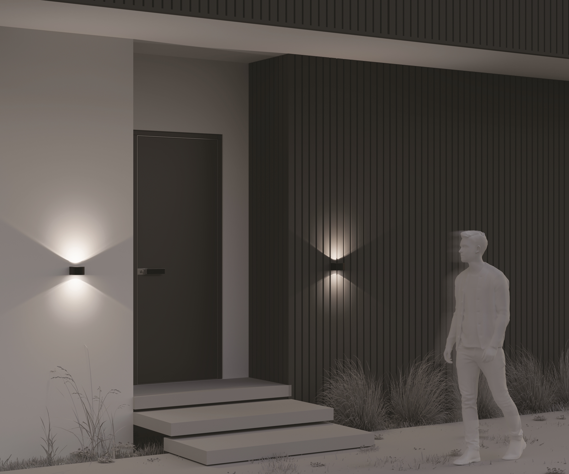 Алюминиевый корпус, цвет — графит. Минималистичный, компактный дизайн. Свечение в одну и в две стороны. LED-источник света. Цветовая температура 3000K. Степень защиты от пыли и влаги IP54.