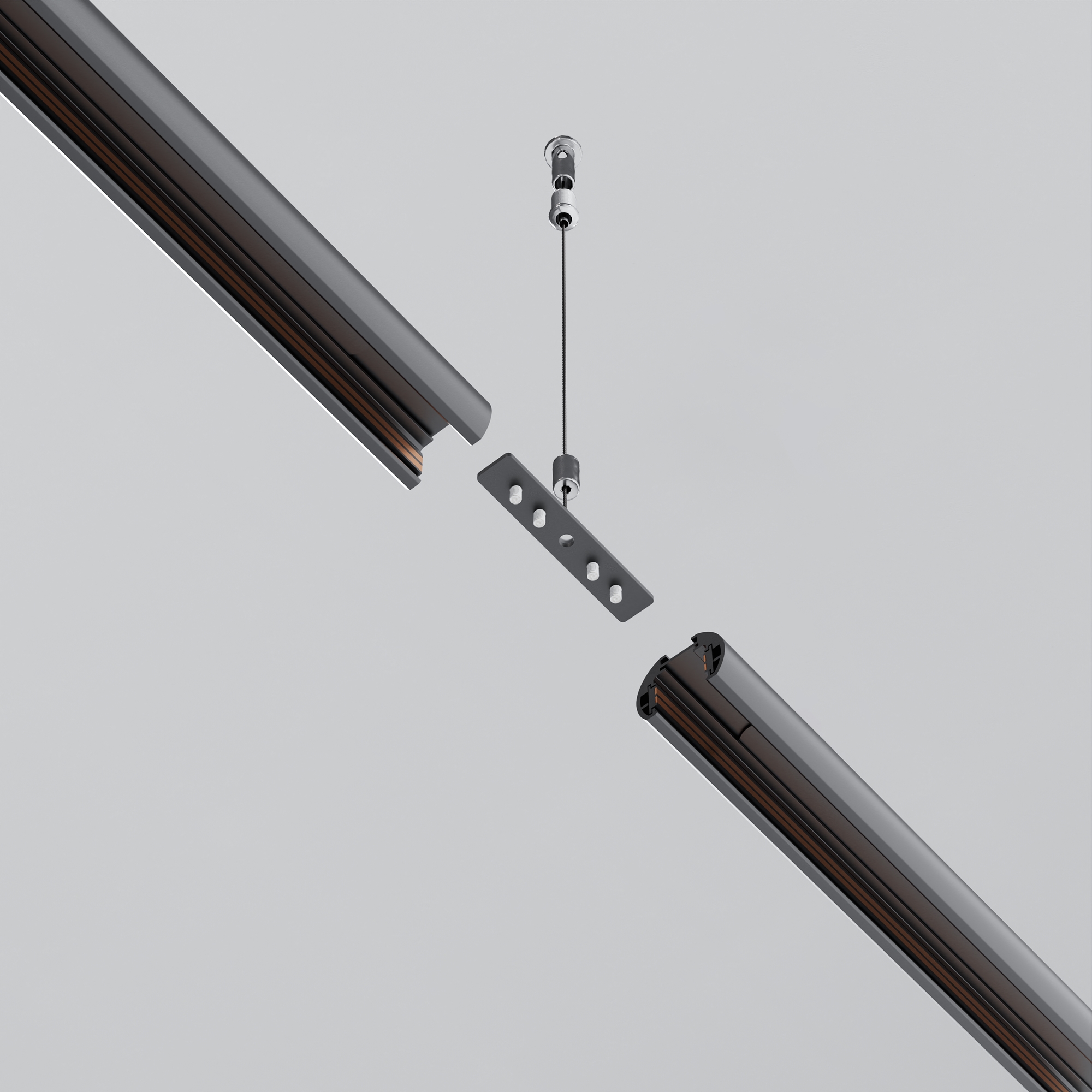 Комплектующие для низковольтной магнитной трековой системы Exility в черном и белом цветах. Разнообразие аксессуаров позволяет собрать свою уникальную конструкцию для накладного монтажа, подвесного, встраиваемого под гипсокартон и встраиваемого в натяжные потолки.