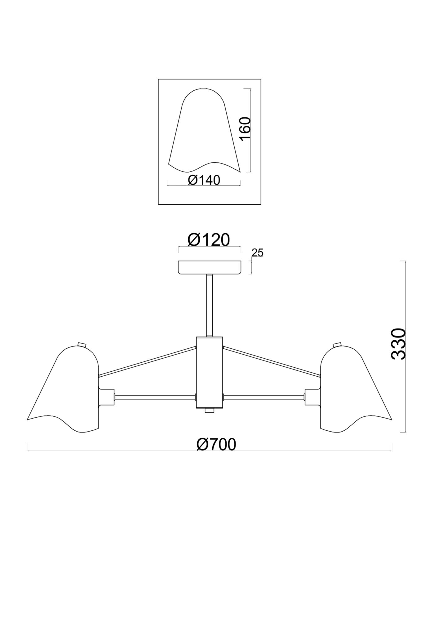 Материал арматуры – металл золотого оттенка. Оригинальные плафоны фантазийной формы также выполнены из металла. Цвет плафонов – белый. Источник света – лампа с цоколем E14.