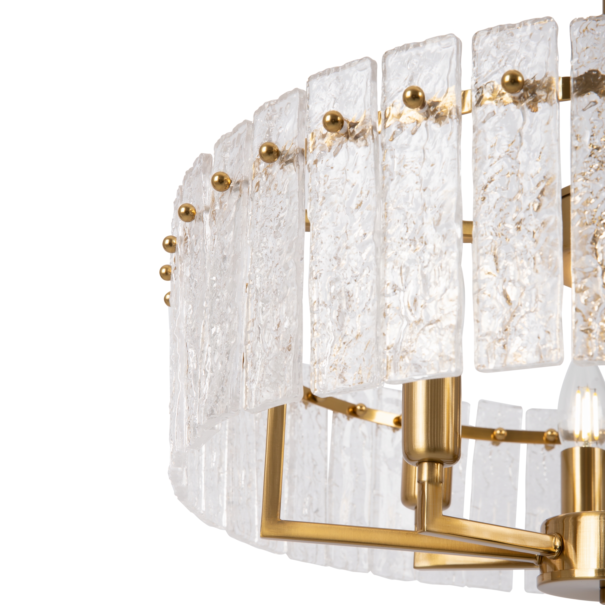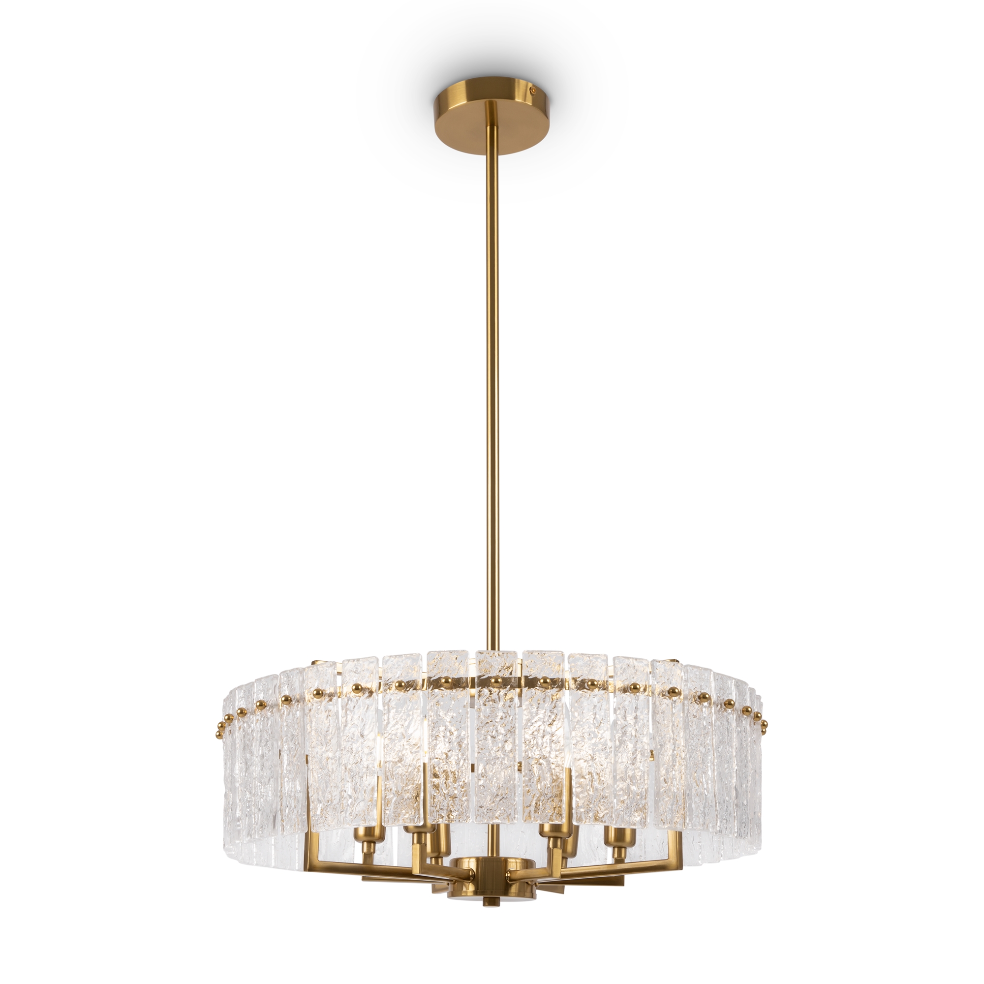 Металлическая арматура. Оттенки – латунь, никель. Декор – фактурные прямоугольные пластины. Материал декора – стекло. Подвесные светильники можно размещать на ножке и устанавливать как потолочный свет. Источник света – лампа с цоколем Е14.