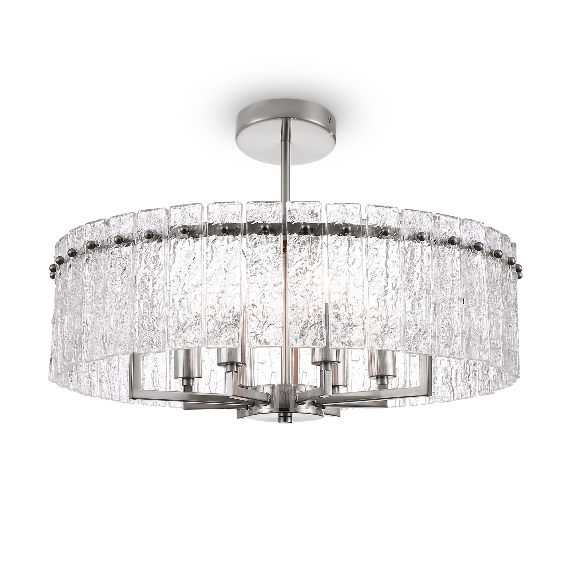 Металлическая арматура. Оттенки – латунь, никель. Декор – фактурные прямоугольные пластины. Материал декора – стекло. Подвесные светильники можно размещать на ножке и устанавливать как потолочный свет. Источник света – лампа с цоколем Е14.