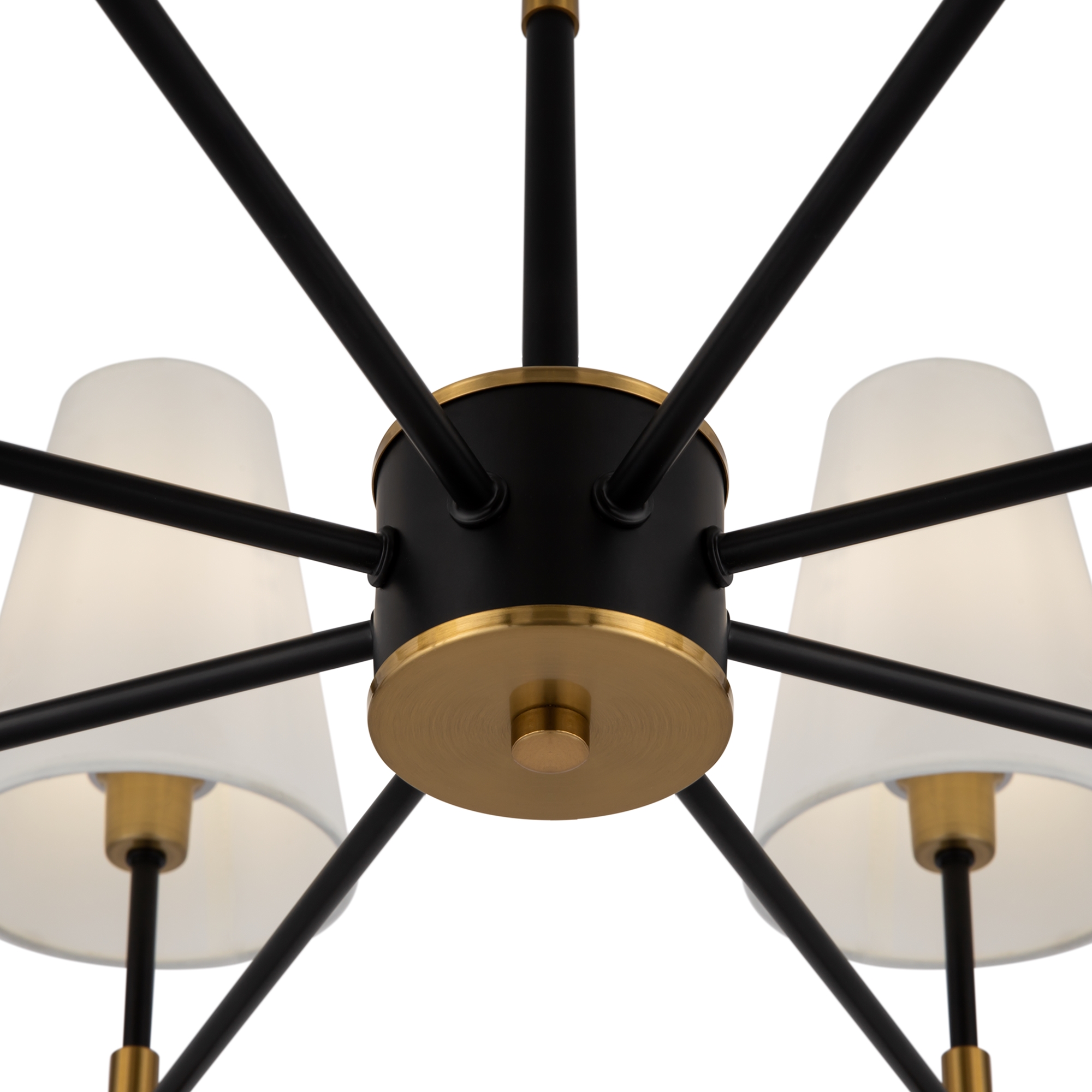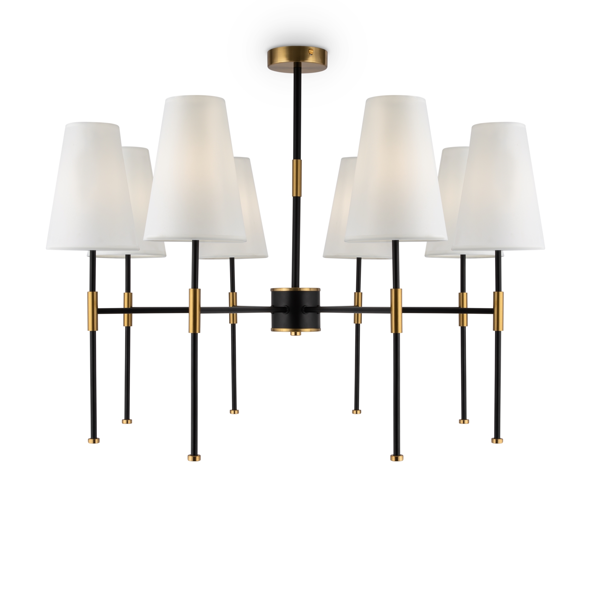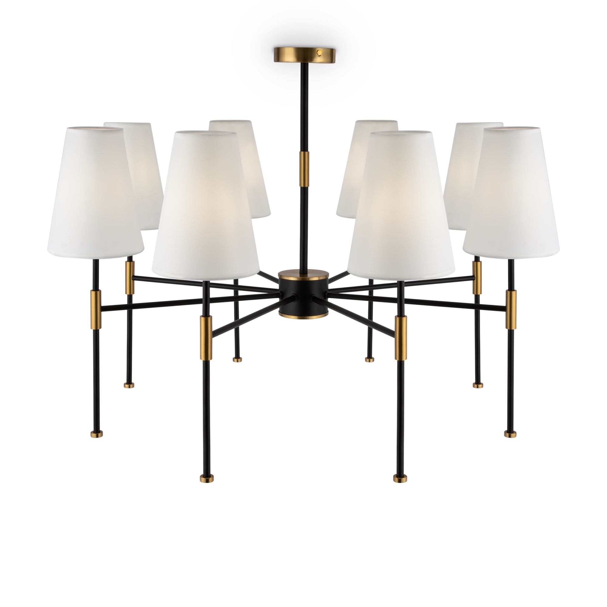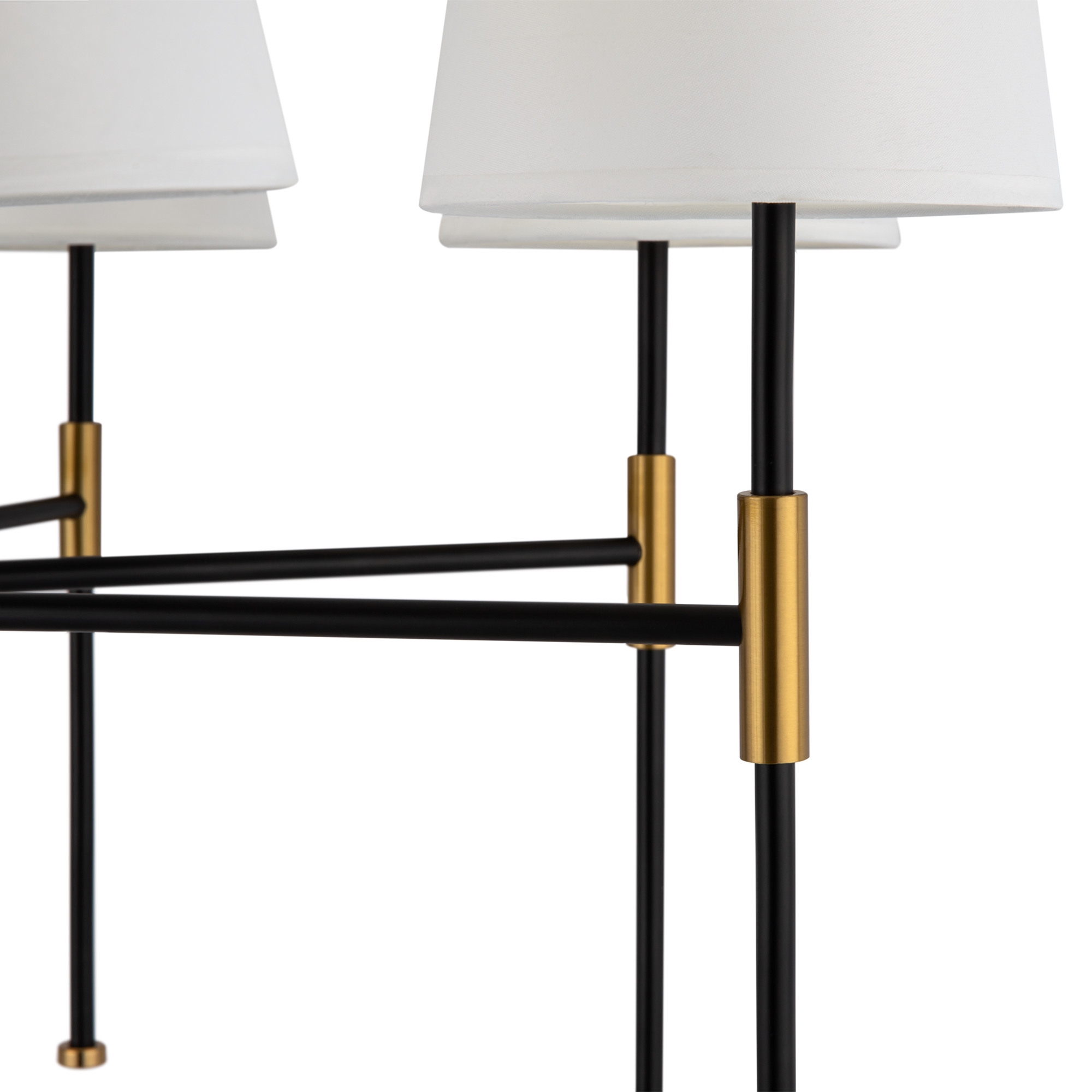 Материал арматуры – металл. Оттенки: хром, комбинация черного и латуни. Абажуры – белая ткань. Акцентный вытянутый силуэт. Источник света – лампа с цоколем E14.