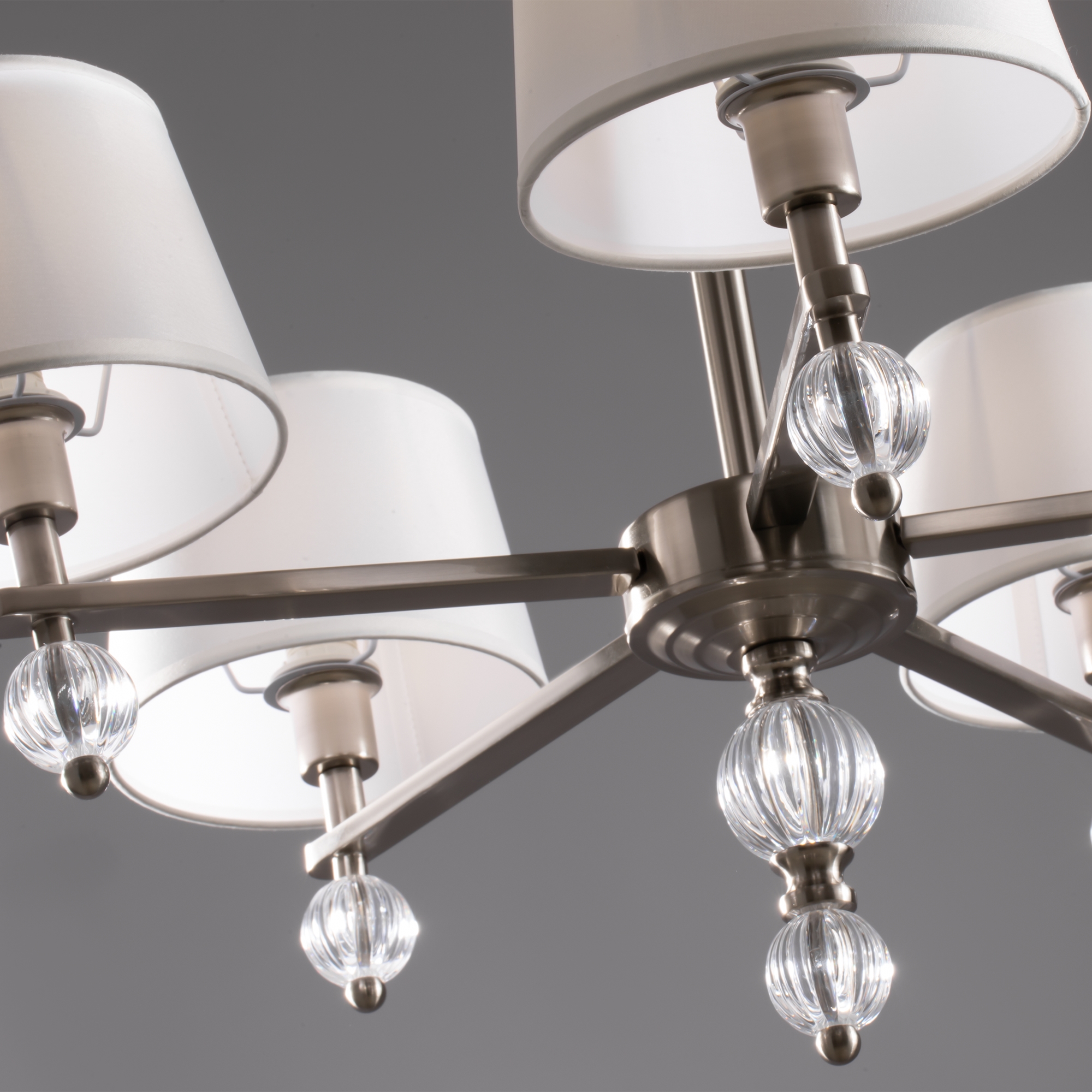 Серия светильников для интерьеров гостиных, спален и офисов в современном стиле. Арматура из метала цвета “никель” дополнена декоративными элементами из прозрачного акрила (шарики). Белые абажуры из текстиля на ПВХ.