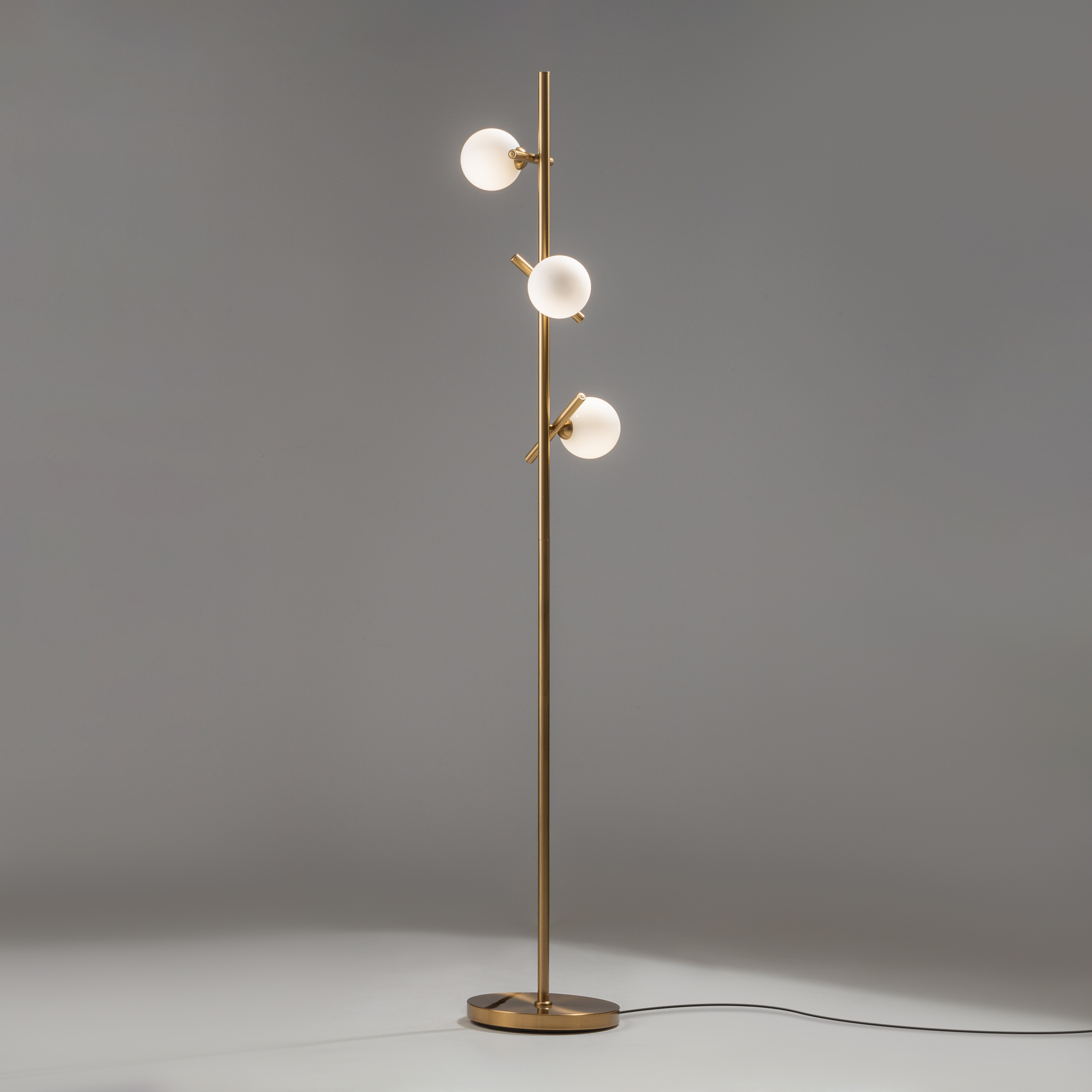 Материал арматуры — рифленый металл, цвет — латунь. Плафоны-сферы из белого матового стекла для мягкого заливающего света. Воздушный образ плафонов, строгие тонкие линии арматуры придадут интерьеру изящество и легкость. Высота подвесов регулируется. Источник света — лампы с цоколем G9.
