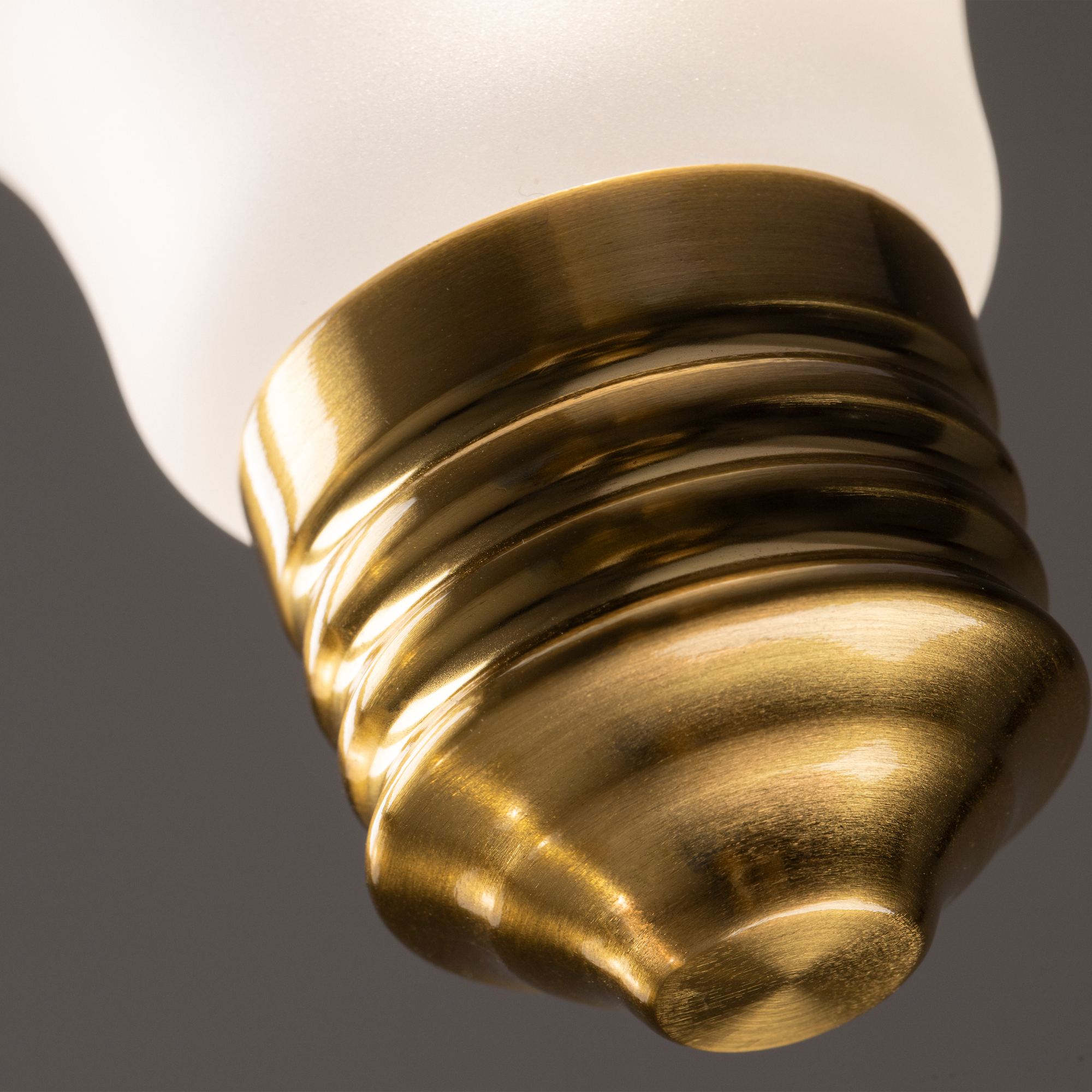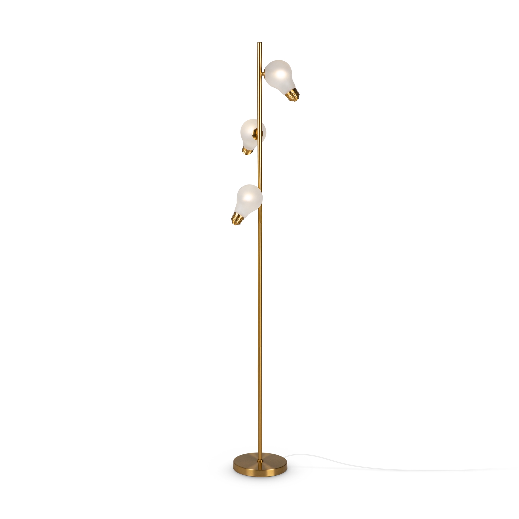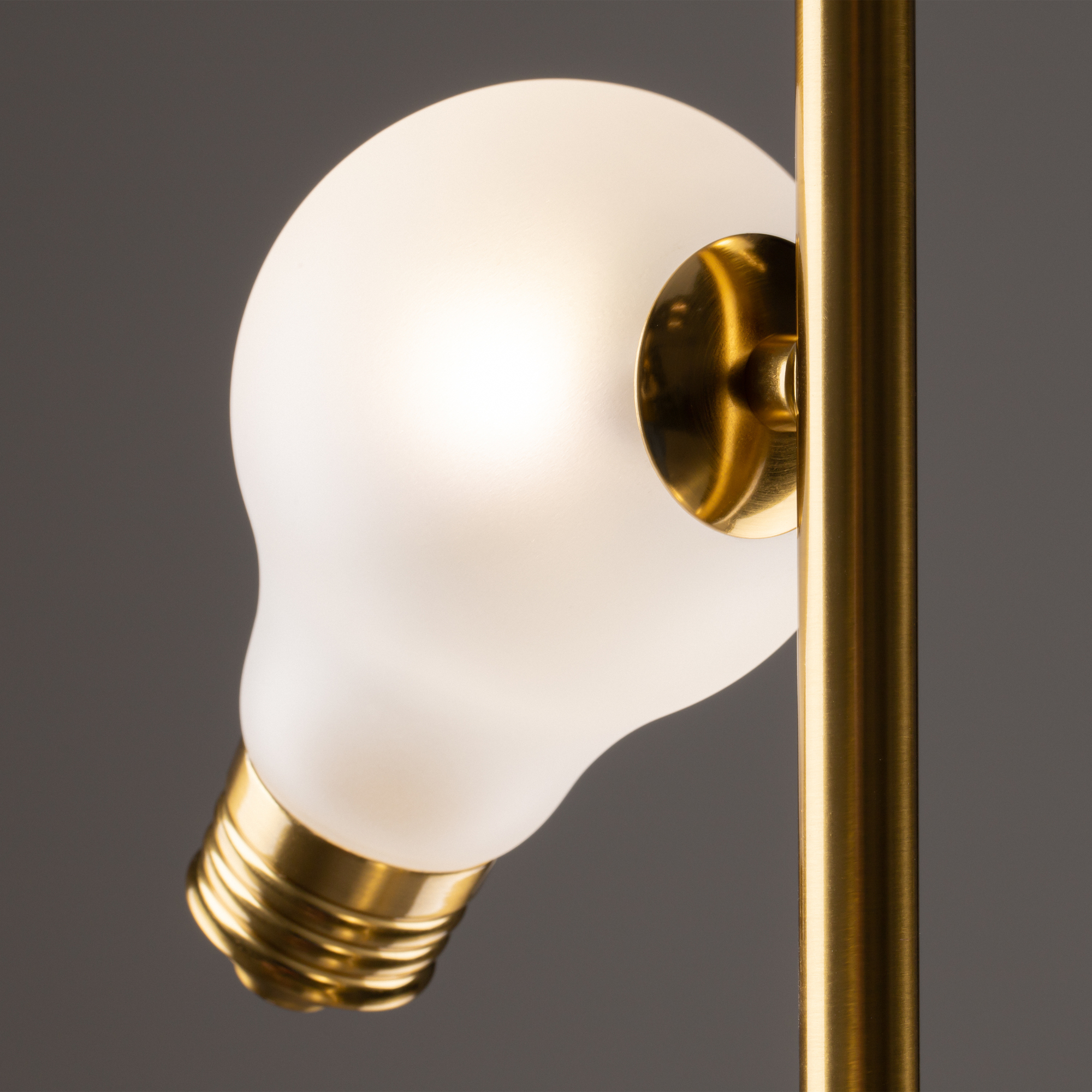 Металлическая арматура, цвета — чёрный и латунь. Прозрачные плафоны-лампочки из стекла в тон арматуры хаотично “разбросаны” по острову светильника. Подвесы регулируются по высоте. Источник света — лампа с цоколем G9.
