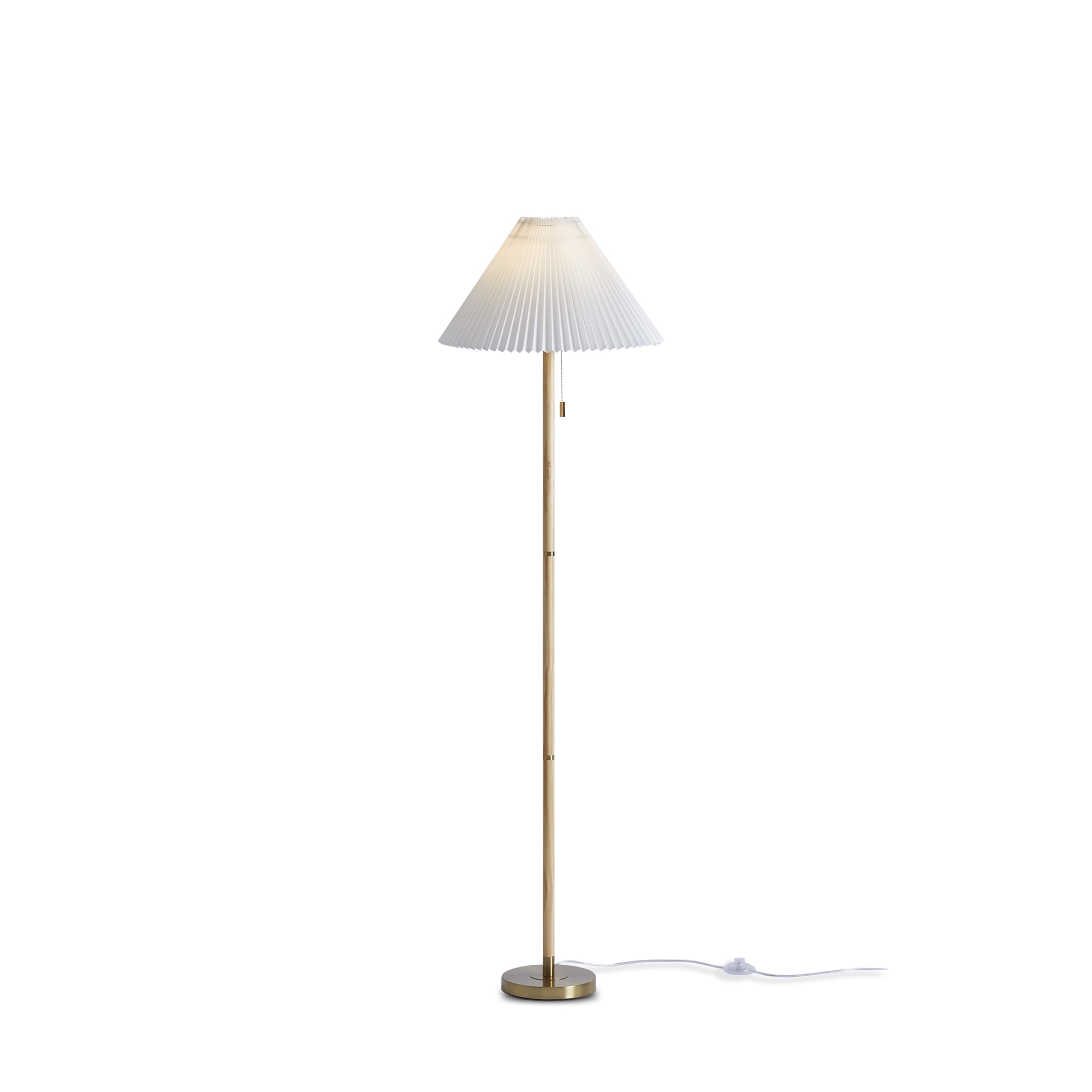 Материал арматуры — металл и дерево, цвет металла— латунь. Настольный, подвесной светильник и торшер с цоколем E27. Белый тканевый абажур гофрированный рельеф. Переключатель на настольной лампе и торшере на цепочке. Подходят для классических и современных интерьеров.