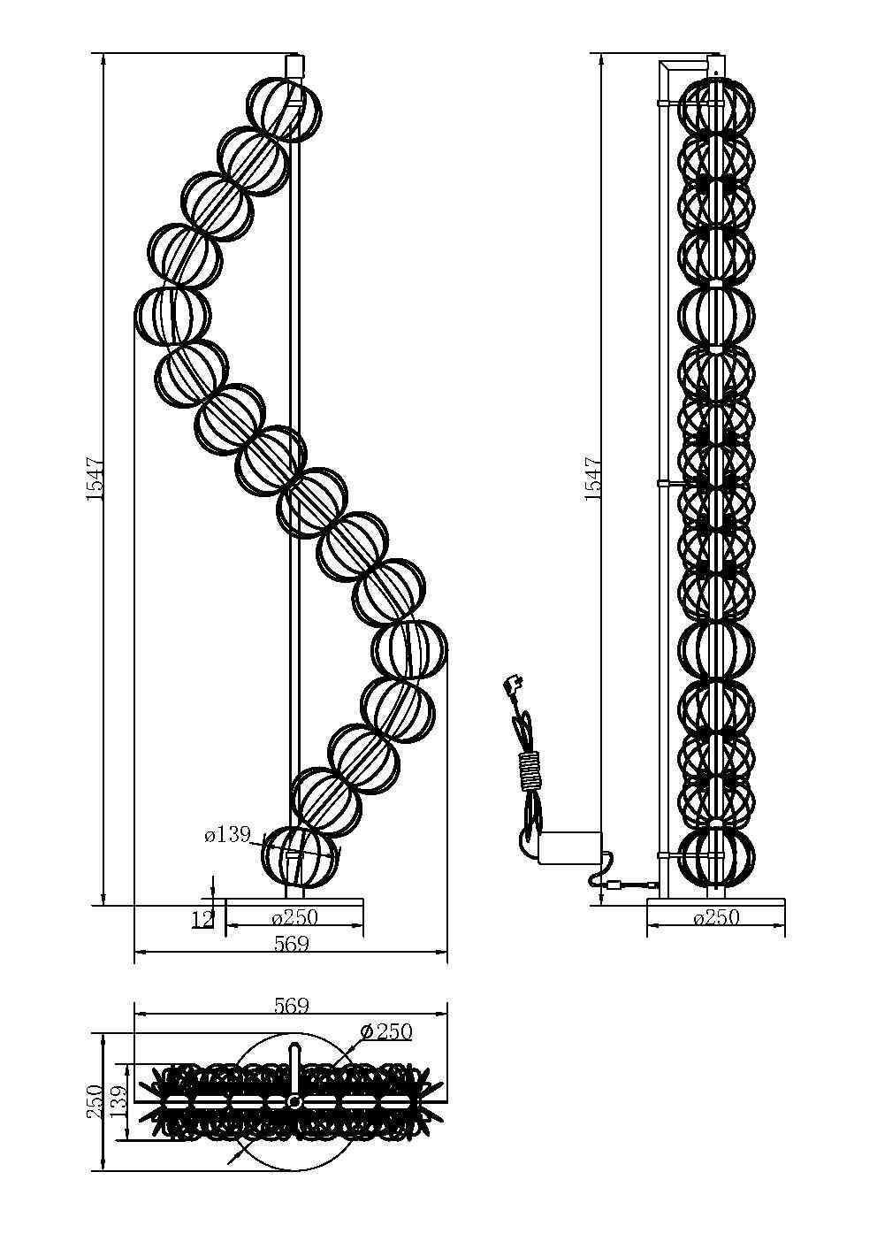 Арматура — металл, цвет — золото. Декоративные проволочные плафоны-сферы — ручная работа. Горизонтальные подвесы в двух вариатах монтажа — накладном и скрытом. Свтовой элемент — силиконоваая трубка с LED-источником. Цветовая температура 3000К.