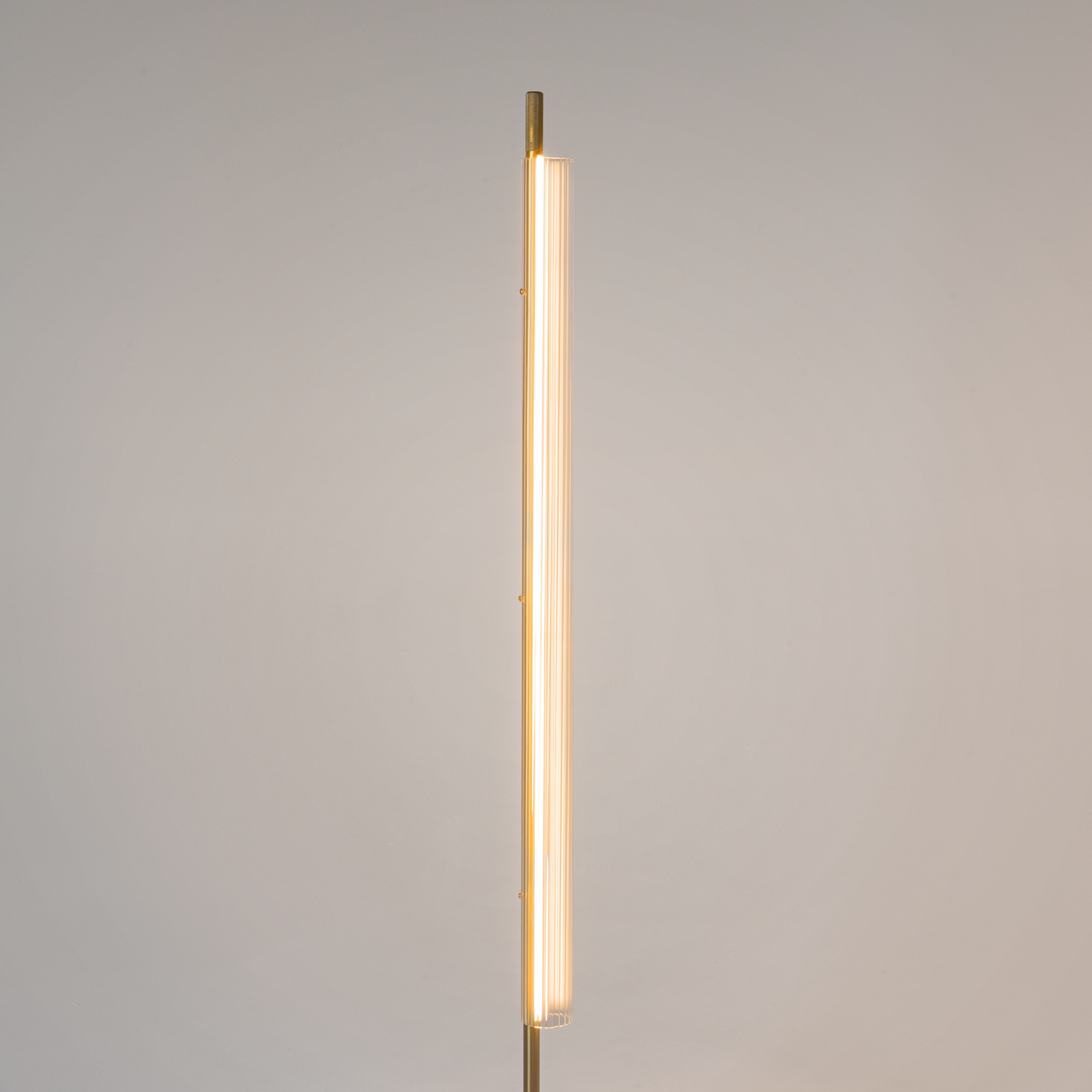 Арматура из металла, цвет — латунь с сатиновым финишем. Плафон из рифленого прозрачного стекла. LED-источник света. Теплая цветовая температура 3000К. Регулируемый по длине провод 3 метра у подвесного светильника. Подходит для помещений с высокими потолками. Торшер с push-кнопкой на проводе для удобного включения и выключения.