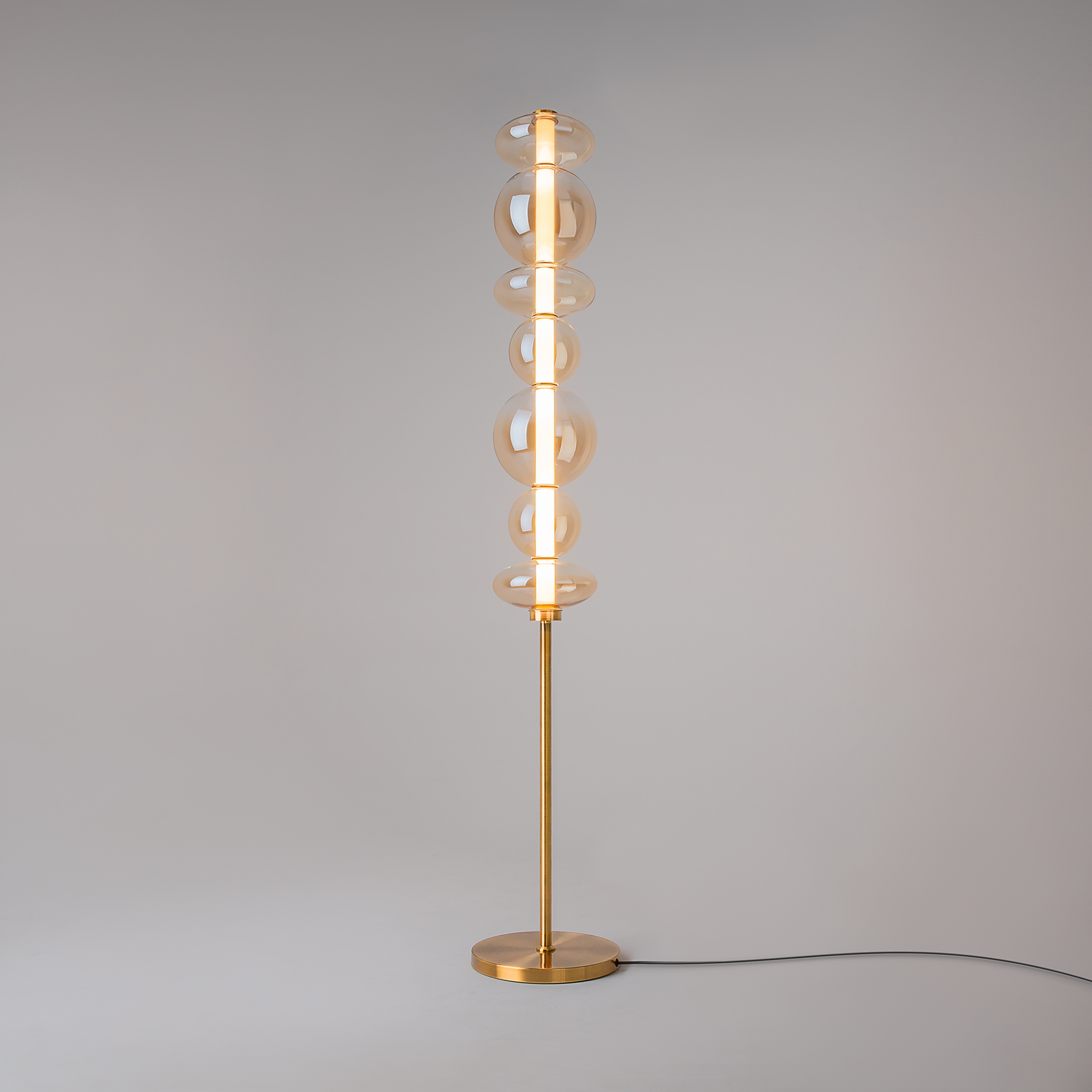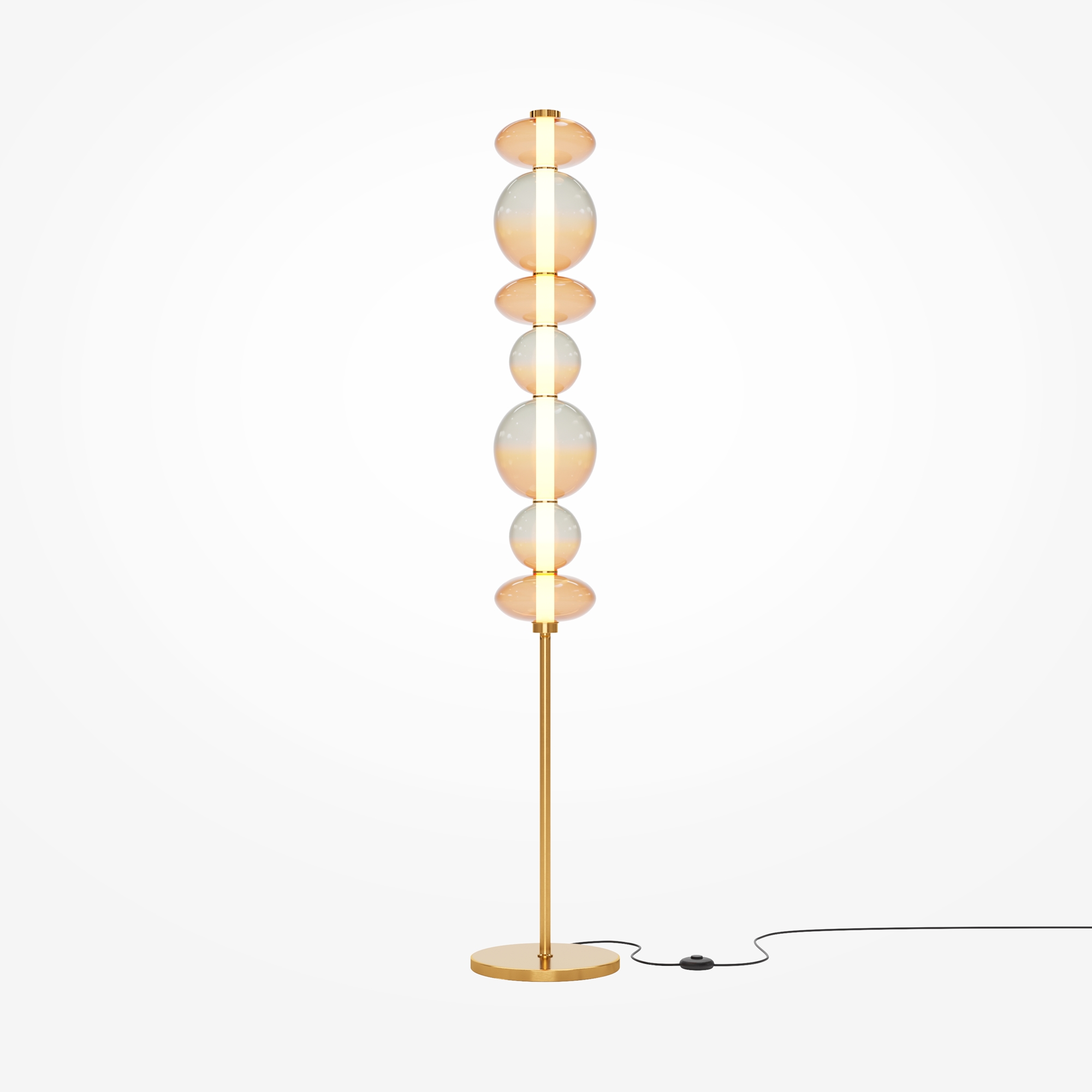 Светильники с тонированными выдувными стеклянными плафонами (дымчатыми или янтарными) и металлической арматурой (черной или цвета латуни). Окрашивание плафонов градиентное. Источник света: LED. Световой элемент установлен внутри акрилового рассеивателя. Цветовая температура источника света – 3000К, угол рассеивания — 120°. Торшеры снабжены Push-кнопкой на проводе.