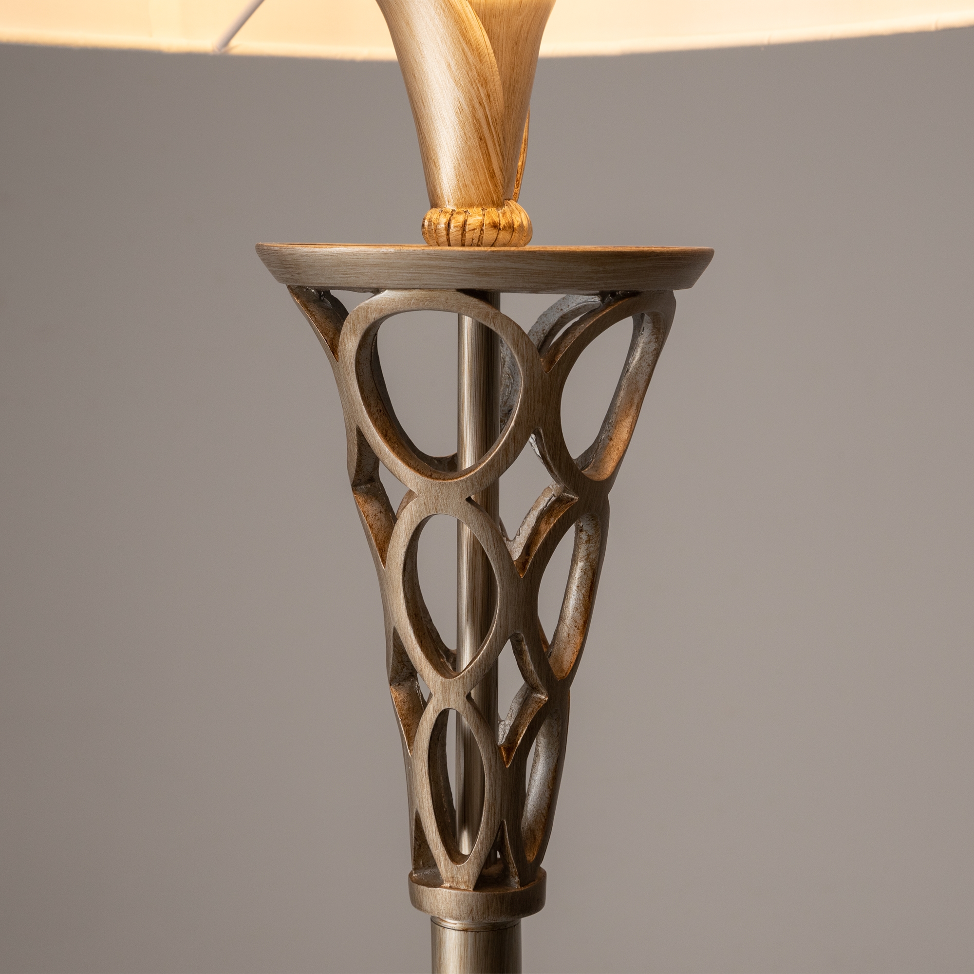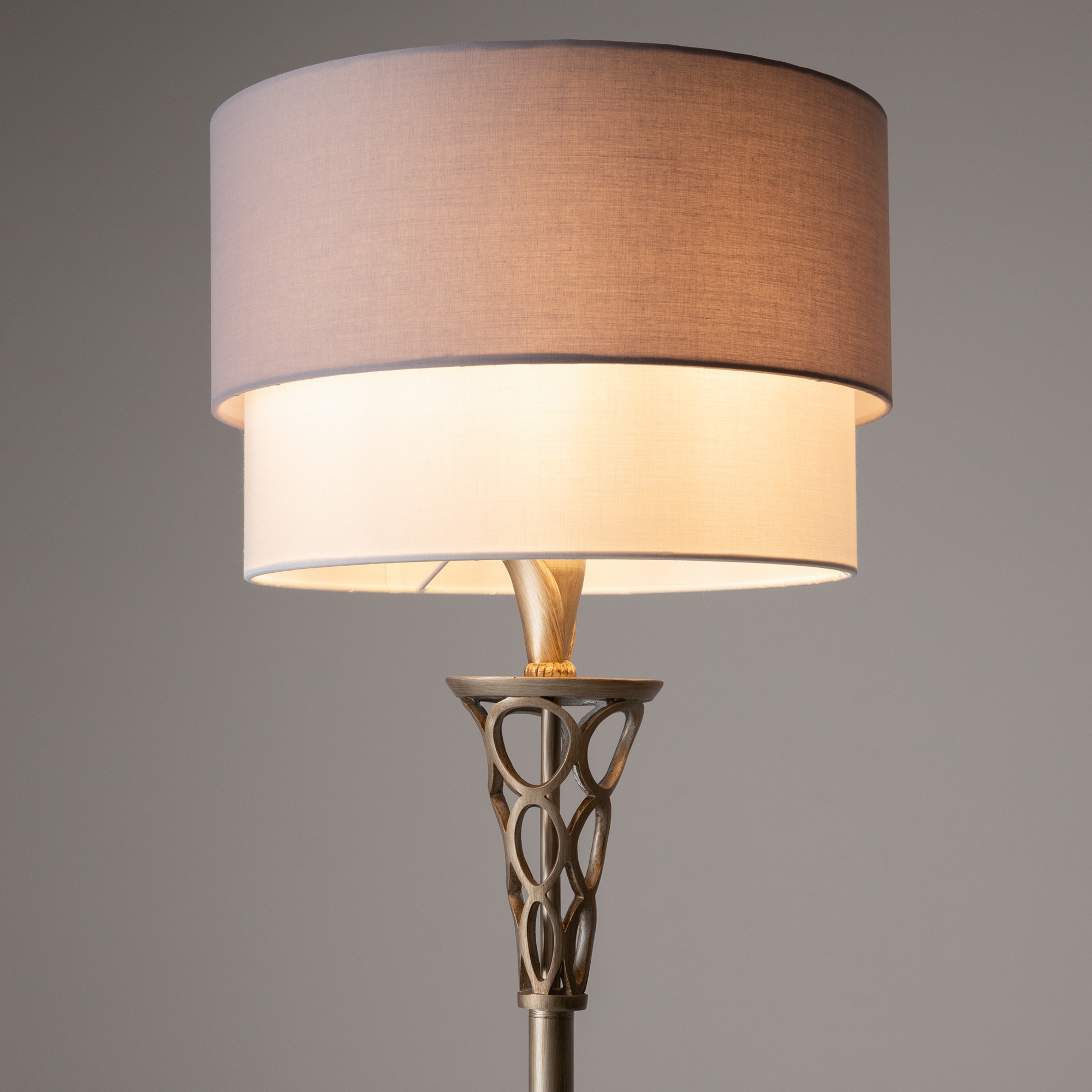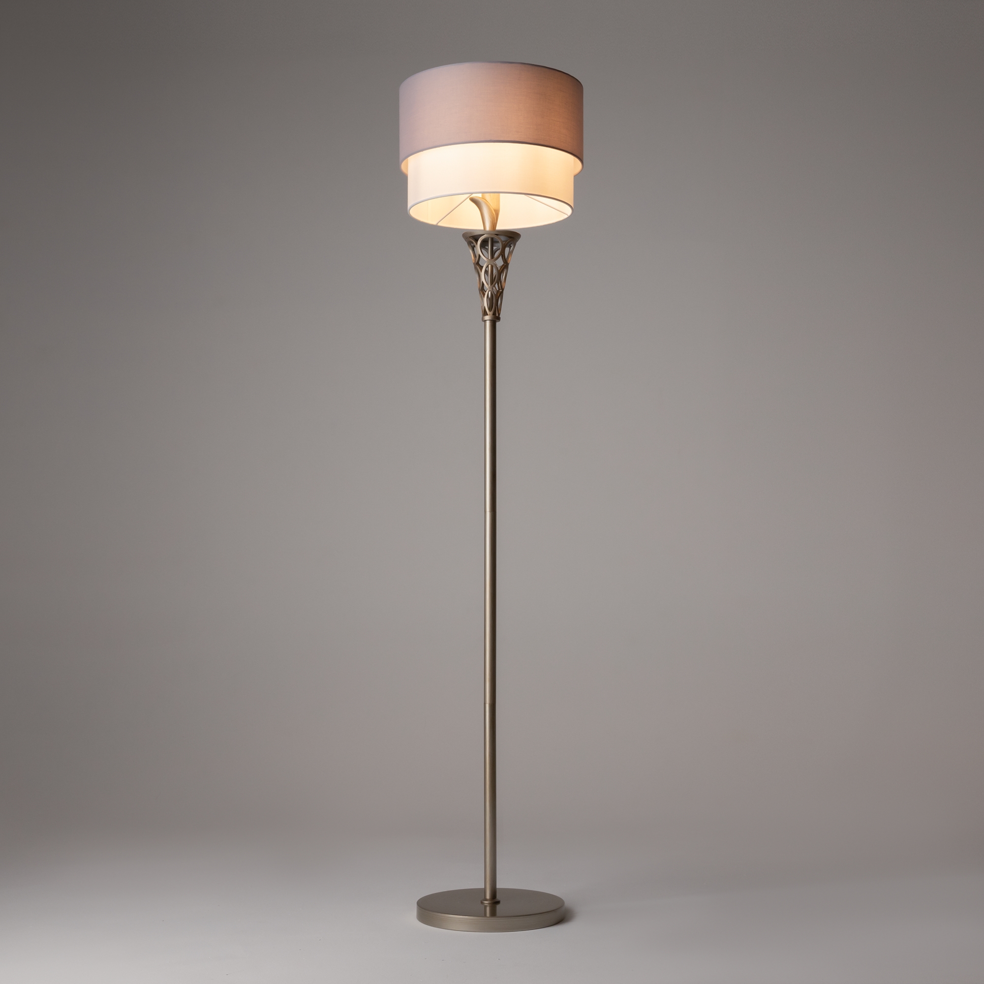 Металлическая арматура окрашена в цвет античного серебра. Двойные абажуры из хлопка на ПВХ, комбинация белого и серого цвета. Флористический декор. Высота люстр регулируетс