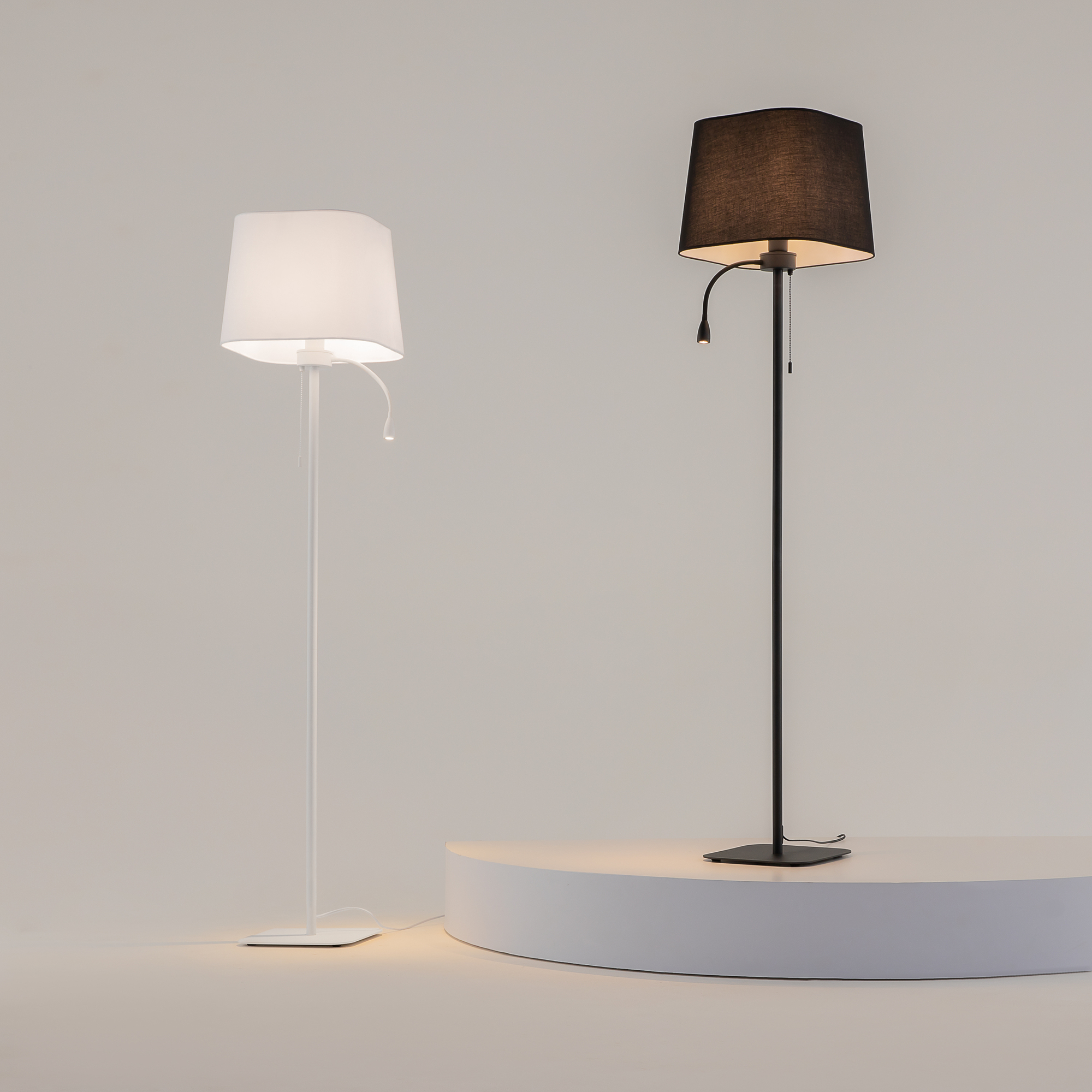 Металлическая арматура в белом и черном цвете. Материал абажура – текстиль, нанесенный на ПВХ, оттенки – белый и черный. LED-элемент для локальной под светки расширяет функционал модели.