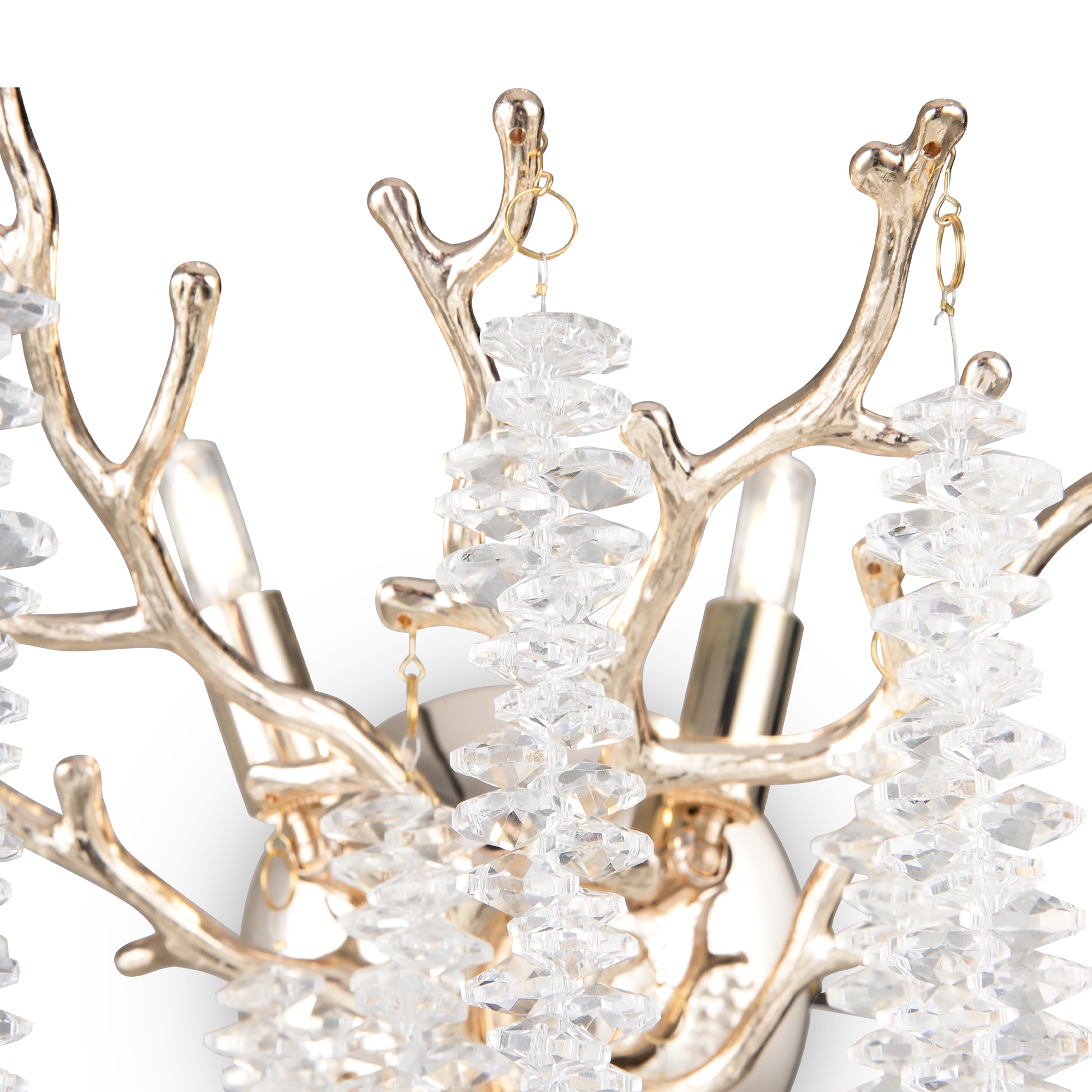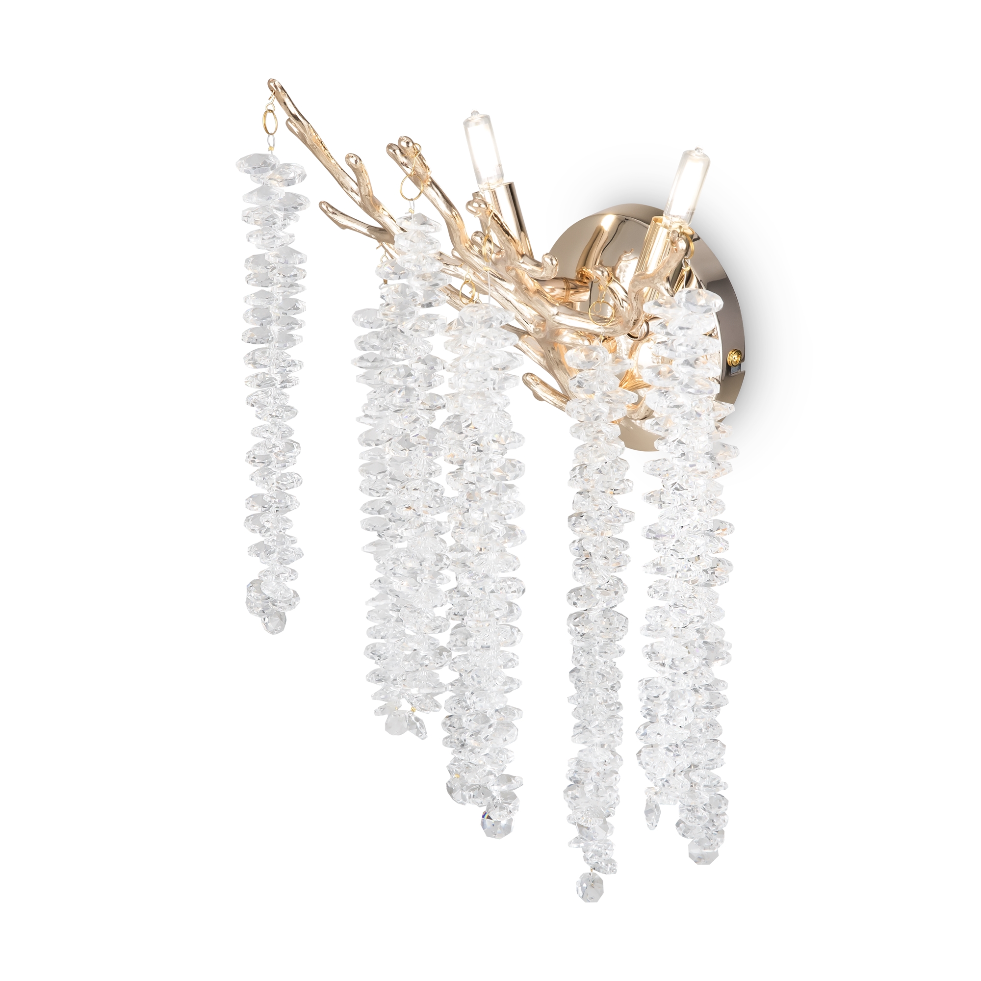 Материалы арматуры —металл, цвет — золото. Хрустальные декоративные элементы напоминают капельки — создают глубокие переливы света. Дизайн в трендовой растительной тематике. Источник света — лампа с цоколем G9 и с поворотной функцией.