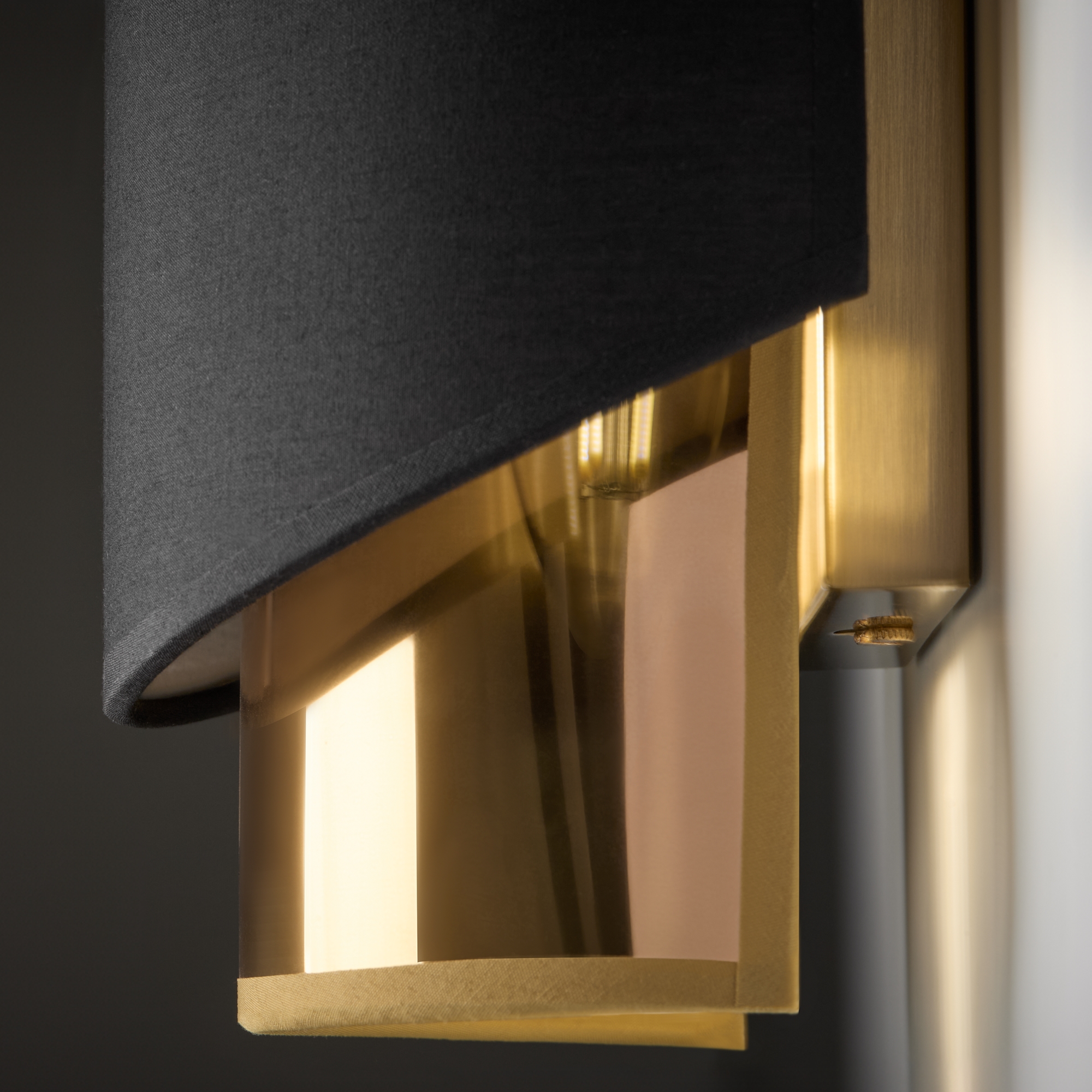 Металлическая арматура. Цвет – латунь. Черный тканевый абажур дополнен окантовкой золотого цвета. Трендовая комбинация контрастных оттенков и фактур. Источник света – лампа с цоколем Е14.