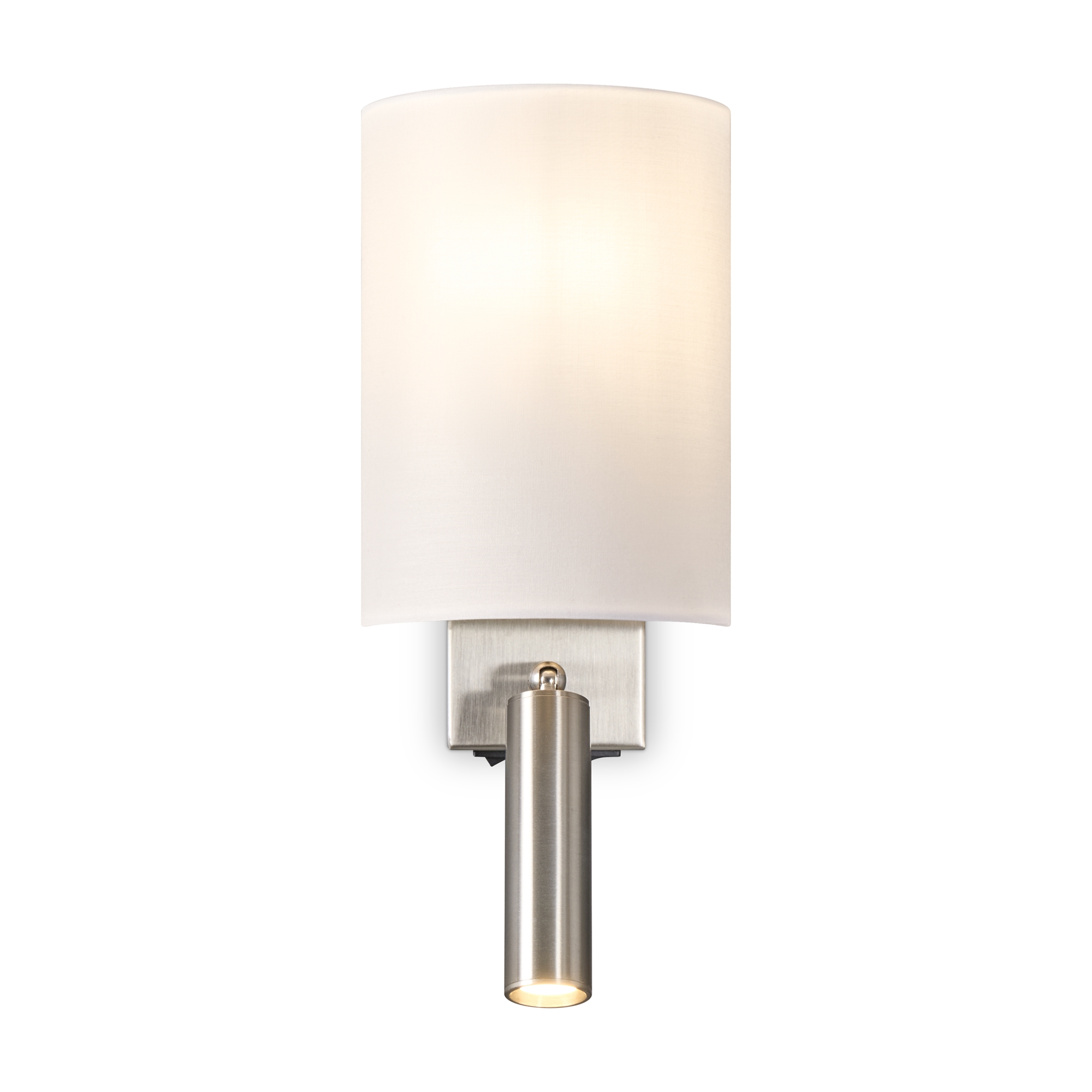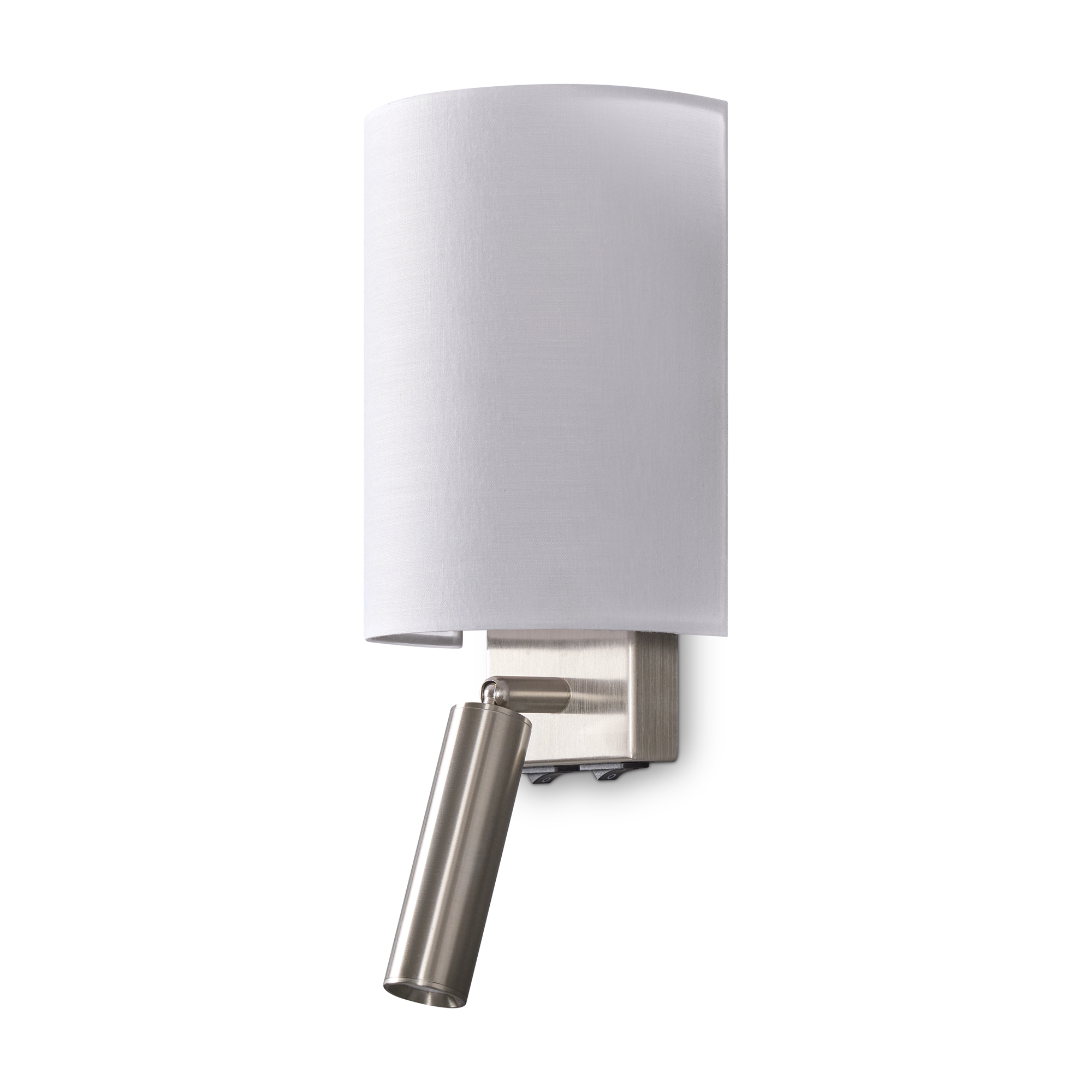 Цилиндрической формы абажур из ткани белого цвета. Декоративная парящая окантовка из металла в цвет арматуры. Регулируется по длине. Компактные размеры подходят для низких потолков и небольших интерьеров. Металлическая арматура, цвет — латунь и никель. Источник света — лампа с цоколем Е14, E27 и для настенного бра дополнительный LED с температурой свечения 3000 K.
