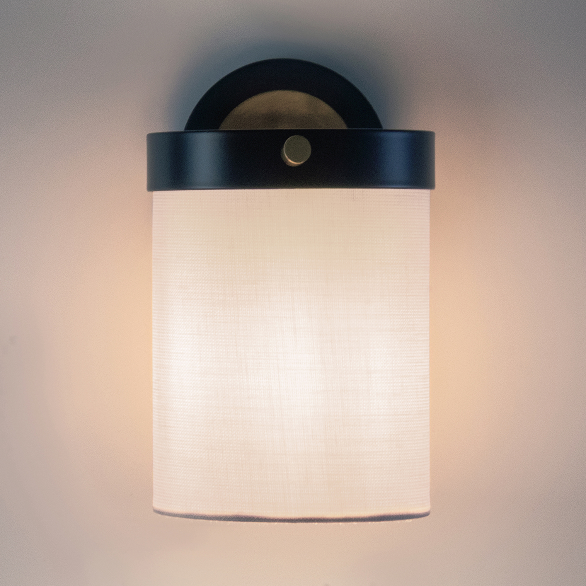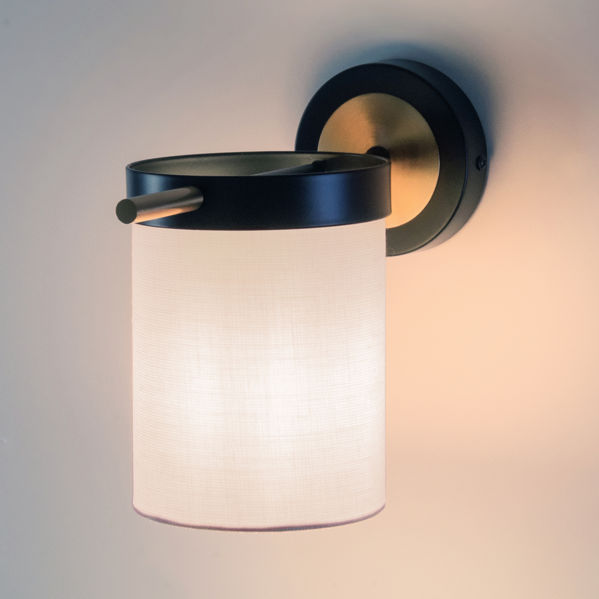 Арматура из металла. Основной цвет — чёрный, декоративные элементы в цвете латунь. Тканевые бежевые абажуры-цилиндры украшены чёрными металлическими основаниями. Компактные размеры для невысоких потолков. Источник света — лампа с цоколем Е14.