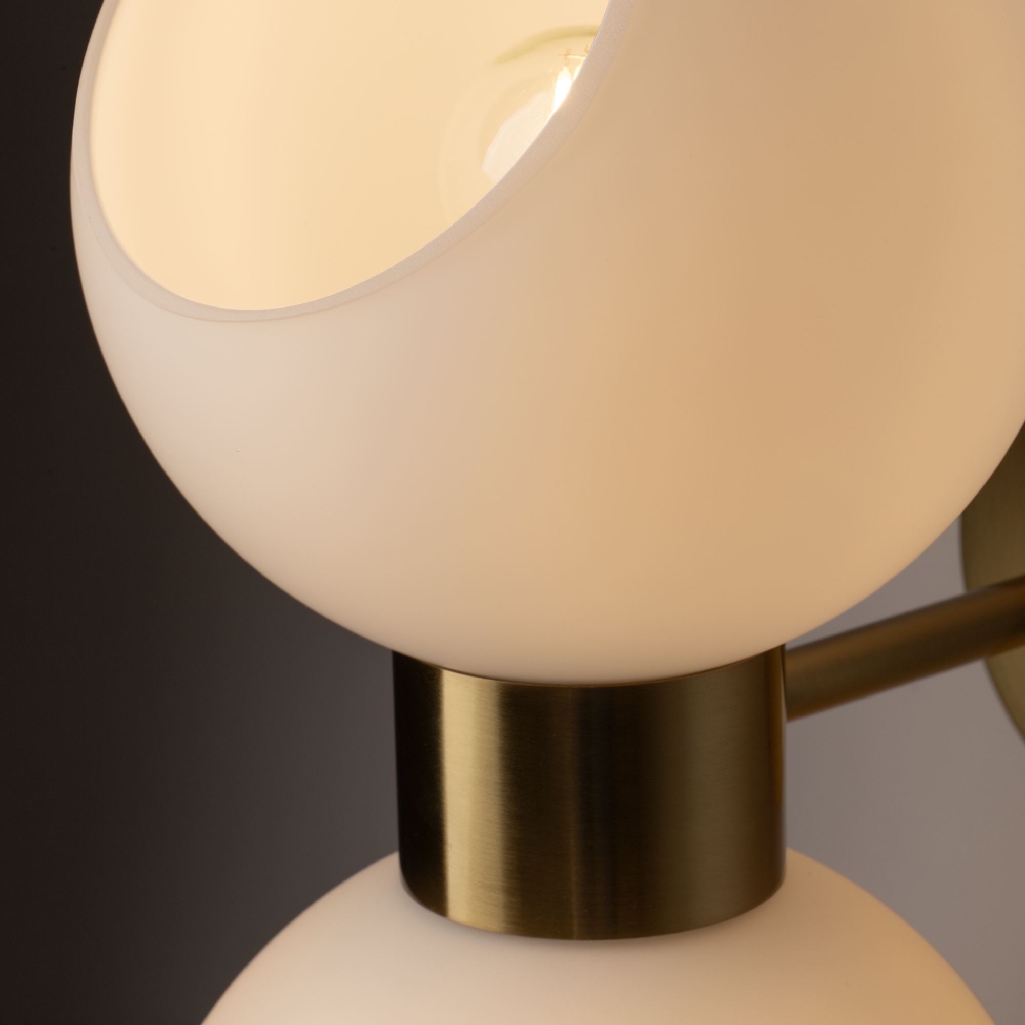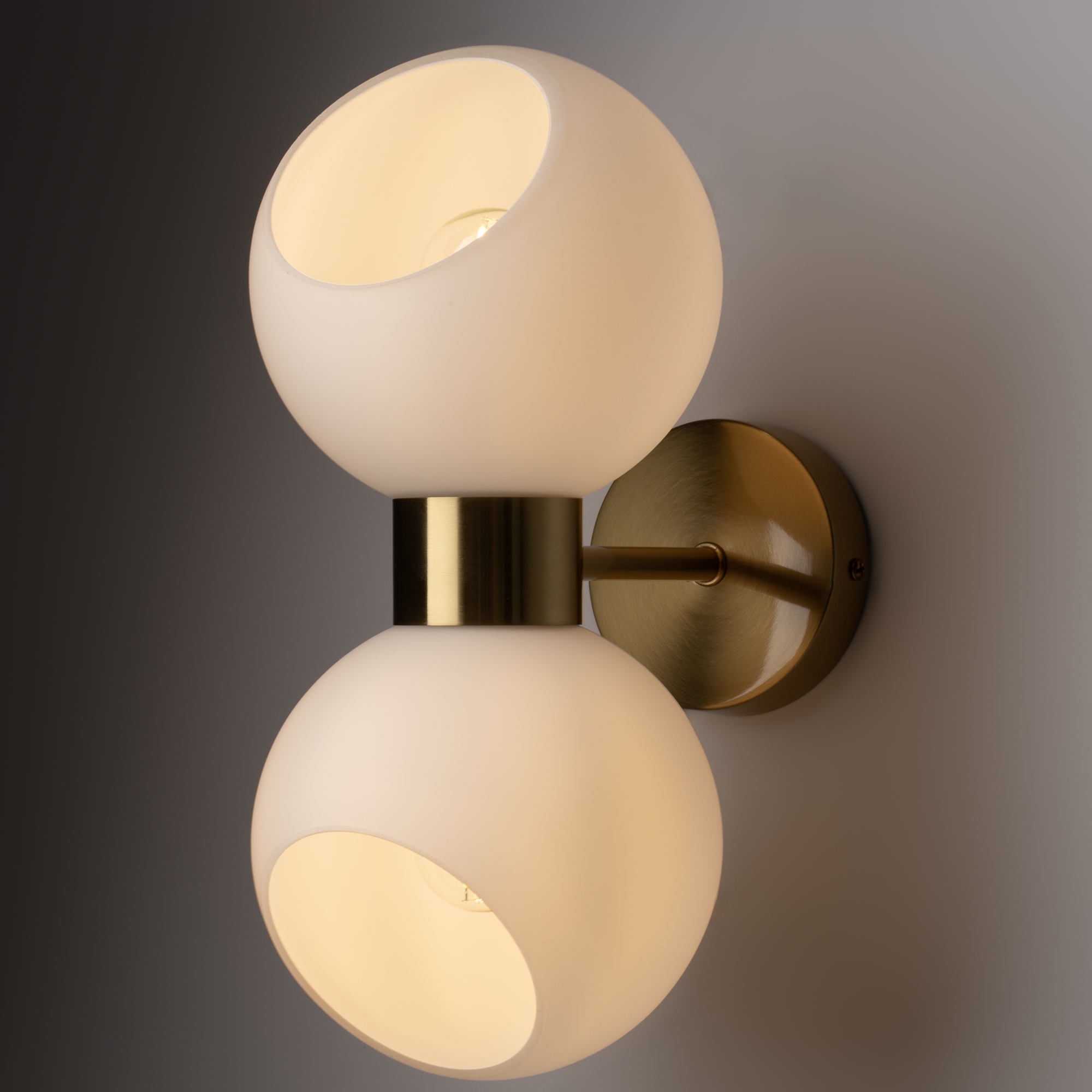 Металлическая арматура в цвете латунь. Открытые сферические плафоны в 2-х цветах: тёплый белый и тёмный гальванизированный. Плафоны разделены металлической вставкой в цвет арматуры. Источником света является лампа с цоколем G9. Для бра — цоколь Е27.