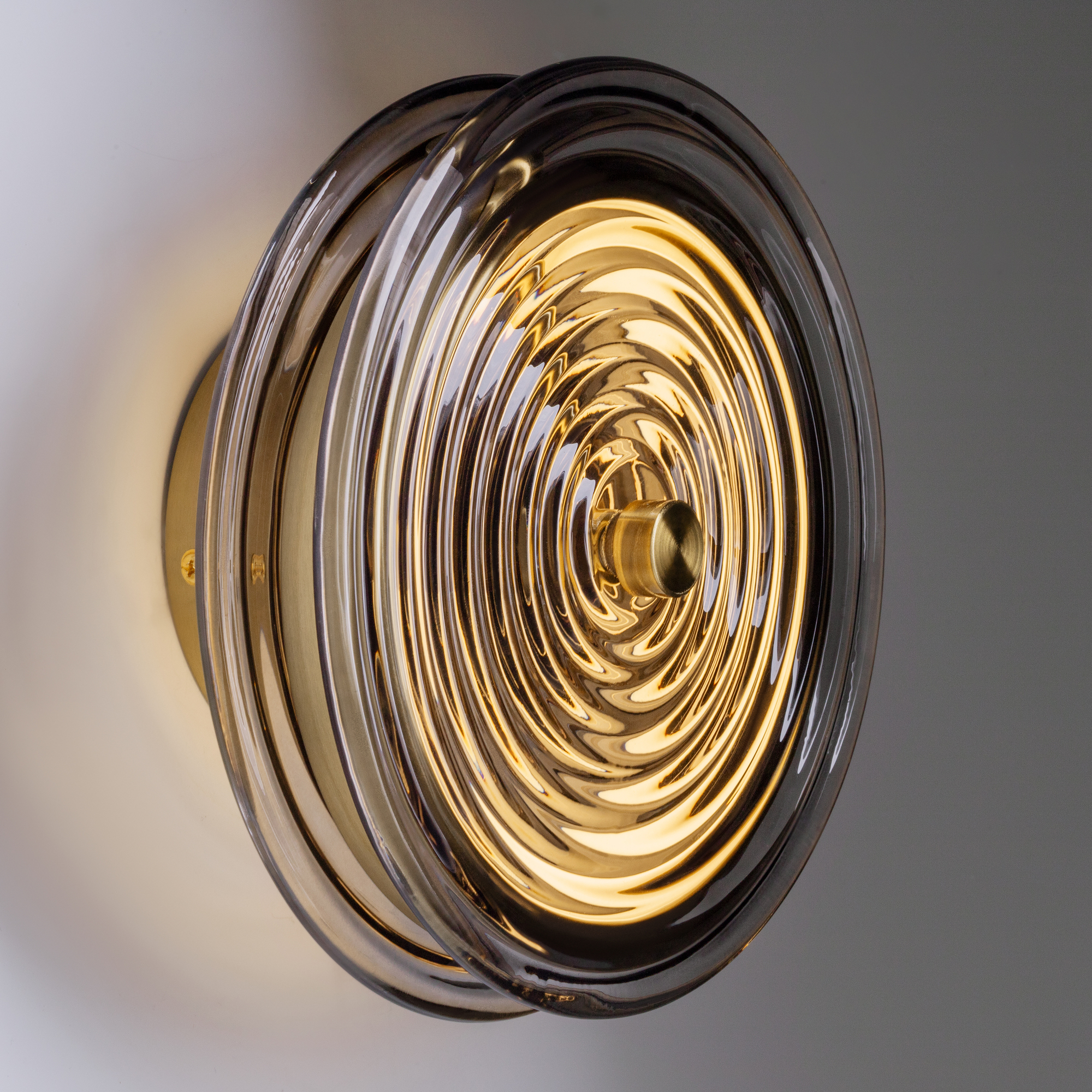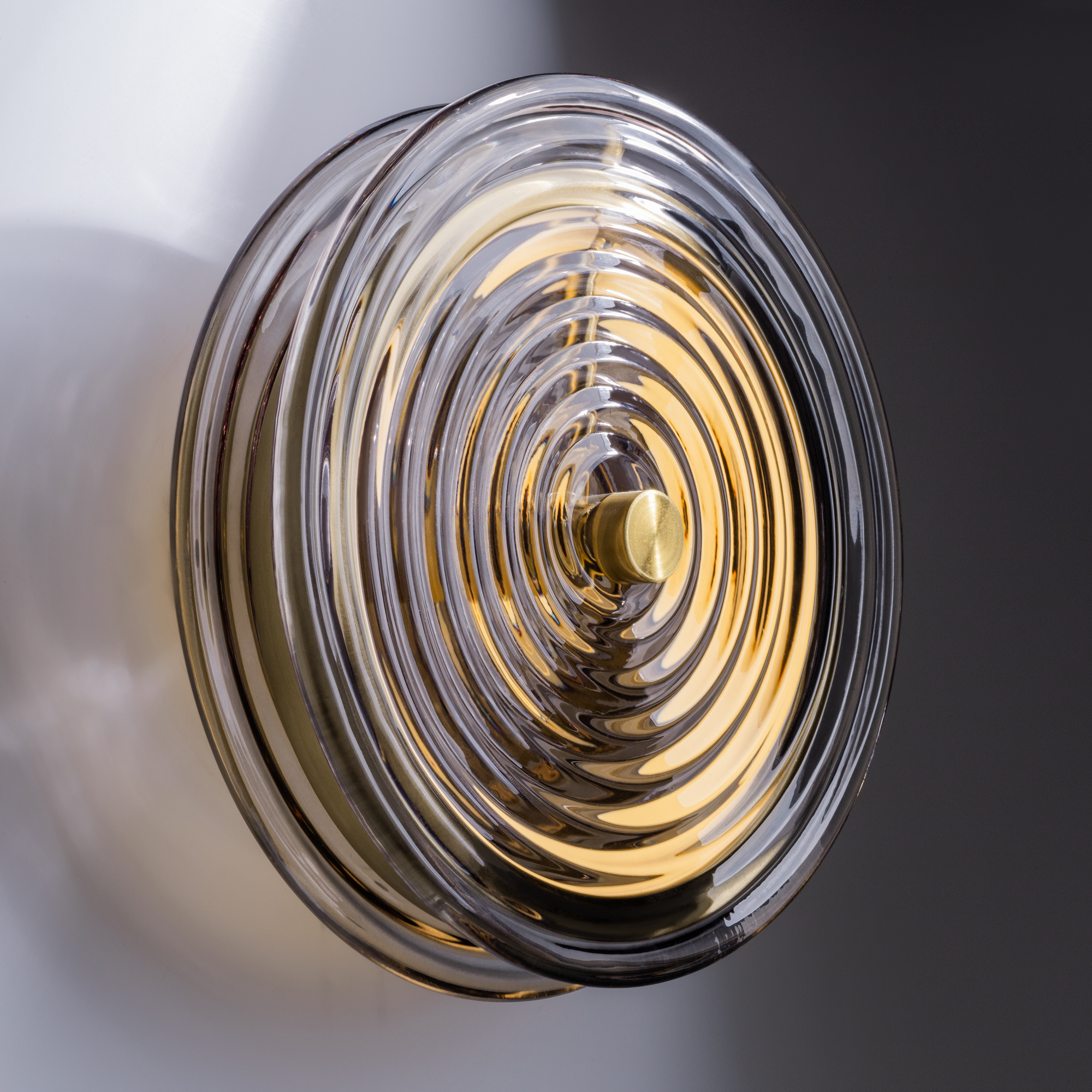 Арматура — металл. Цвет арматуры латунь. Плафоны из стекла в форме леденцов выполнены в четырех цветах: серый, зеленый, прозрачный и желто-оранжевый. Широкий спектр типов светильников: торшеры, настенные бра и подвесы. LED источник света. Цветовая температура 3000К.