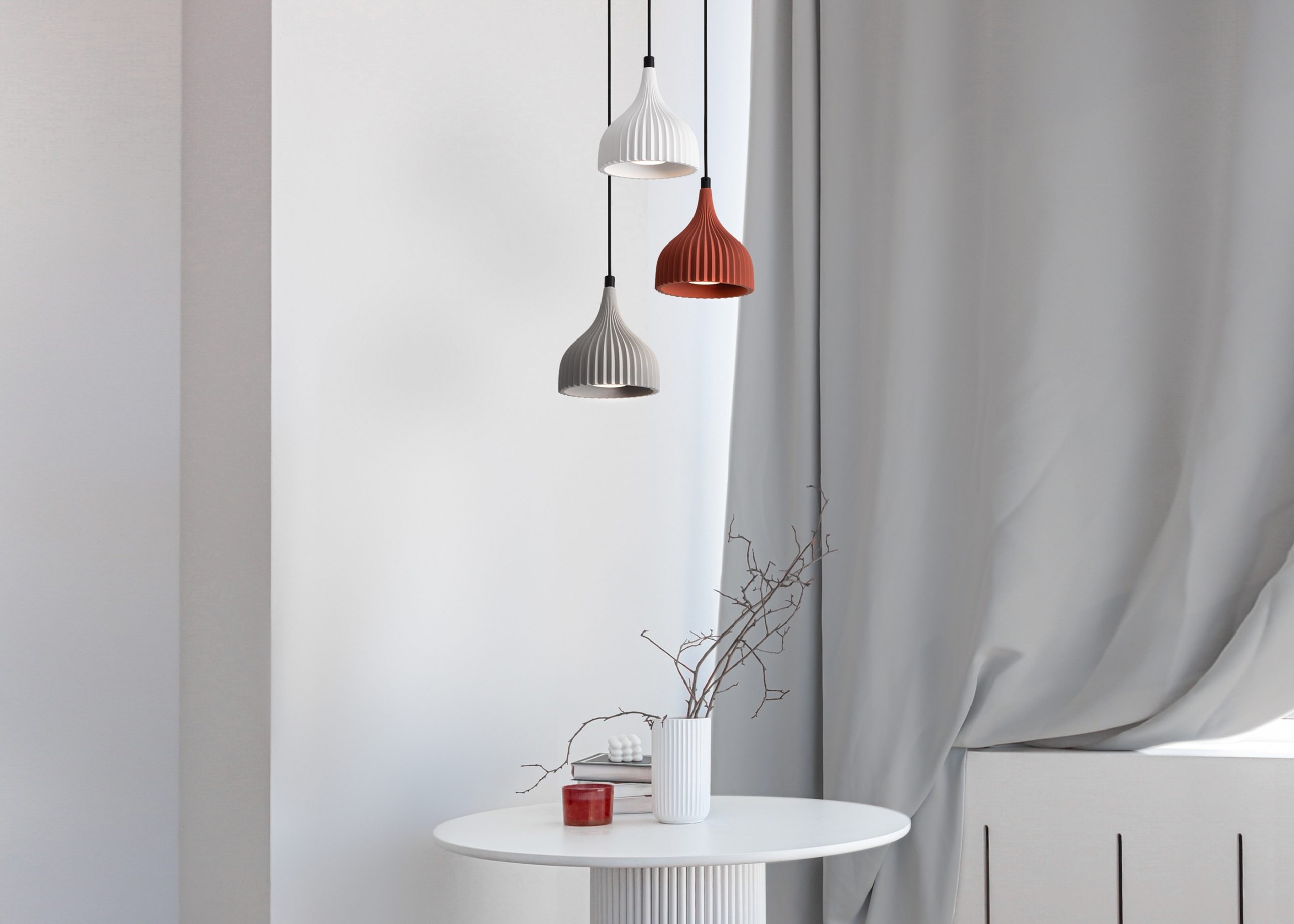 Арматура — металл. Абажуры из микроцемента: графит, красный, белый, серый. Лампы G9/GU10 (не в комплекте). Регулировка подвесов 210-2200 мм. LED 3000K. Яркий акцент в интерьере.
