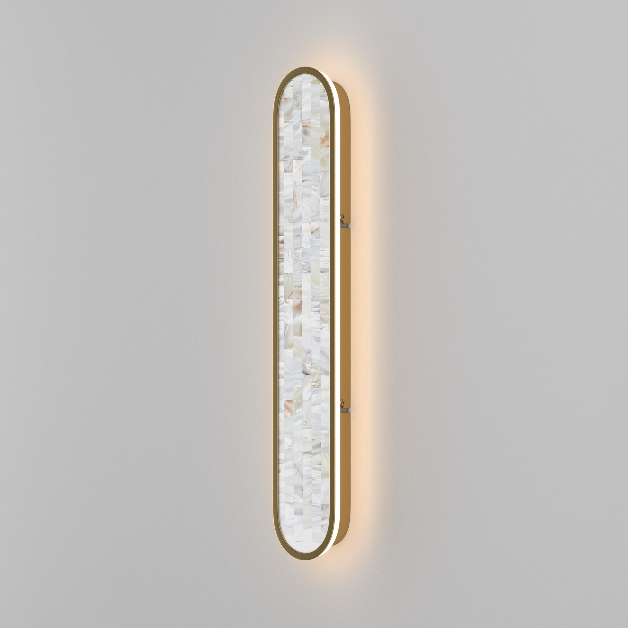 В серии представлены настенные светильники двух размеров и двух поколений. Декоративная мозаика из натурального перламутра играет нежнейшими бликами. Контраст текстур — переливы перламутра и матовая поверхность металла цвета латуни. LED-лента под акриловым рассеивателем создаёт ореол на стене. Предусмотрено трехступенчатое переключение температуры света через вкл-выкл (2700-3000-4000K), позволяющее создавать желаемую атмосферу. Эффектно светильники смотрятся и в комбинации друг с другом.