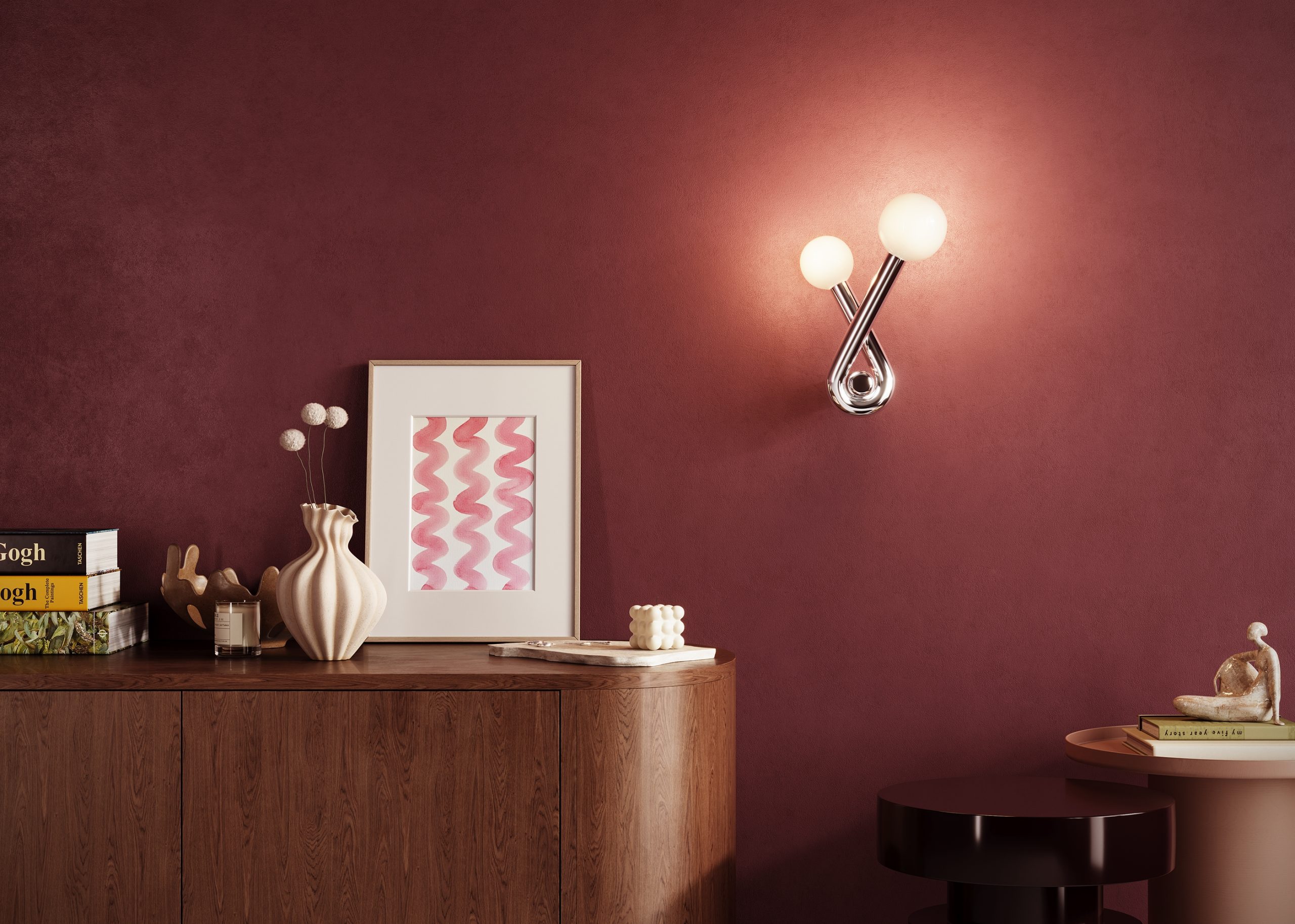 Серия отличается массивной металлической арматурой с органическими изгибами. Представлена в четырех цветовых вариантах: матовый черный, глянцевые латунь, платина и молочно-бежевый. Плафон выполнен из глянцевого белого стекла, скрывающего сменный источник света с цоколем G9. Светильники создают выразительные акценты в интерьере, подходят как для одиночного размещения, так и для создания сложных инсталляций. Рекомендуется для пространств, где важную роль играет художественная составляющая.