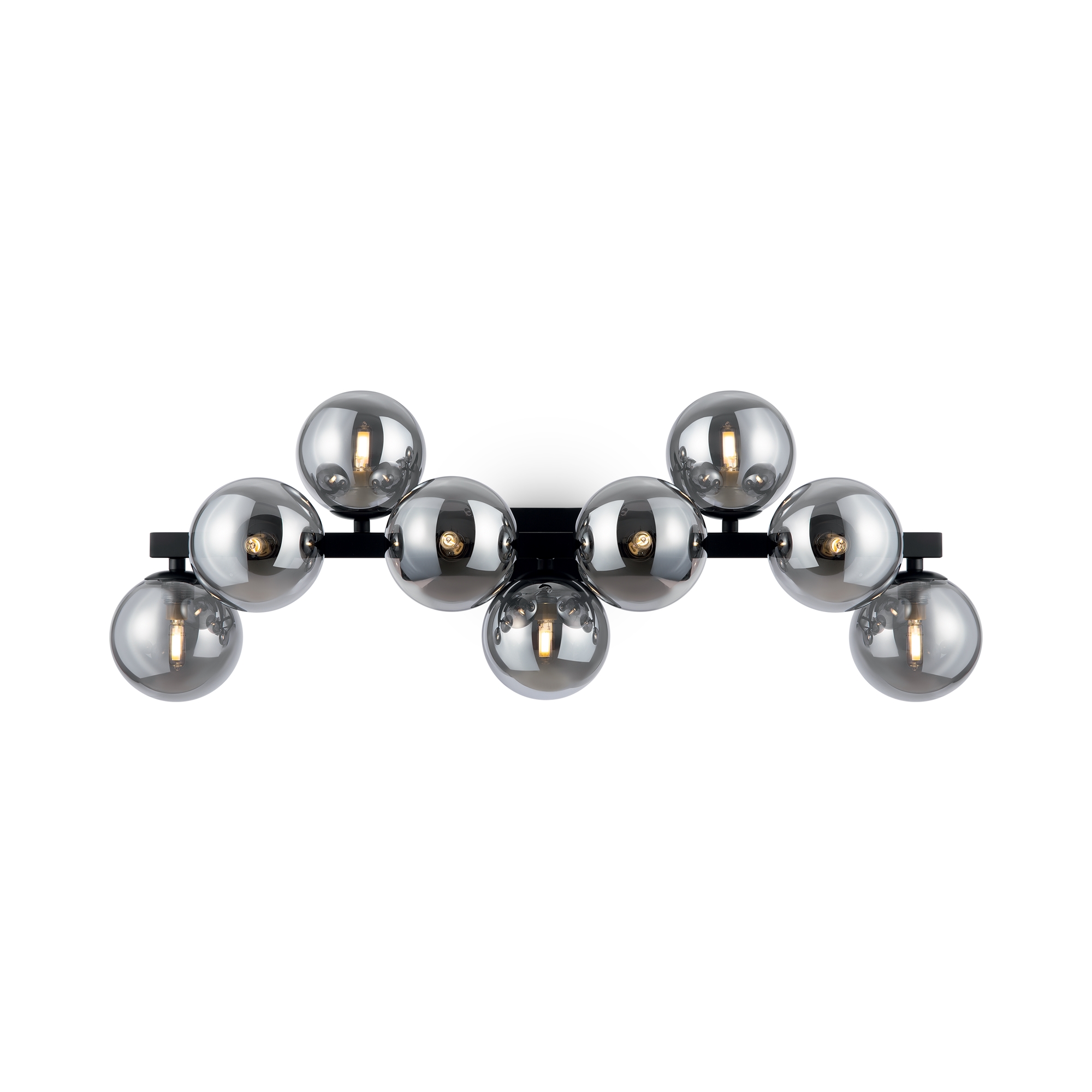 Металлическая арматура в четырех цветах: матовый черный, хром, золото, латунь. Плафоны — выдувное стекло. Цвета — дымчатый, янтарный, коньячный. Дизайн с имитацией молекулярной структуры. Высота подвесных светильников регулируется тросом. Лампа с цоколем G9.