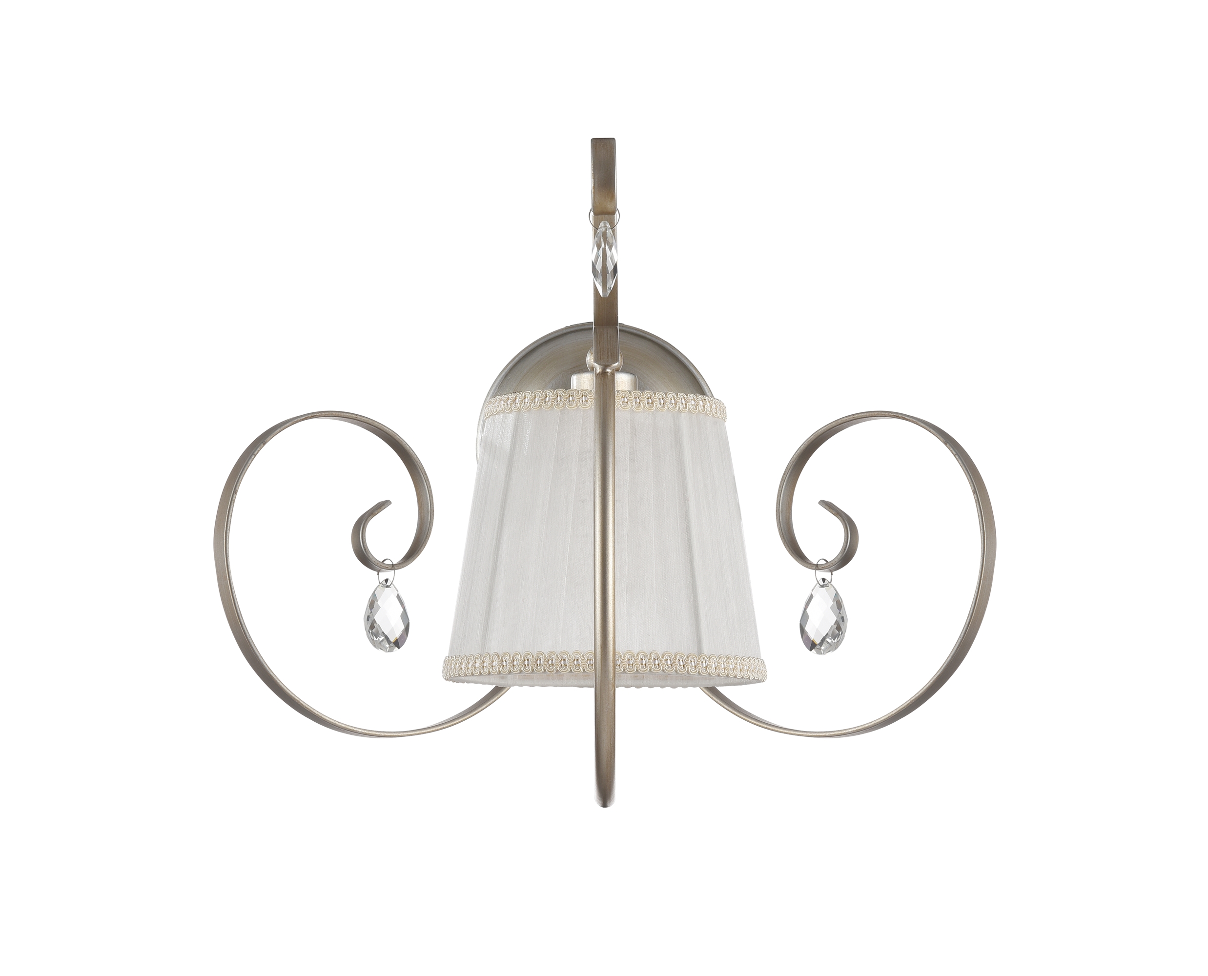 Абажуры и арматура светильников выполнены в разных цветах, с несколькими видами арматуры. Основание люстры украшено стеклянным декоративным элементом, а завитки рожков украшают подвески.