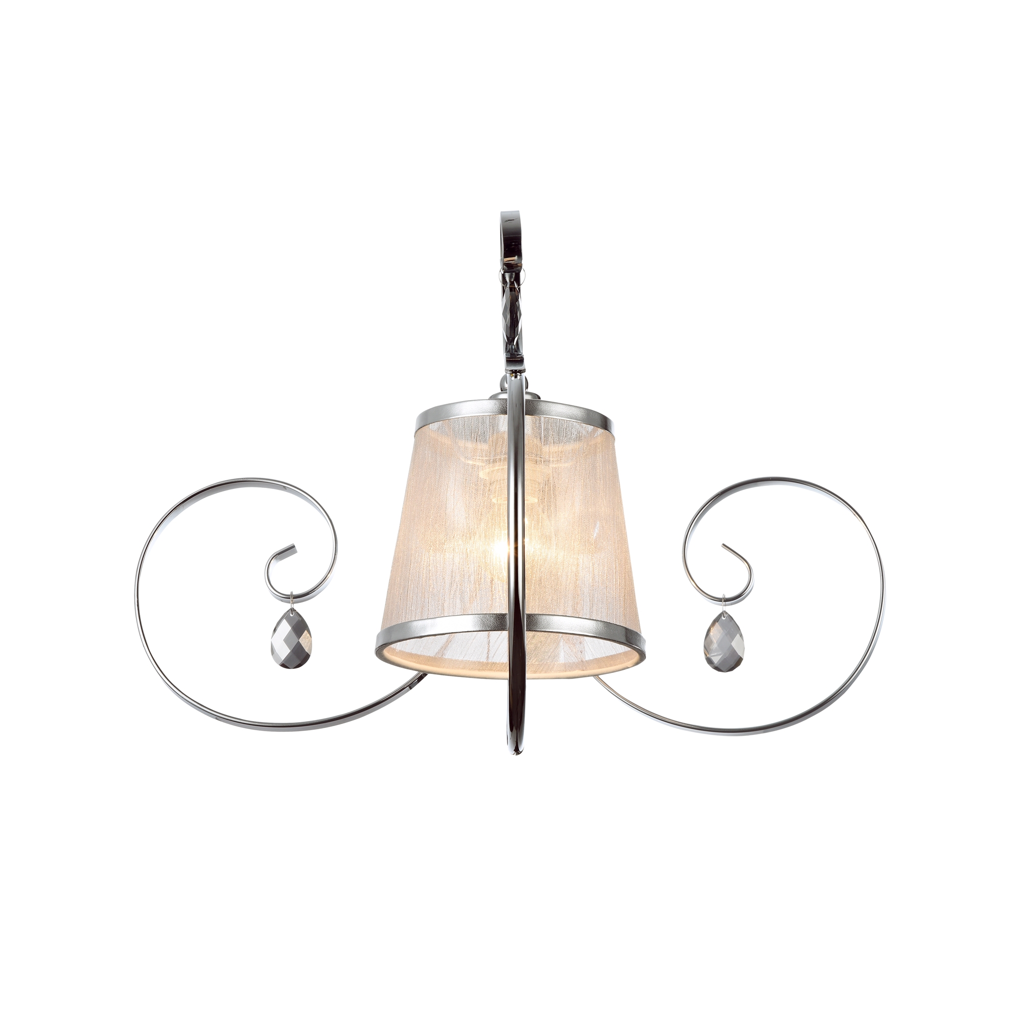 Абажуры и арматура светильников выполнены в разных цветах, с несколькими видами арматуры. Основание люстры украшено стеклянным декоративным элементом, а завитки рожков украшают подвески.