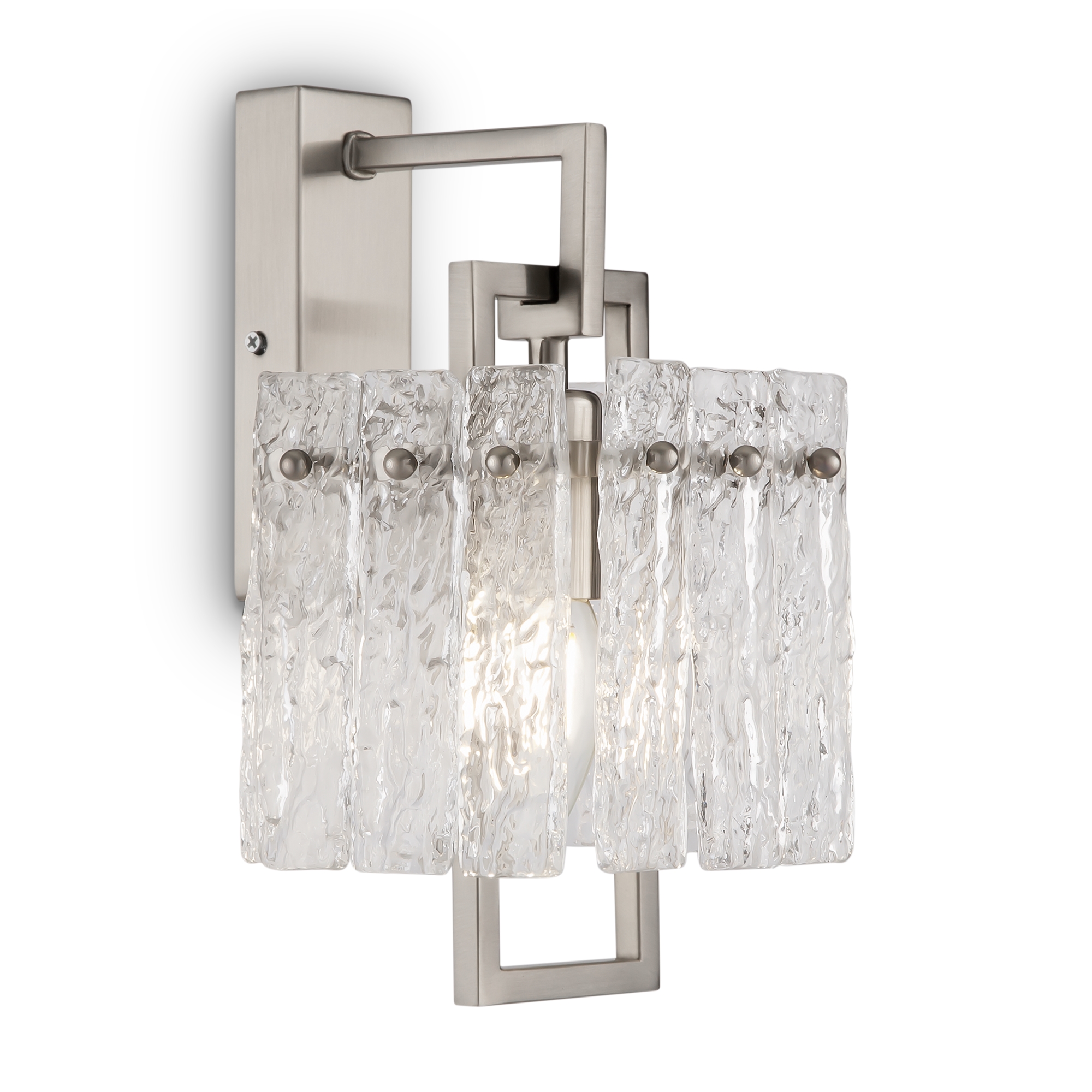 Металлическая арматура. Оттенки – латунь, никель. Декор – фактурные прямоугольные пластины. Материал декора – стекло. Подвесные светильники можно размещать на ножке и устанавливать как потолочный свет. Источник света – лампа с цоколем Е14.