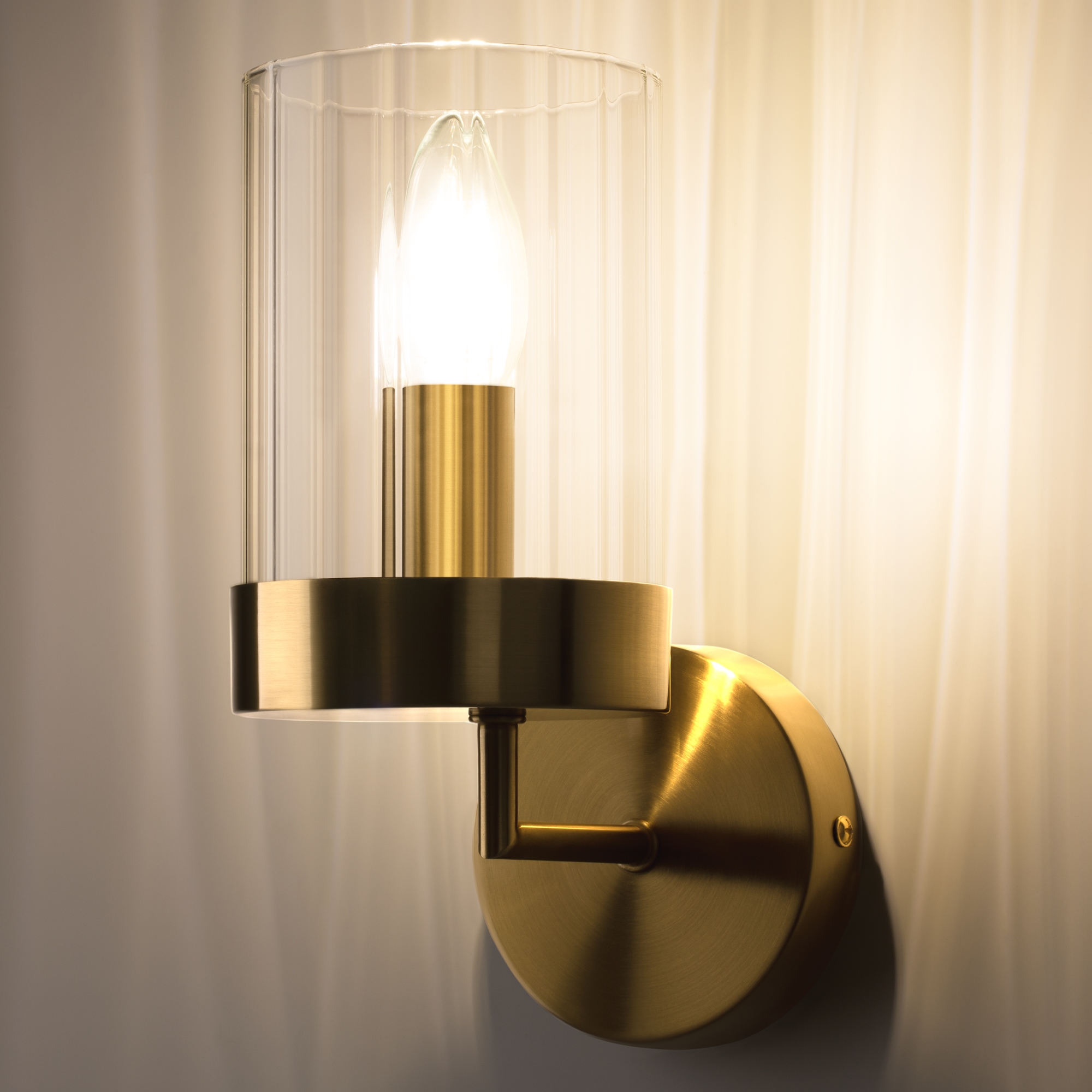 Арматура металл. Цвет арматуры латунь. Плафоны из рельефного стекла в форме цилиндра направлены вверх. Потолочные светильники подойдут для помещений с низкими потолками. Источник света лампа. Цоколь E14.