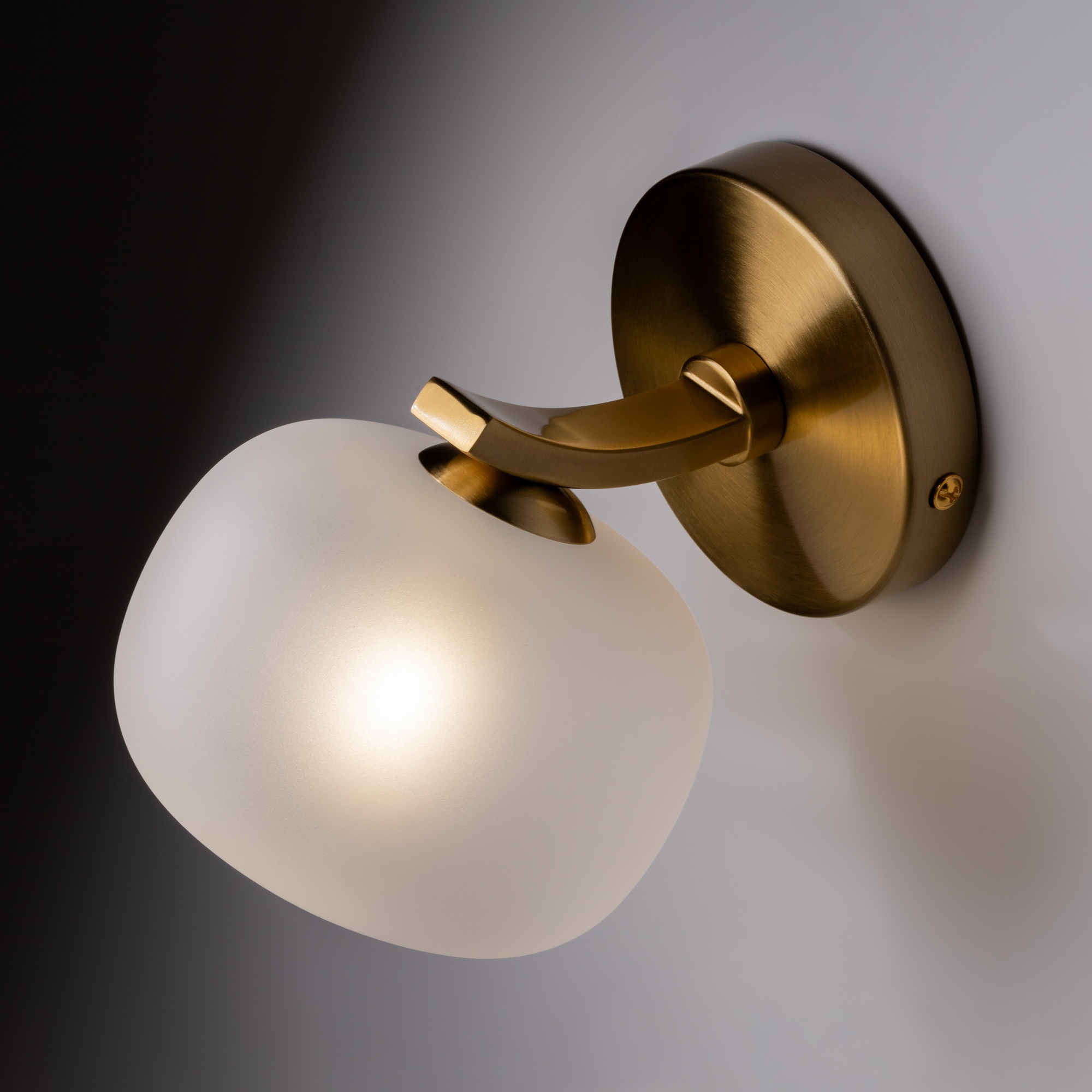 Арматура — металл. Цвет арматуры — латунь. Серия с необычной формой плафонов — немного приплюснутые, матовые белые. Настольные лампы и настенные бра выгнутой формы. Источник света лампа. Цоколь G9.