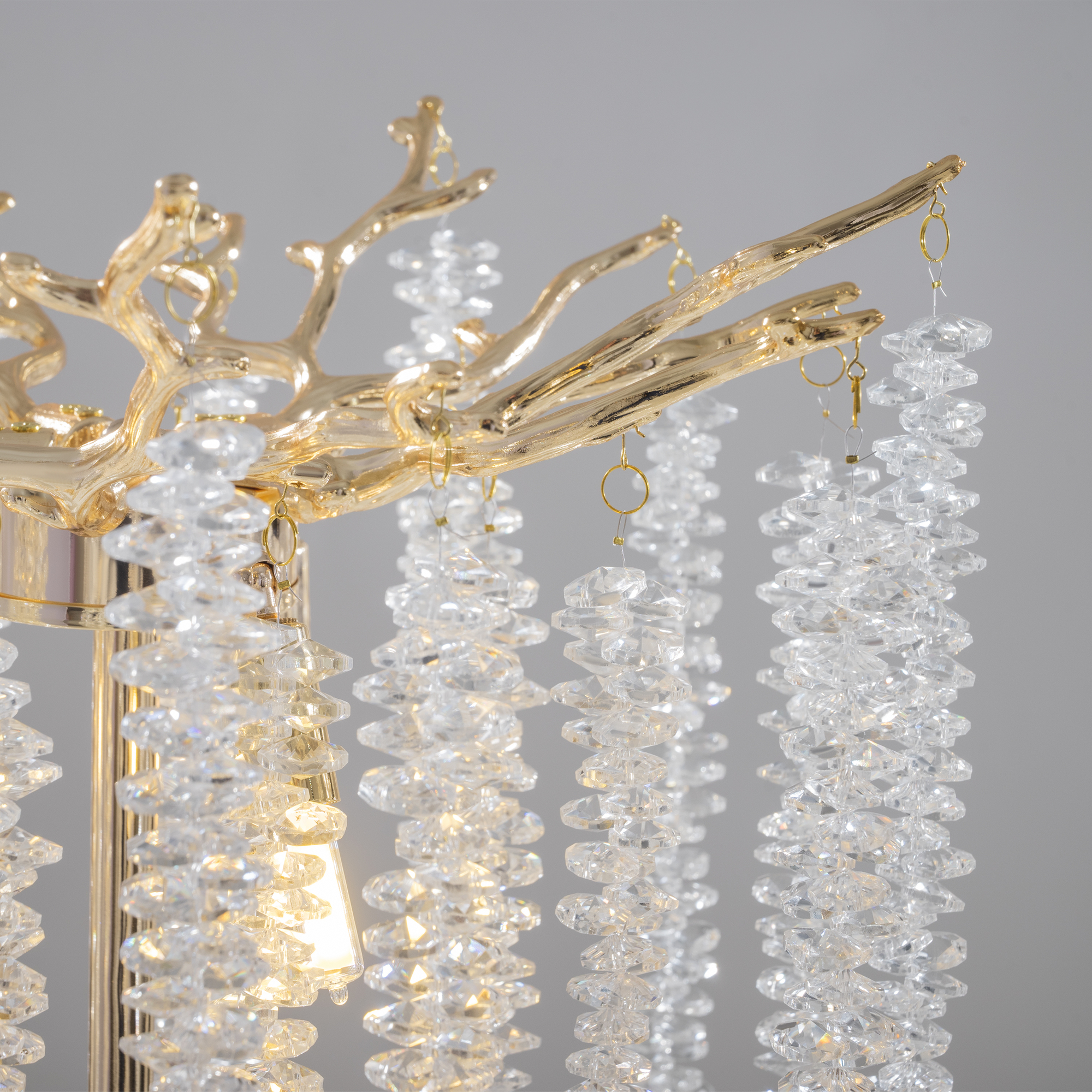 Материалы арматуры —металл, цвет — золото. Хрустальные декоративные элементы напоминают капельки — создают глубокие переливы света. Дизайн в трендовой растительной тематике. Источник света — лампа с цоколем G9 и с поворотной функцией.