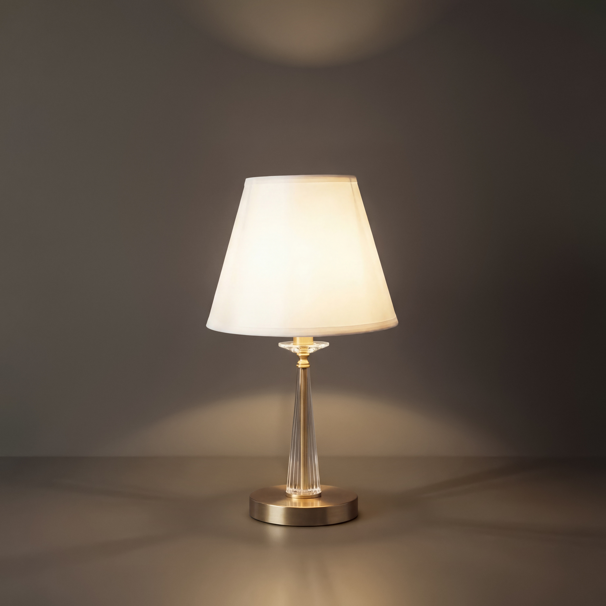 Металлическая арматура в двух оттенках на выбор: латунь и никель. Абажуры – текстиль белого цвета. Декоративные элементы из прозрачного стекла. Источник света – лампа с цоколем E14.