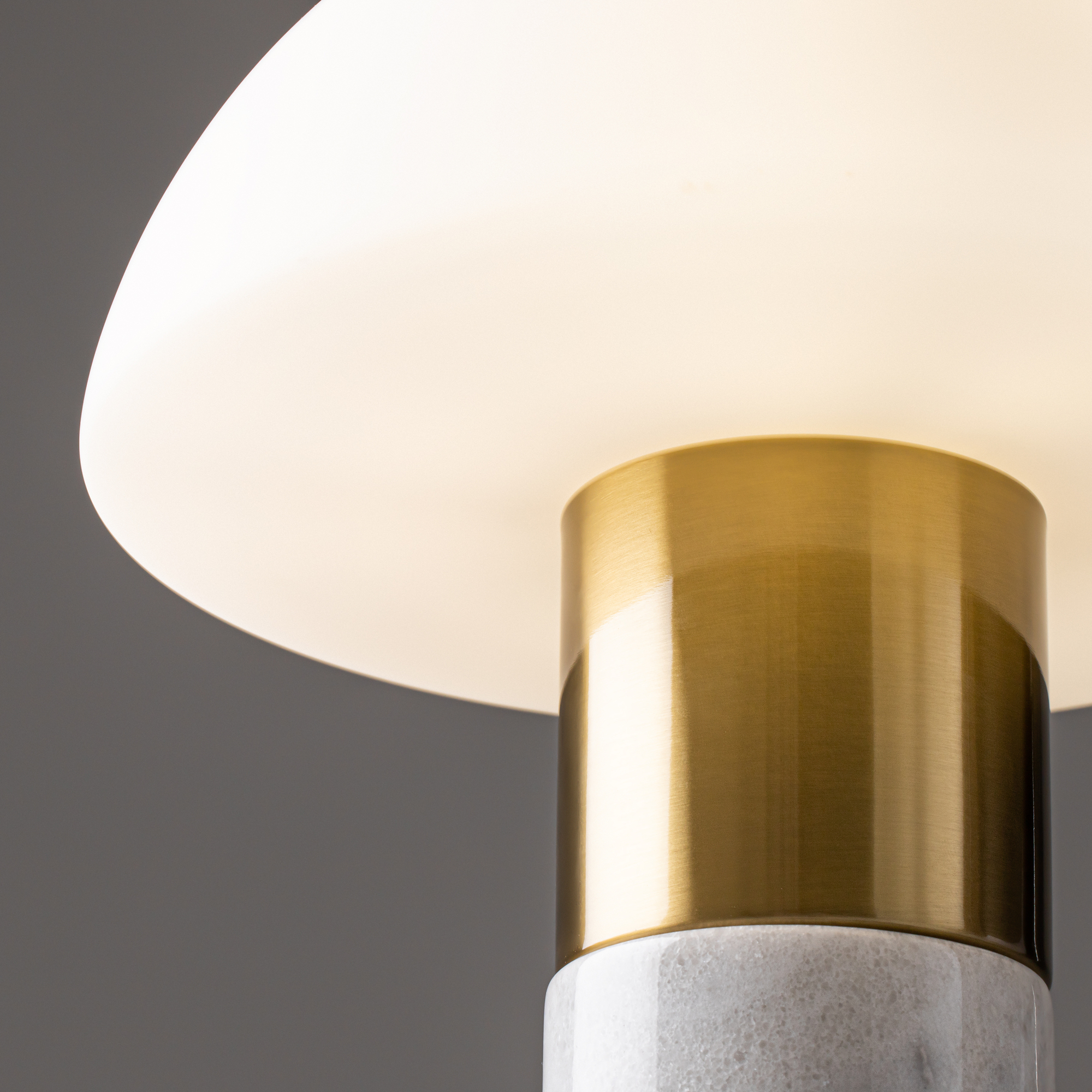 Материал арматуры — метал, цвет — латунь. Основание — белый мрамор с серым рисунком. Плафон из глянцевого стекла в форме полушара. Источник света — лампа с цоколем E14