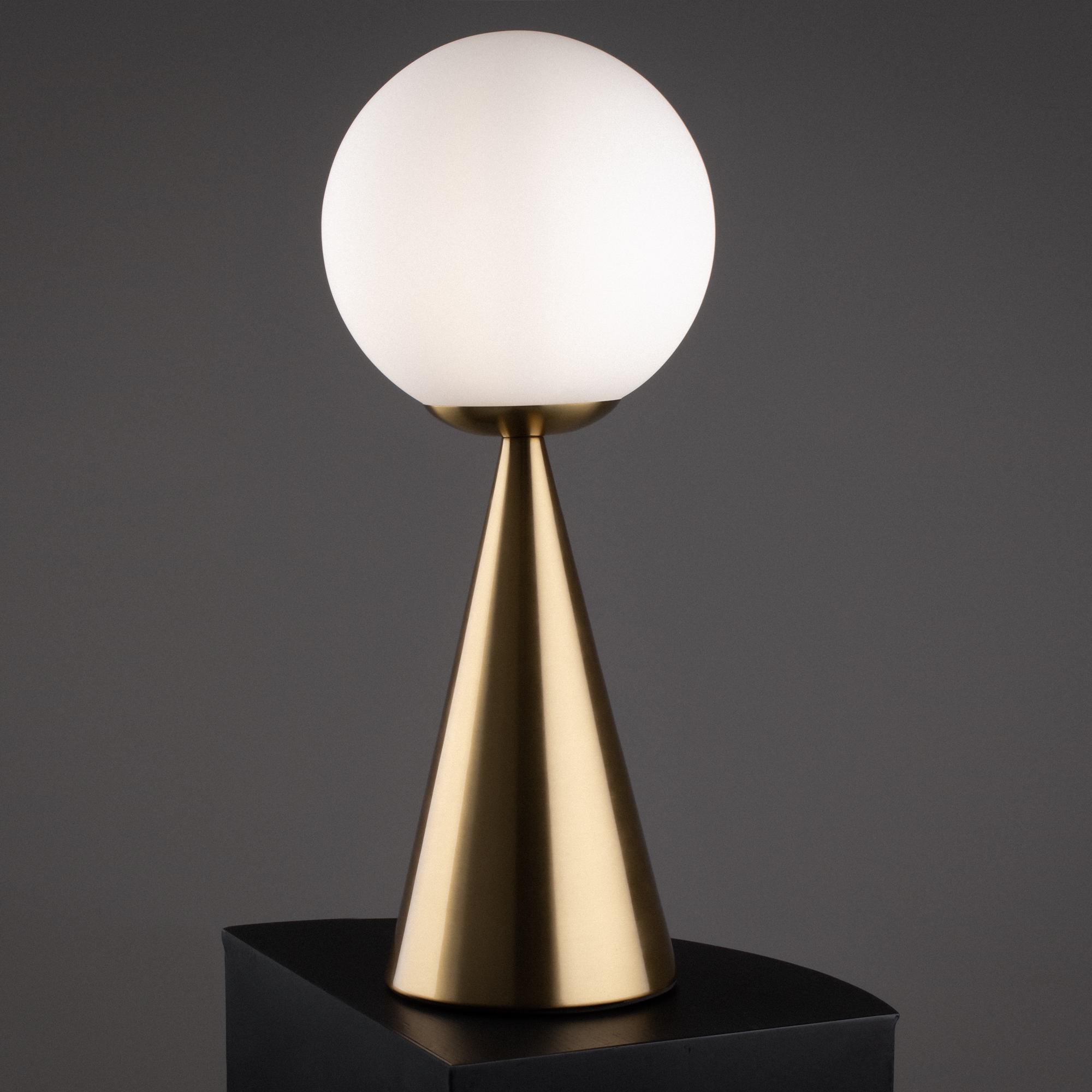 Материал арматуры — металл, цвета — латунь, черный. Плафон-сфера из белого матового цвета. Функция Touch позволяет включать и выключать свет. Источник света — лампа с цоколем Е14.