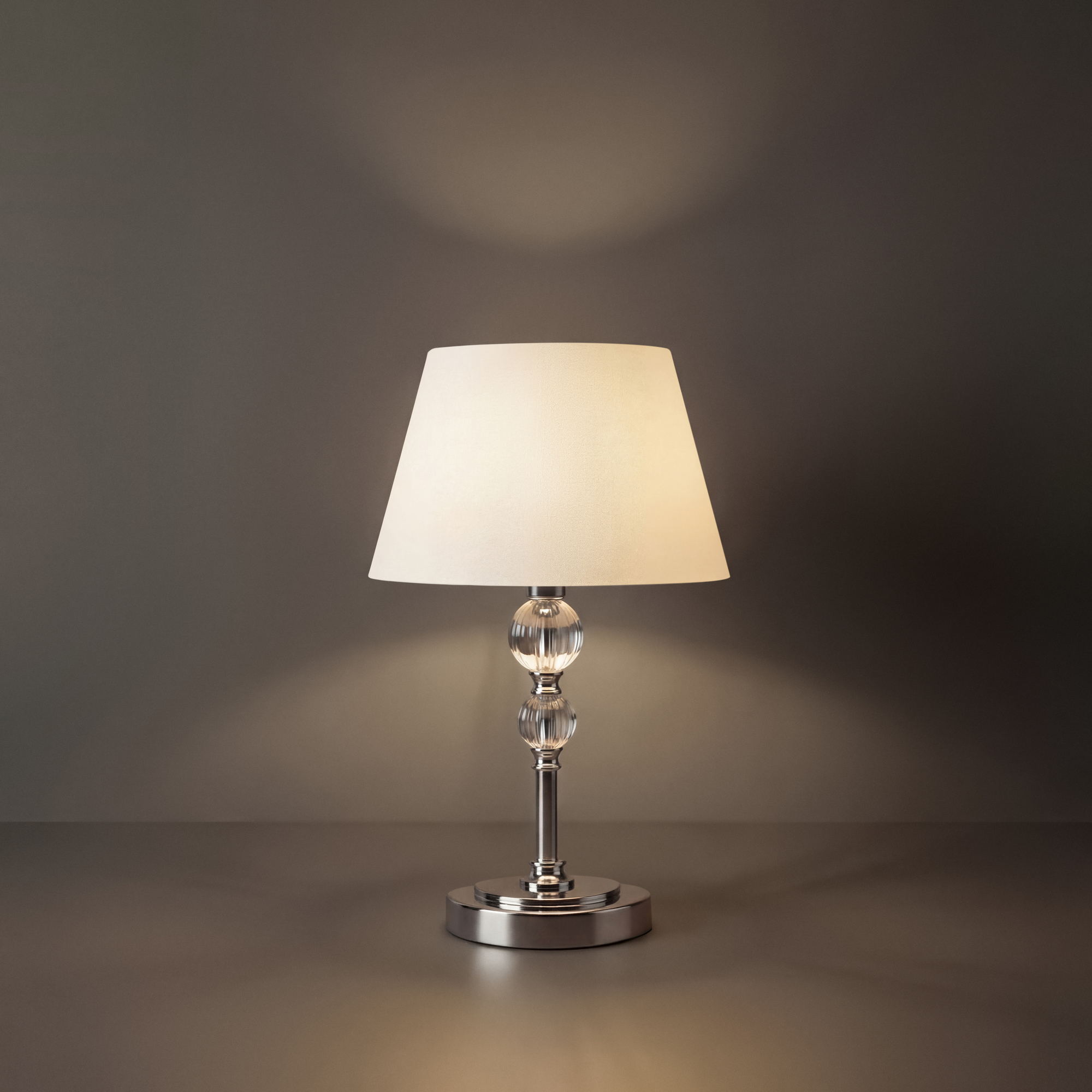 Серия светильников для интерьеров гостиных, спален и офисов в современном стиле. Арматура из метала цвета “никель” дополнена декоративными элементами из прозрачного акрила (шарики). Белые абажуры из текстиля на ПВХ.