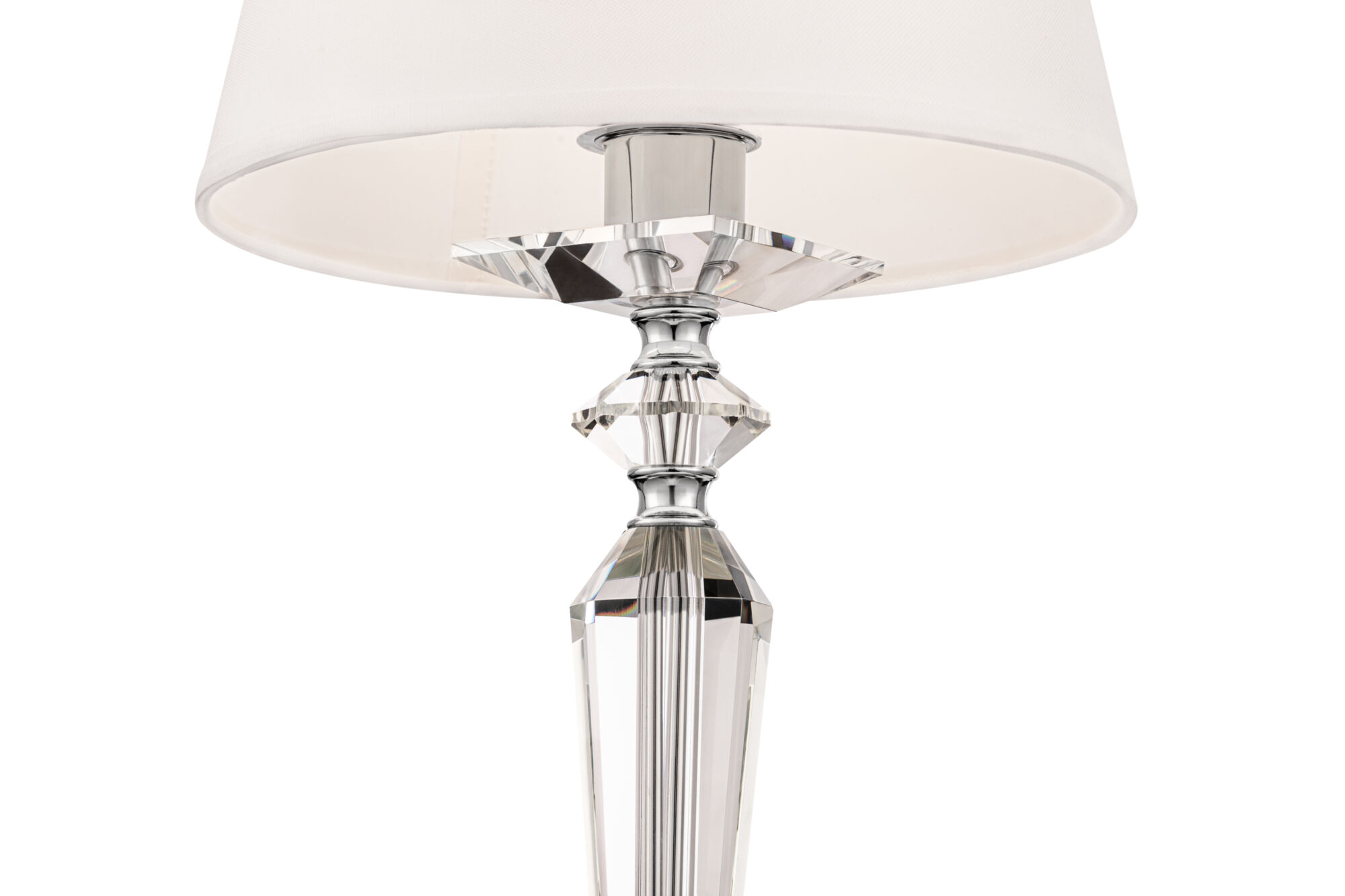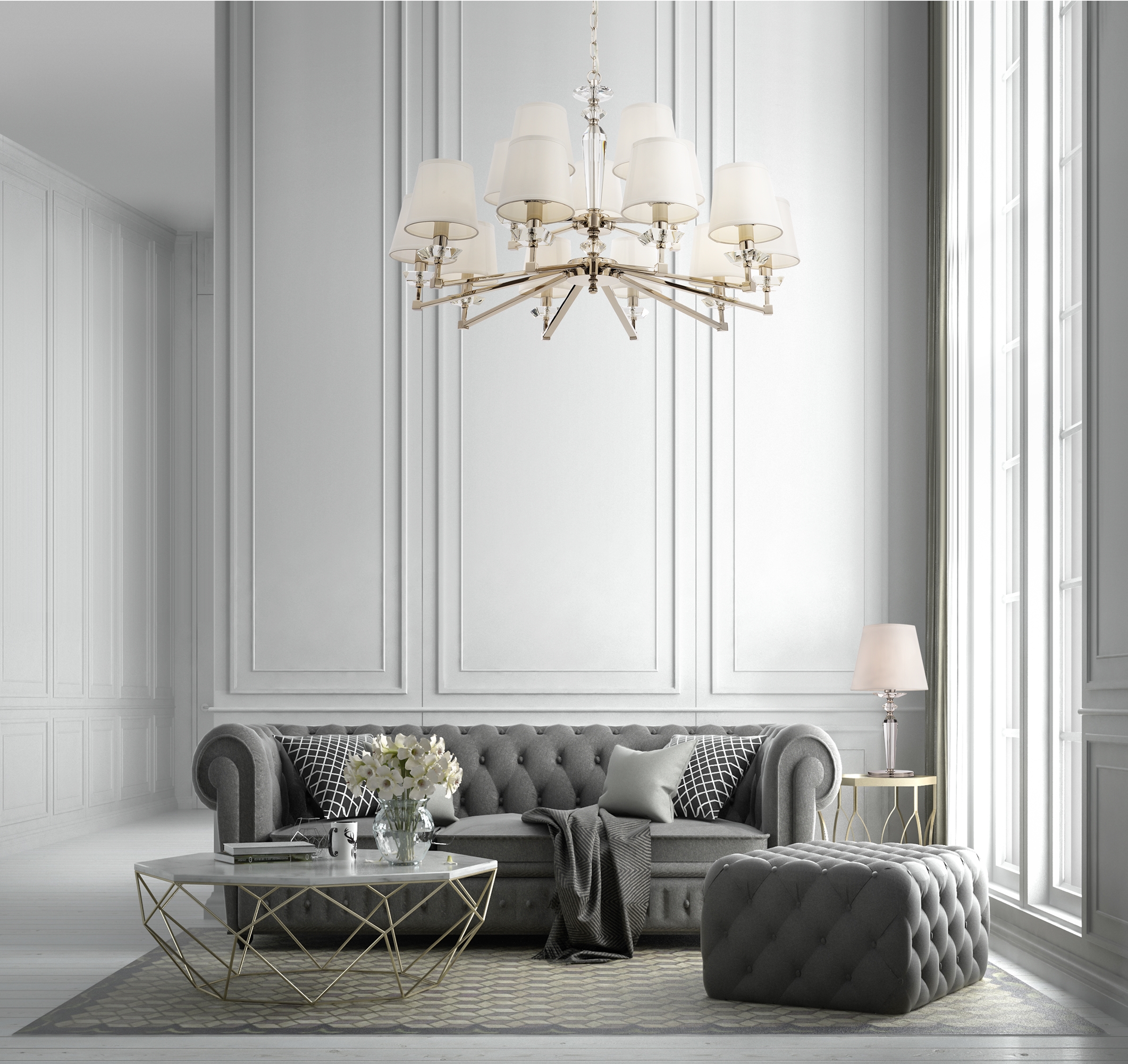 Металлическая арматура с гальваническим покрытием цвета никель. Абажуры из льна, нанесенного на ПВХ. Цвет абажуров – белый. Декор центральной части и рожков – прозрачное стекло. Высота люстр регулируется.