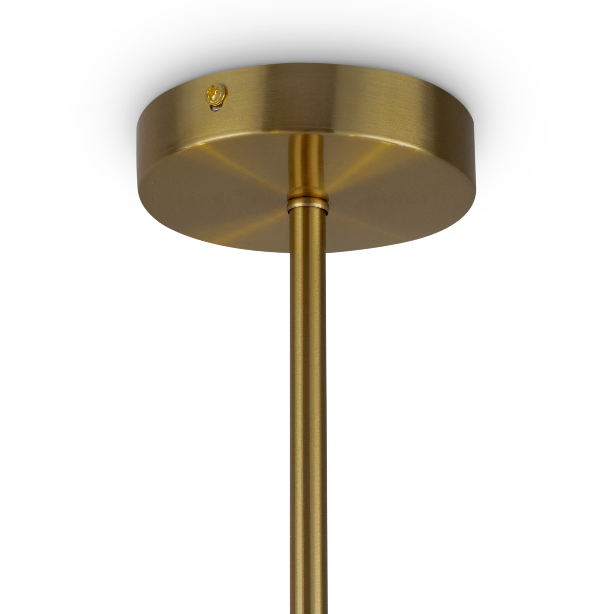 Металлическая арматура, цвет — латунь. Керамические декоративные элементы. Матовые белые абажуры. Силуэт светильника вытягивает интерьер. Источник света — лампа. Цоколь E14.