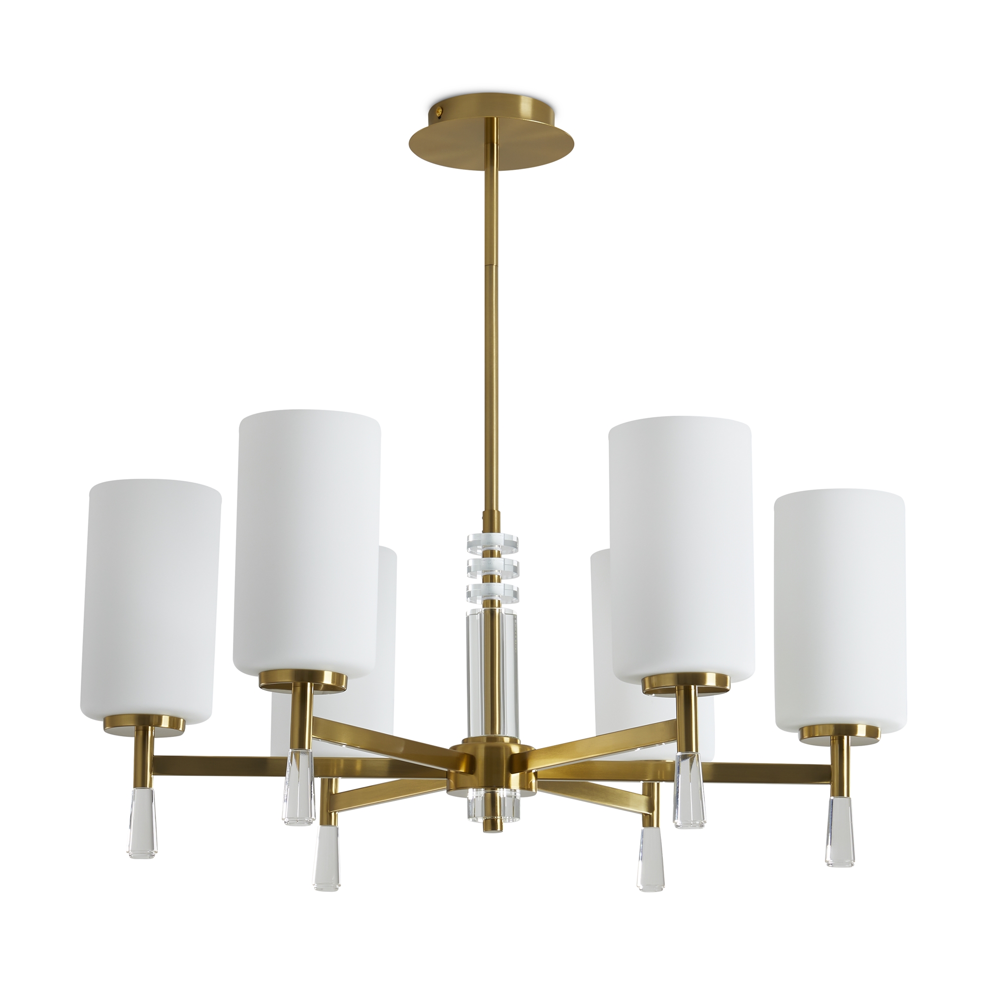 Металлическая арматура: латунь или никель (новинка серии).Белые стеклянные плафоны цилиндрической формы, направленные вверх.. Хрустальное основание с акриловыми каплями. Лампа E27.