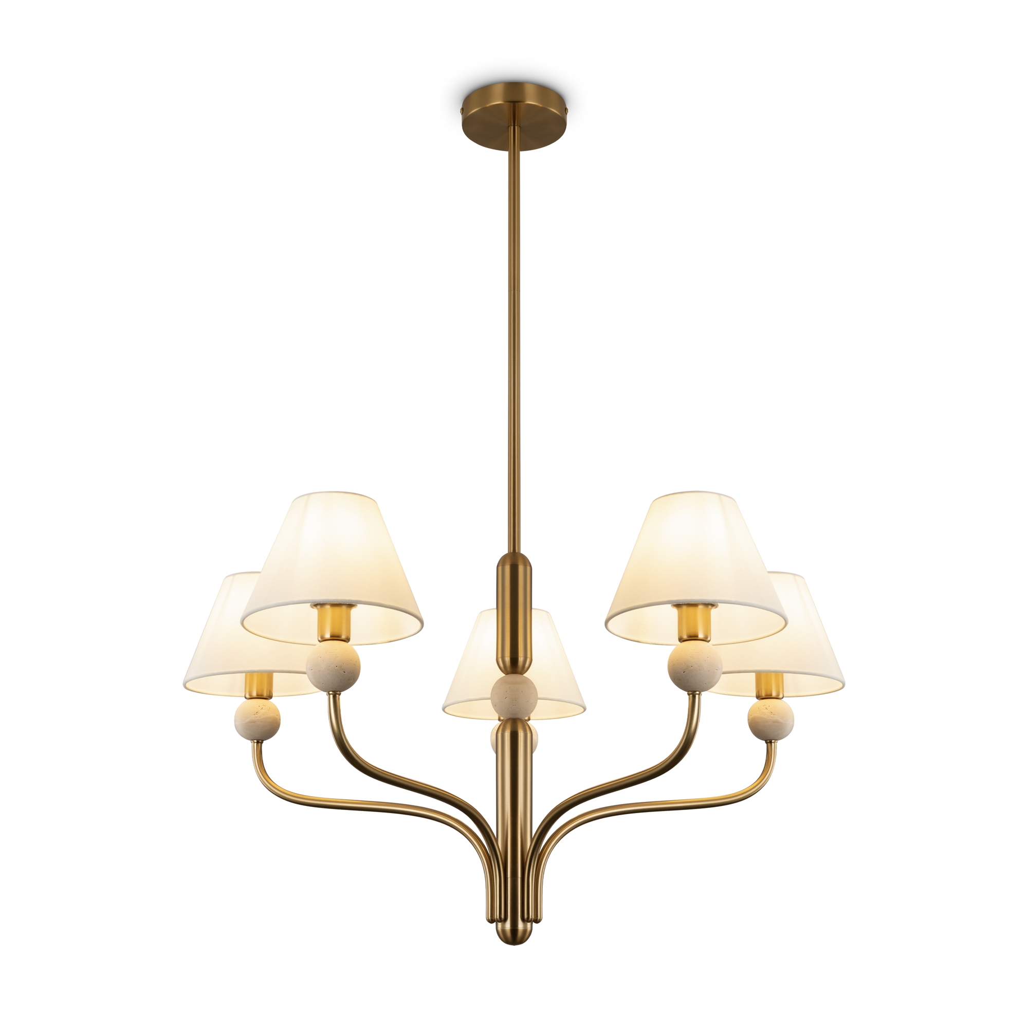 Арматура — металл в цвете латунь. Тканевые абажуры, травертиновые элементы. Лампы E14 (в комплекте). Серия состоит из люстры c 5 плафонами и бра. Трендовое сочетание в классическом стиле.