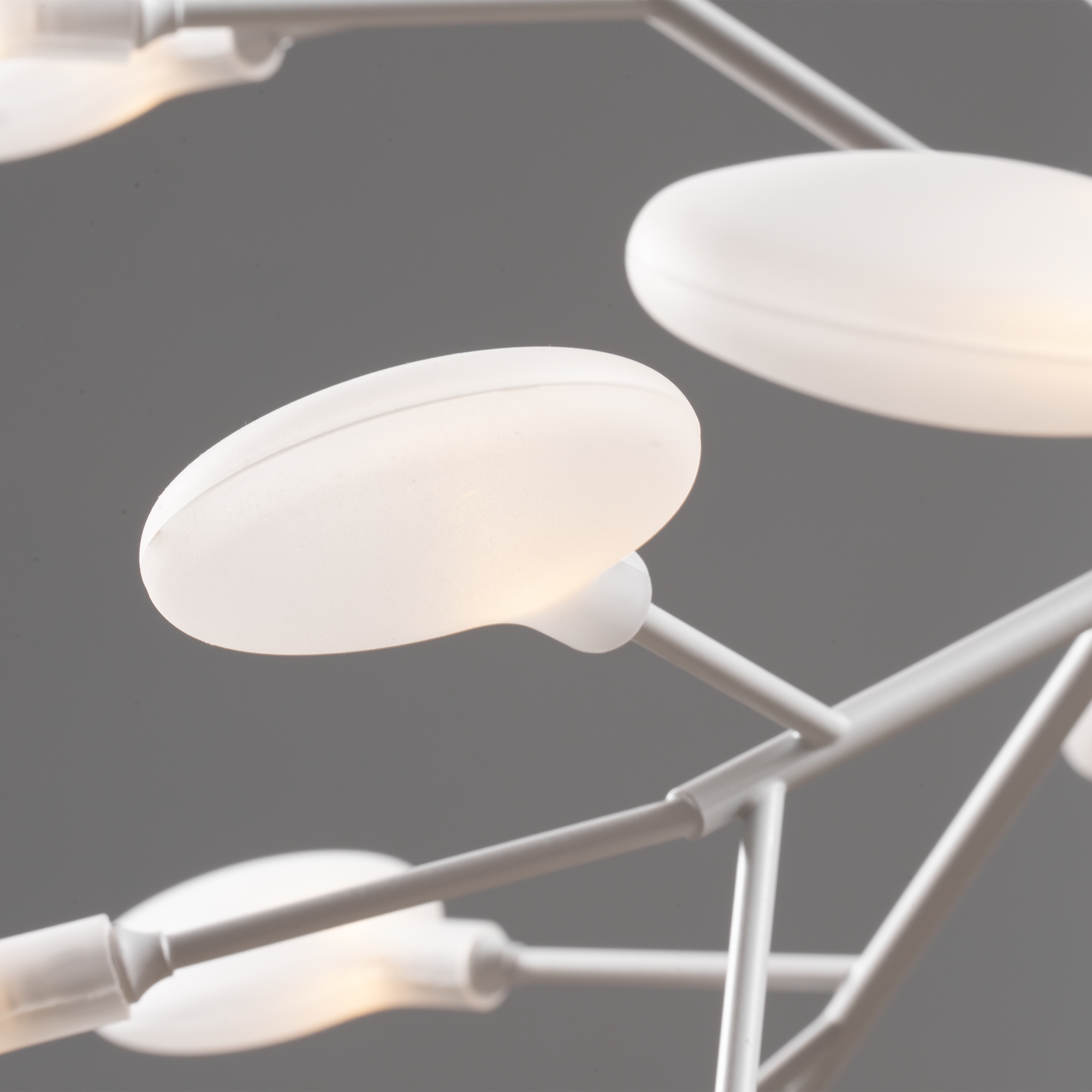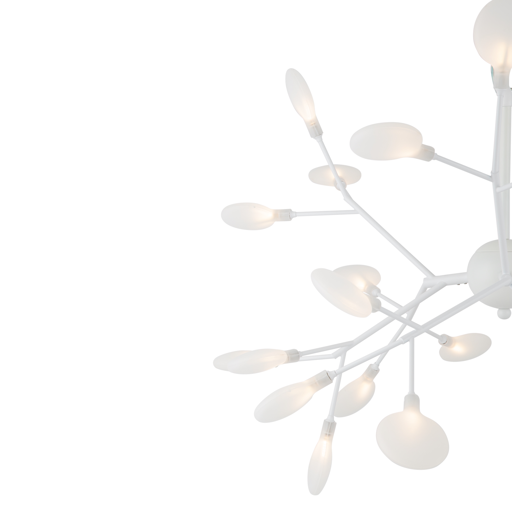 Материал арматуры – металл. Оттенки – черный, белый. Стеклянные плафоны оригинальной формы. Трендовый флористический дизайн. Источник света – лампа G4.